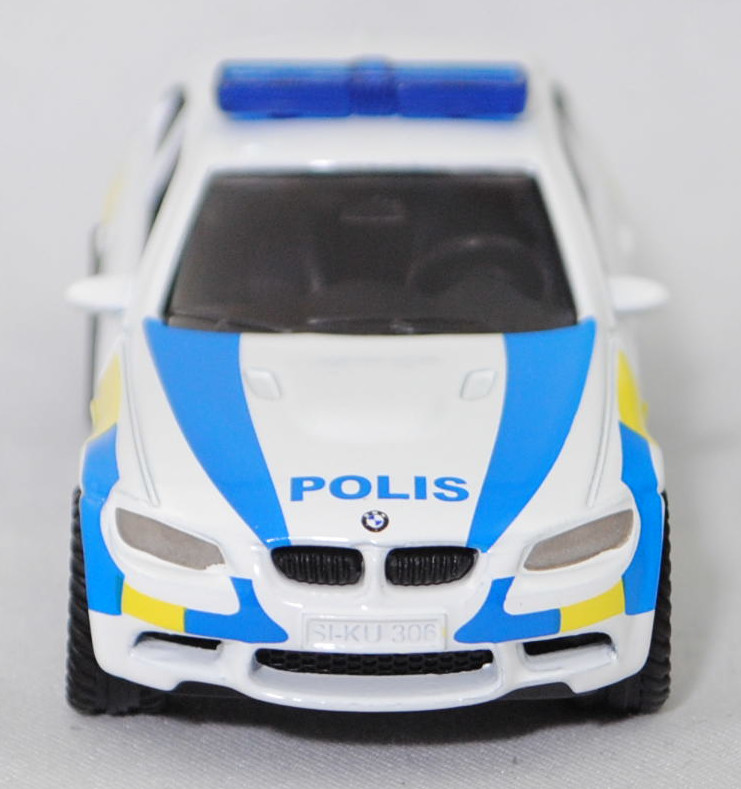 03000 S BMW M3 Coupé (4. Generation M3, E92, Facelift 2010, Modell 2010-2013) Swedish Police, reinweiß, POLIS, integrierte Frontscheinwerfer, SIKU SUPER, 1:58, P29f