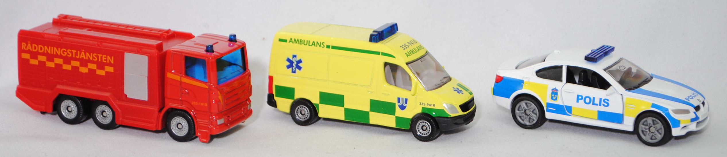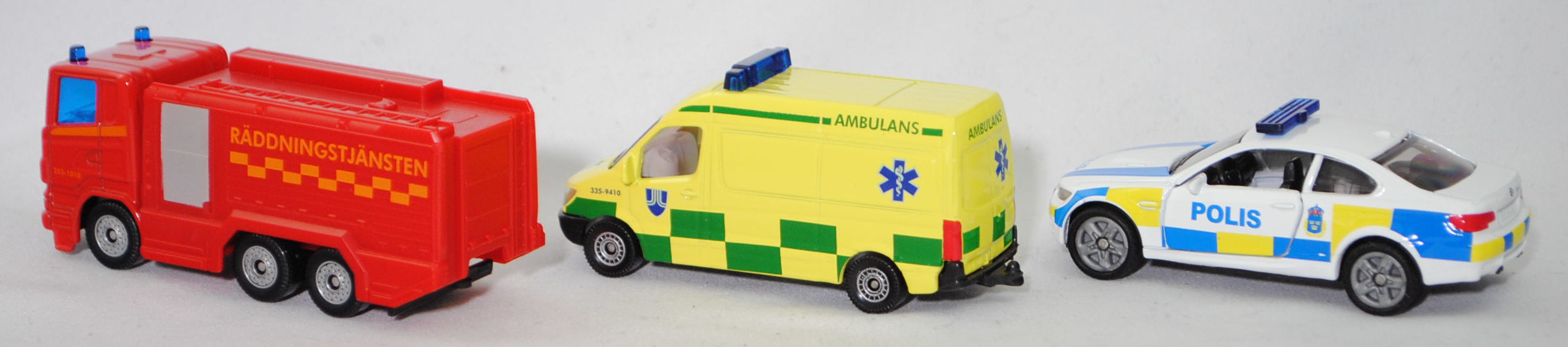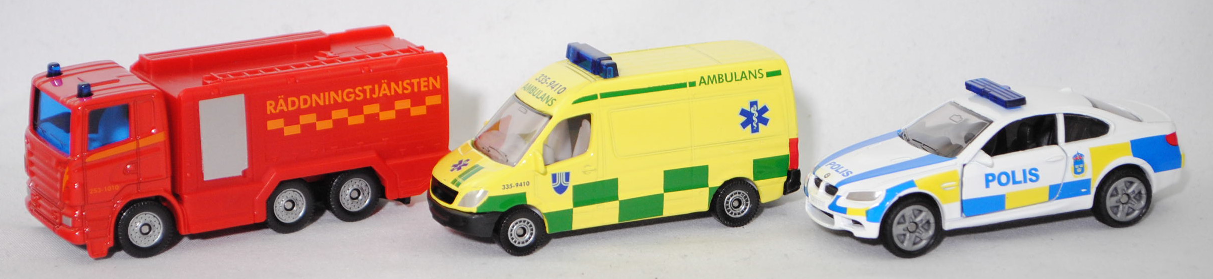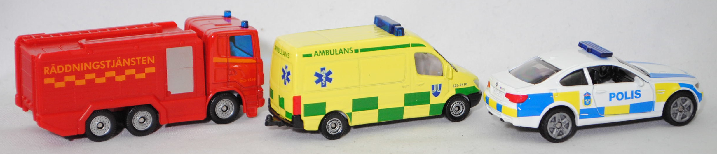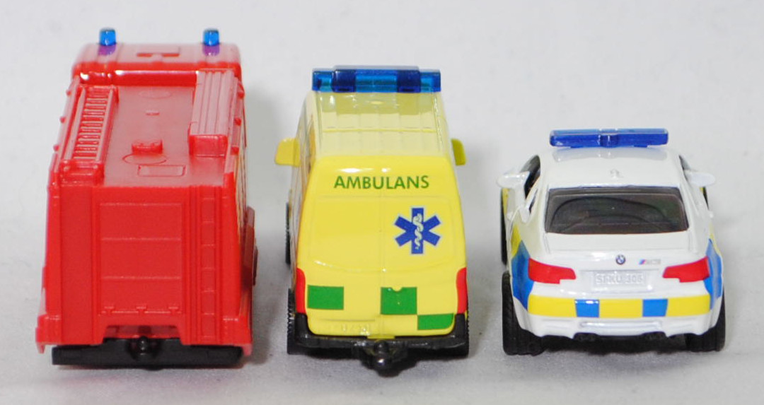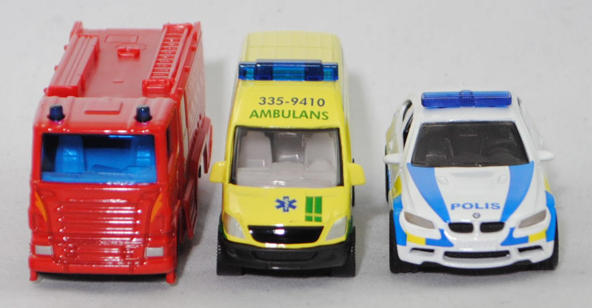 03001 S Schwedisches Emergency Set bestehend aus: Scania R380 (Scania Serie 5 bzw. PRT-Serie, 1. Generation R-Serie, Baureihe R für hoch montierte Frontlenker-Fahrerhäuser, Typ CR16, Day cab, mittellanges niedriges Frontlenker-Fahrerhaus (für niedriges Gewicht und hohes Ladevolumen), Kühlergrill mit 6 Lüftungsschlitzen, Motor: Scania Typ DC 12 18 380 (Euro 5) wassergekühlter Sechszylinder-Reihen-Viertakt-Diesel mit elektrisch und hydraulisch gesteuerter Pumpe-Düse-Einspritzung HPI) sowie Abgasturbolader (ATL) mit variabler Turbinen-Geometrie (VTG) und eine zentrale Nockenwelle sowie OHV-Ventilsteuerung (Overhead valve engine) und 4 Ventile pro Zylinder sowie Ladeluftkühler und 11716 cm³ sowie 380 PS, Modell 2007-2009) Tanklöschfahrzeug (Schwedische Feuerwehr), verkehrsrot/hell-verkehrsrot, innen reinweiß, Sitze reinweiß, Lenkrad integriert, Druck 253-1010 und Streifen in tieforange auf den Seiten des Fahrerhauses, Druck Streifen in tieforange rechts und links auf der Fahrerhausvorderseite, Druck RÄDDNINGSTJÄNSTEN und Streifen in goldgelb auf den Seiten des Aufbaues, Aufbau hell-verkehrsrot, Türen vom Aufbau weißaluminiummetallic bedruckt, 2 Blaulichter auf dem Dach des Fahrerhauses, unterer Teil des Kühlergrills mit zusätzlicher Prägung eines liegenden U-Bügels auf der linken Seite, Stoßfänger vorne durchgehend, Chassis geht bis an die Hinterkante des Stoßfängers, CE-Zeichen vor der Vorderachse von hinten aus lesbar, Bpr. mit Adresse, Druck Chargennummer auf dem Chassis, C36, ca. 1:89 + Mercedes-Benz Sprinter II (2. Generation, interne Baureihenbezeichnung NCV 3 (NCV = New Concept Van), Baureihe Sprinter W 906, Typ Standard L2H2 mit mittlerem Radstand und Hochdach, Vor-MoPf (vor Modellpflege, Vorfacelift), Kühlergrill mit 2 waagerechten Lamellen, untere Kühlergrillverkleidung bis unter die Frontscheinwerfer verbreitert, Stoßfänger vorne in einer Höhe zum Radkasten geführt, Stoßfänger vorne mittig in Form eines offenen Mundes mit Ausbuchtungen für die Nebelscheinwerfer, Hinterradantrieb, Motor: Mercedes-Benz OM 646 DE 22 LA wassergekühlter Vierzylinder-Reihen-Viertakt-Diesel mit Bosch Common-Rail-Direkteinspritzung und Abgasturbolader mit variabler Turbinen-Geometrie (VTG) sowie zwei obenliegende Nockenwellen (DOHC = Double Overhead Camshaft) und 4 Ventilen pro Zylinder sowie Ladeluftkühler und 2148 cm³ sowie 129 PS, Baumuster Motor 646.986, Radstand 3665 mm, Laderaumlänge 3265 mm, Gesamtlänge 5910 mm, Modell 2006-2009) 213 CDI / 313 CDI Kastenwagen Krankenwagen (Schwedische Ambulanz), schwefelgelb, innen reinweiß, Sitze reinweiß, Lenkrad integriert, Druck AMBULANS / 335-9410 in hell-smaragdgrün/saphirblau und ultramarinblau/reinweißer Äskulap Stab sowie Grafschaft Stockholm Logo in ultramarinblau/reinweiß und hell-smaragdgrüne Karos auf den Seiten, Druck ultramarinblau/reinweißer Äskulap Stab und AMBULANS in hell-smaragdgrün sowie hell-smaragdgrüner Streifen auf der Motorhaube, Druck 335-9410 / AMBULANS in saphirblau/hell-smaragdgrün vorne auf der Dachoberkante, Druck AMBULANS in hell-smaragdgrün und hell-ultramarinblau/reinweißer Äskulap Stab sowie hell-smaragdgrüne Karos hinten auf den Türen, ohne Mercedes-Benz-Stern im Kühlergrill, hohe unbedruckte Blaulichtleiste, C80 schwarz mit silbernem Druck (Mercedes-Benz Stahlscheibenräder im 18-Loch-Design Größe 5,5 J x 16 H2 ET 51 mit Lochkreis 6 x 130 (Teilenummer A 001 401 35 02 9206, Farbcode silber) und Nabenkappe / Radschraubenabdeckung (Teilenummer A 906 401 00 25, Farbcode 9B51 anthrazit) sowie Reifen LT 205/75 R 16 110/108R 6PR), ca. 1:77 + BMW M3 Coupé (4. Generation M3, Baureihe M3 Coupé, interne Baureihenbezeichnung E92, zweitüriges Coupé mit 4 Sitzplätzen, Facelift 2010 (bei BMW LCI = Lifecycle Impulse genannt), Stoßfänger vorne um 29 mm verlängert, Verbreiterung des Seitenschwellers im unteren Bereich, Blinker hinten oben unter rotem Glas angeordnet, kleiner schmale Rückfahrscheinwerfer unten angeordnet, Ausstattungslinie M3 Coupé: Leichtbaudach aus Carbon (CFK) + Polsterung Stoff-/Lederkombination Speed mit geprägtem M Emblem in den Kopfstützen vorne + Fondsitzlehne umklappbar + Komforteinstieg zu den Fondsitzen durch Easy-Entry-Funktion für Fahrer- und Beifahrersitz + Gurtbringer vorne elektrisch + Graukeil-Frontscheibe, 6-Gang-Schaltgetriebe, Hinterradantrieb, Motor BMW Typ S65B40 wassergekühlter Achtzylinder-V-Viertakt-Otto mit Multi-Point-Einspritzung und zwei obenliegende Nockenwellen (DOHC = Double Overhead Camshaft) je Zylinderbank sowie 4 Ventile pro Zylinder und 3999 cm³ sowie 420 PS, Radstand 2761 mm, Länge 4615 mm, Modell 2010-2013) Swedish Police, reinweiß, innen schwarz, Sitze schwarz, Lenkrad schwarz, Druck POLIS in hell-verkehrsblau und Wappen der schwedischen Polizei in hell-verkehrsblau/schwefelgelb/dunkel-verkehrsrot sowie hell-verkehrsblau/schwefelgelbe Karos auf den Seiten, Druck POLIS und 2 Streifen in hell-verkehrsblau auf der Motorhaube, Druck hell-verkehrsblau/schwefelgelbe Streifen auf den Stoßfängern vorne und hinten, flache Blaulichtleiste auf dem Dach, integrierte Frontscheinwerfer silber bedruckt, integrierte Heckleuchten rot bedruckt, Druck BMW-Logo in reinweiß/schwarz/ultramarinblau auf der Motorhaube, Druck BMW-Logo in reinweiß/schwarz/ultramarinblau und M3 in silber auf dem Kofferraumdeckel, Heckstoßstange geschlossen, B47 geschlossen silbergrau (BMW Leichtmetallräder Typ Doppelspeiche 219 M vorne Größe 8,5 J x 18 ET 29 mit Lochkreis 5 x 120 (Teilenummer 3610 2284050, Farbcode reflexsilber) und Nabendeckel / Radzierkappe mit blau-weißem BMW-Logo und Chromrand (Ø 68 mm, Teilenummer 3613 6783536) sowie Mischbereifung 245/40 ZR 18 93Y bzw. hinten Größe 9,5 J x 18 ET 23 mit Lochkreis 5 x 120 (Teilenummer 3610 2284051, Farbcode reflexsilber) und Nabendeckel / Radzierkappe mit blau-weißem BMW-Logo und Chromrand (Ø 68 mm, Teilenummer 3613 6783536) sowie Mischbereifung 265/40 ZR 18 97Y), ca. 1:58, SIKU SUPER, P29f (
