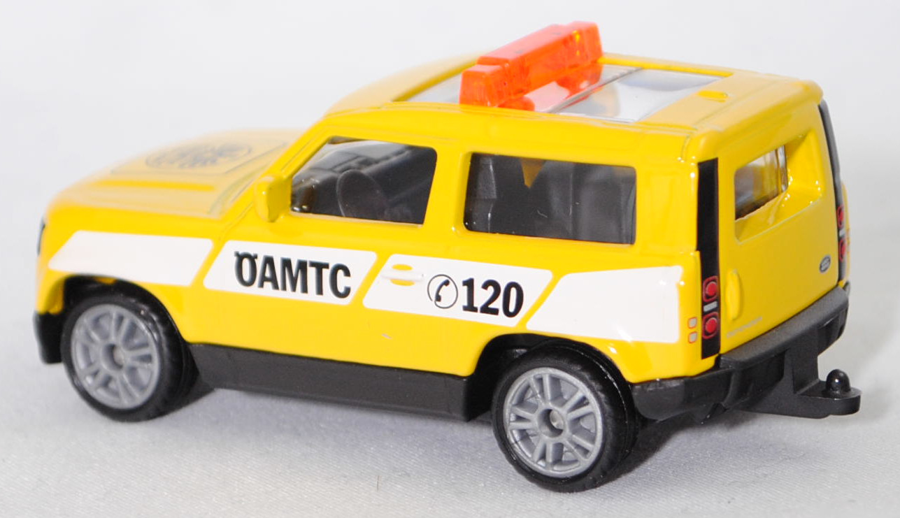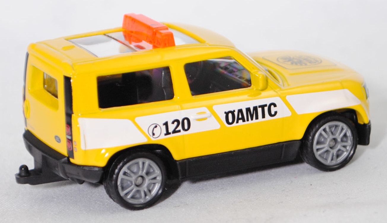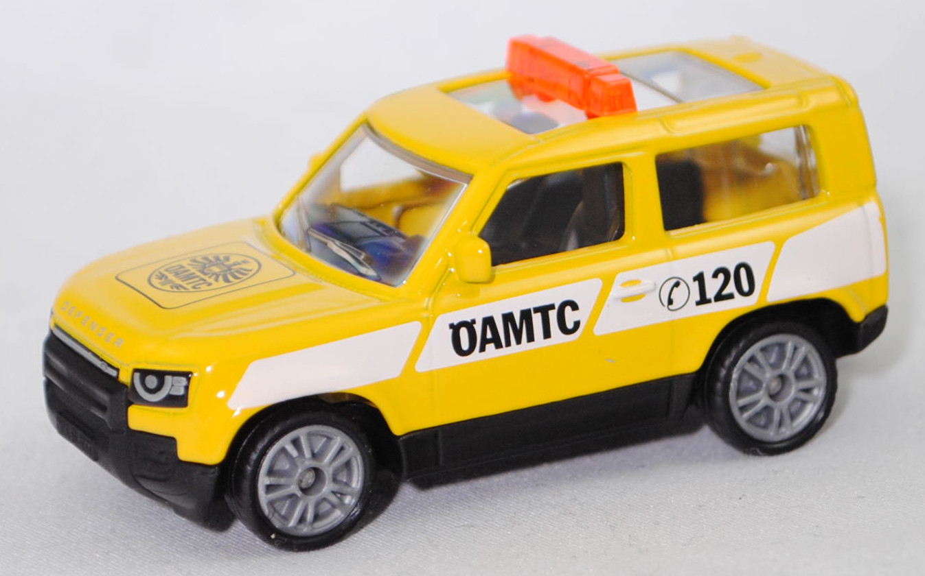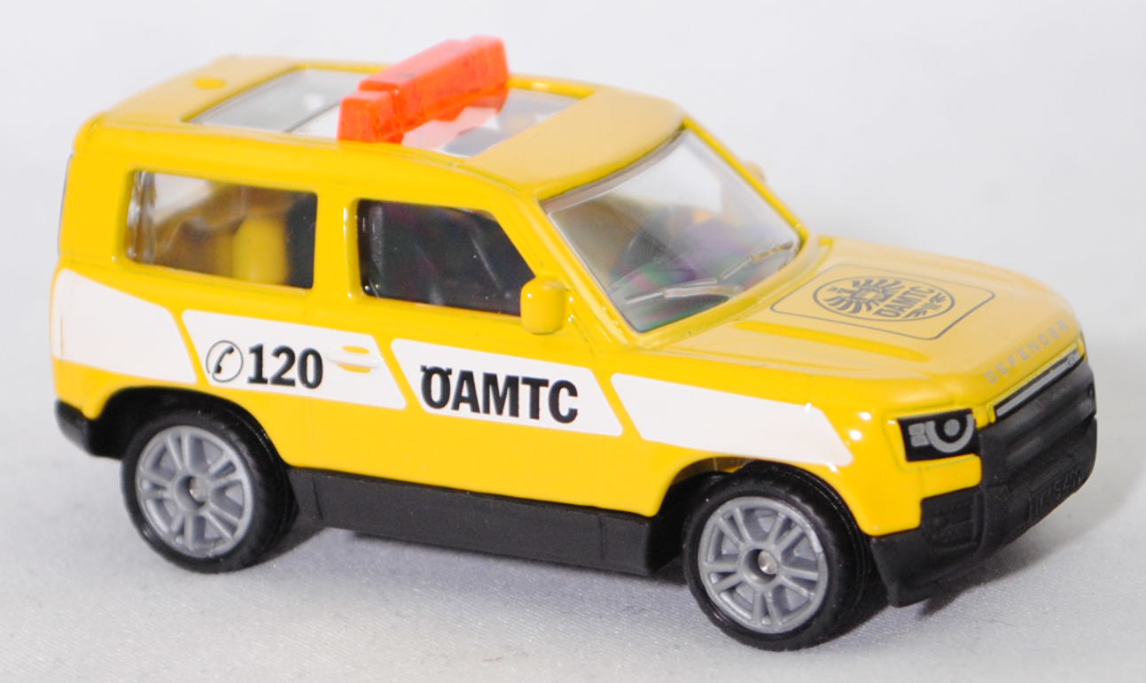 03800 A Land Rover Defender 90 S P400 AWD (2. Generation Defender, Baureihe Defender, interne Baureihenbezeichnung L663, dreitüriger Sport Utility Vehicle (SUV) mit 5 Sitzplätzen, Vorfacelift, Stoßfänger vorne mit zwei Lüftungsschlitzen im Bereich zwischen den Scheinwerfern, mit Panoramaschiebedach, mit Schutzbügel in A-Form für Fahrzeuge ohne Chrome Stoßfänger, Ausstattungspaket S ohne Nebelscheinwerfer, permanenter Allradantrieb, Motor: Ingenium (britisch-indischer Automobilhersteller Jaguar Land Rover (JLR)) 3.0 Liter MHEV (Mild Hybrid Electric Vehicle) Typ AJ20P6 wassergekühlter Sechszylinder-Reihen-Viertakt-Turbo-Otto mit Direkteinspritzung und zwei obenliegende Nockenwellen (DOHC = Double Overhead Camshaft) sowie 4 Ventile pro Zylinder und Ladeluftkühler sowie 2996 cm³ und 400 PS, Motorcode PT306, zusätzlicher Elektroantrieb als Riemen-Starter-Generator mit Lithium-Ionen-Batterie, Radstand 2587 mm, Länge ohne Ersatzrad 4323 mm, Länge mit Ersatzrad 4583 mm, Modell 2020-2025) ÖAMTC, verkehrsgelb, innen schwarz, Sitze schwarz, Lenkrad schwarz, Druck ÖAMTC C 120 und Streifen in reinweiß auf den Seiten, Druck ÖAMTC-Logo in schwarz oben auf der Motorhaube, Druck DEFENDER in silber auf der Stirnseite der Motorhaube, Druck DEFENDER in silber links und LAND ROVER-Logo in silber/schwarz auf der Hecktür, hohe unbedruckte Orangelichtleiste auf dem Panoramaschiebedach, Chassis schwarz mit Anhängerkupplung (AHK), B47 geschlossen silbergrau (Land Rover Größe 8,0 J 19 ET 41,5 mit Lochkreis 5 x 120 und Reifen 255/65 R 19), SIKU SUPER, ca. 1:59, P29f (Limited Edition / AUSTRIA SPECIAL) (EAN 4006874315680)