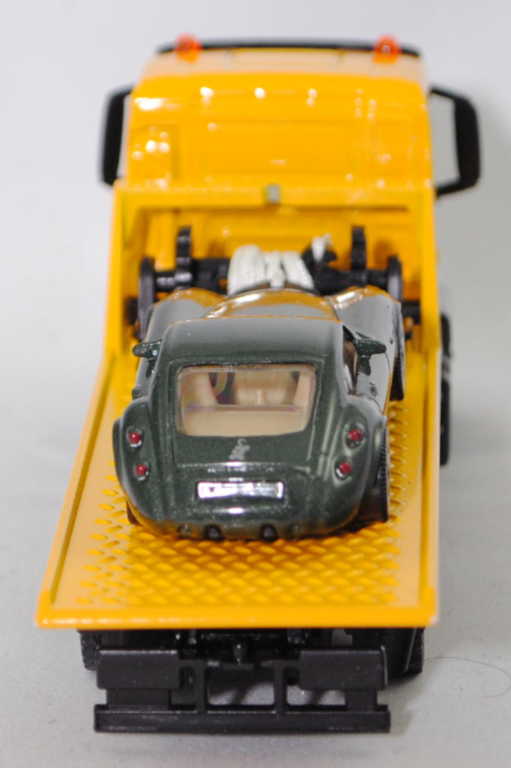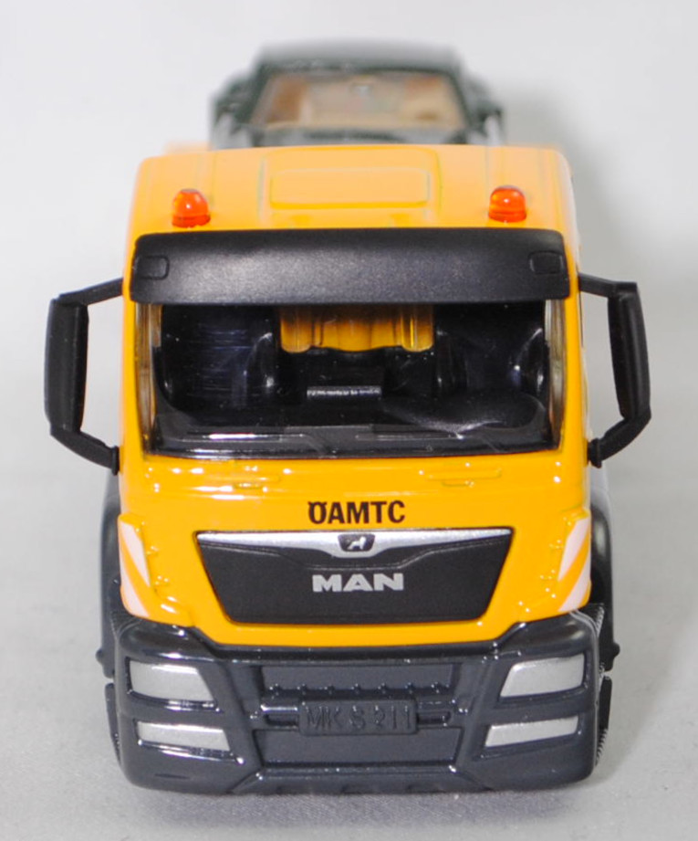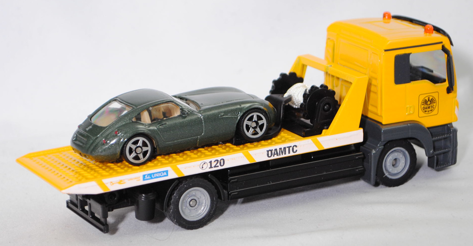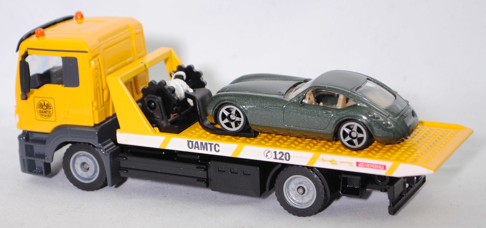 03800 A MAN TGS 26.320 4x2 (1. Generation, Fahrerhaus Typ M, Facelift 2 von 2013, Kühlergrill glatt mit Chromspange über dem MAN-Schriftzug und in der Chromspange integriertem MAN-Löwen, Kühlergrill bis oberhalb der Stoßstange geführt, Motor: MAN Typ D0836 stehender wassergekühlter Sechszylinder-Reihen-Viertakt-Diesel mit Common-Rail-Einspritzung und zweistufige Turboaufladung sowie zwei obenliegende Nockenwellen (DOHC = Double Overhead Camshaft) und 4 Ventile pro Zylinder sowie Ladeluftkühler und 6867 cm³ sowie 320 PS, Radstand 4760 mm, Länge 8910 mm, Modell 2013-2017) Abschleppwagen mit PKW, Abschleppwagen: Fahrerhaus signalgelb, innen schwarz, Sitze schwarz, Lenkrad integriert, Druck ÖAMTC-Logo in schwarz auf den Türen, Druck ÖAMTC in schwarz vorne auf dem Fahrerhaus, 2 Orangelichter auf dem Dach des Fahrerhauses, Sicke vor dem Lüftungsgitter in Höhe Unterkante Seitenfenster durchgehend und im Bereich der ehemaligen Unterbrechung breiter, Druck ÖAMTC C 120 in schwarz und GENERALI-Logo in reinweiß auf Streifen in dunkel-verkehrsrot sowie Streifen in reinweiß auf der linken Seite der Plattform, Druck ÖAMTC C 120 in schwarz und UNIQA-Logo in reinweiß auf Streifen in hell-capriblau sowie Streifen in reinweiß auf der rechten Seite der Plattform, Abschleppkralle schwarz, Stoßstange und Treppen zum Fahrerhaus hell-graphitgrau, Radkästen vorne hell-graphitgrau und hinten schwarz, seitliche Schutzvorrichtung schwarz, Chassis schwarz, Unterfahrschutz schwarz, Chassis LKW mit Bpr. siku und ohne CE-Zeichen sowie mit Adresse, Unterseite der Ladefläche mit Bpr. siku-Logo und mit CE-Zeichen sowie mit Druck Chargennummer, LKW41 silbergrau, ca. 1:50 (Fahrerhaus) / 1:54 (Aufbau); Ladegut: Wiesmann GT MF4 (1. Generation, zweitüriger Sportwagen als Coupé mit 2 Sitzplätzen, GT = Grand Tourismo, MF = Martin und Friedhelm (Brüder und Gründer der Firma Wiesmann GmbH & Co. KG 48249 Dülmen), Chassis aus Aluminium, Karosserie aus glasfaserverstärktem Verbundwerkstoff, Vorfacelift, Einsätze in den vorderen Kotflügeln mit jeweils 3 Lampen für Abblendlicht und Fernlicht sowie Blinker, Fahrzeugfront ohne Spoilerlippe, schmale Lüftungsschlitze in der Fahrzeugfront, ohne Heckflügel, 6-Gang-Schaltgetriebe, Hinterradantrieb, Motor: BMW Typ N62B48TU wassergekühlter Achtzylinder-V-Viertakt-Otto mit Saugrohreinspritzung (SFI = Sequential Fuel Injection) und zwei obenliegende Nockenwellen (DOHC = Double Overhead Camshaft) je Zylinderbank sowie 4 Ventile pro Zylinder und 4799 cm³ sowie 367 PS, Radstand 2507 mm, Länge 4230 mm, Modell 2005-2010) (vgl. 0879), hell-chromoxydgrünmetallic, innen beige, Sitze beige, Lenkrad beige, Bpr. mit Adresse, Druck der Chargennummer auf dem Chassis, B27 silber (Wiesmann Leichtmetallfelgen im 7-Speichen-Design Größe 8 J x 18 mit Reifen 245/45 R 18), ca. 1:53, SIKU SUPER 1:50, L17mpP (Schachtel mit Druck 1:50) (Limited Edition / AUSTRIA SPECIAL) (EAN 4006874327225)