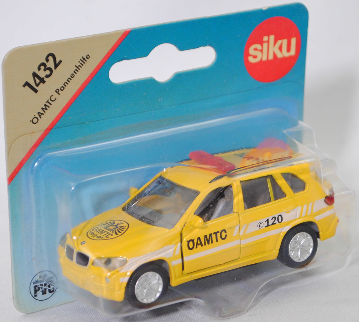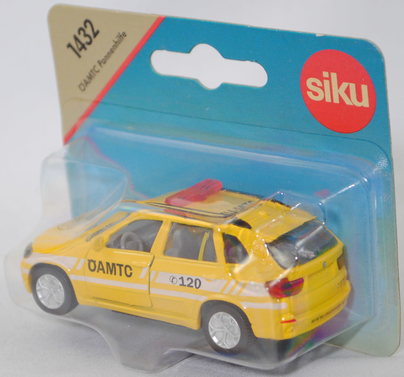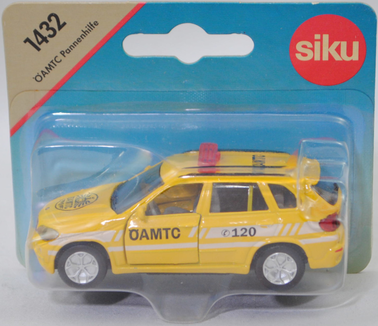 silbergrau, Lenkrad silbergrau, Druck ÖAMTC C 120 in schwarz und reinweiße Streifen auf den Seiten, Druck ÖAMTC-Logo in schwarz und BMW-Logo in weiß/blau/schwarz auf der Motorhaube, Druck ÖAMTC in schwarz auf dem Dach, Druck C 120 in schwarz und X5 in silber sowie BMW-Logo in weiß/blau/schwarz auf der Heckklappe, Druck www.oeamtc.at in schwarz hinten auf dem Stoßfänger, flache Orangelichtleiste, Dachreling schwarz lackiert, ohne AHK, B41 silber (BMW Leichtmetallräder Sternspeiche 209 (5-Speichen-Design) Größe 8,5 J x 18 ET 46 mit Lochkreis 5 x 120 (Teilenummer 36 11 6 770 200, Farbe silber) und Nabenabdeckung (Ø 67 mm mit Chromrand, Teilenummer 36 13 6 783 536) sowie Reifen 255/55 R 18 109V Runflet), SIKU SUPER, ca. 1:58, P29a (Limited Edition / AUSTRIA SPECIAL) (Vitrinenmodell, Blister lösen sich schnell von der Karte, Schachtel vergibt und mit Lagerspuren) (EAN 4006874414321)