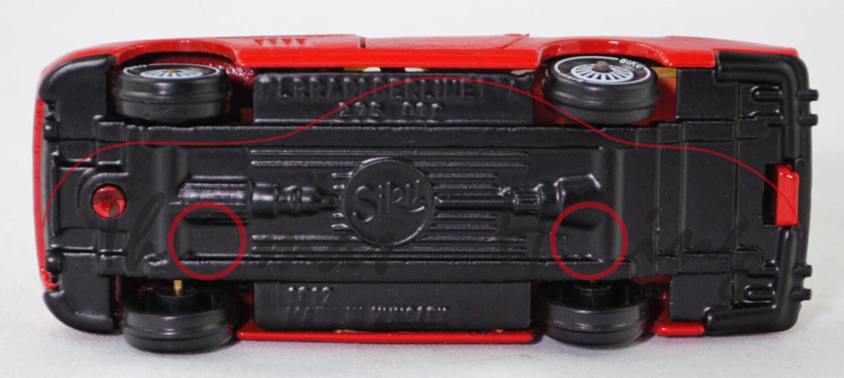 06400 HU Ferrari Berlinetta 275 GTB (1. Generation, Baureihe 275, interne Baureihenbezeichnung Tipo 563, 2. Serie, Long Nose oder Lange Nase genannt, zweitüriger Sportwagen als Coupé mit Fließheck und 2 Sitzplätzen, Design der Karosserie: Pininfarina, Produktion bei Carrozzeria Scaglietti s.r.l. viale Monte Kosica 66 41121 Modena Italien, Facelift 1965 zum Modelljahr 1966, längere Überhänge vorne, Stoßstangenecken vorne höher positioniert, Motorhaube glatt, Heckfenster vergrößert, Ausstattungslinie Berlinetta 275 GTB: Leiterrahmen mit Gitterrohrrahmen aus Stahl + Karosserie aus Stahl (glatte Verbindung zwischen B-Säule und Dach) + Türen und Hauben aus Aluminium + Schneckenlenkung + Fünfganggetriebe mit Differential an der Hinterachse montiert (Transaxle-Bauweise) + Einzelradaufhängung + Scheibenbremsen + Leder-Schalensitze + Nardi-Holzlenkrad, 5-Gang-Schaltgetriebe, Hinterradantrieb, Motor: Ferrari Tipo 213 wassergekühlter Zwölfzylinder-V-Viertakt-Otto mit 3 Fallstrom-Doppelvergaser Weber 40DCZ6 und eine obenliegende Nockenwelle (SOHC = Single Overhead Camshaft) je Zylinderbank sowie 2 Ventile pro Zylinder und 3286 cm³ sowie 280 PS, Radstand 2400 mm, Länge 4421 mm, Modell 1965-1966), karminrot, innen hell-rotorange, Sitze hell-rotorange, Lenkrad schwarz, Bpr. 1012, Hungary, Chassis schwarz, Verglasung gelb, R11 glatt (Ferrari Magnesium-Gussräder Typ Starbust im 20-Speichen-Design mit 10 Löchern (Hersteller Campagnolo) Größe 6,5 K x 14 (Teilenummer 40336) und Zentralverschluss mit Flügelmutter sowie Pirelli Cinturato CN72 Reifen 195-14), SIKU Ungarn / Metchy, ca. 1:56, m (Limited Edition / HUNGARY SPECIAL) (Vitrinenmodell, Fahrertür nicht zu öffnen, ein öffnen der Tür wurde nicht versucht da produktionsbedingt die Türscharniere brechen können) (EAN 4006874010127)