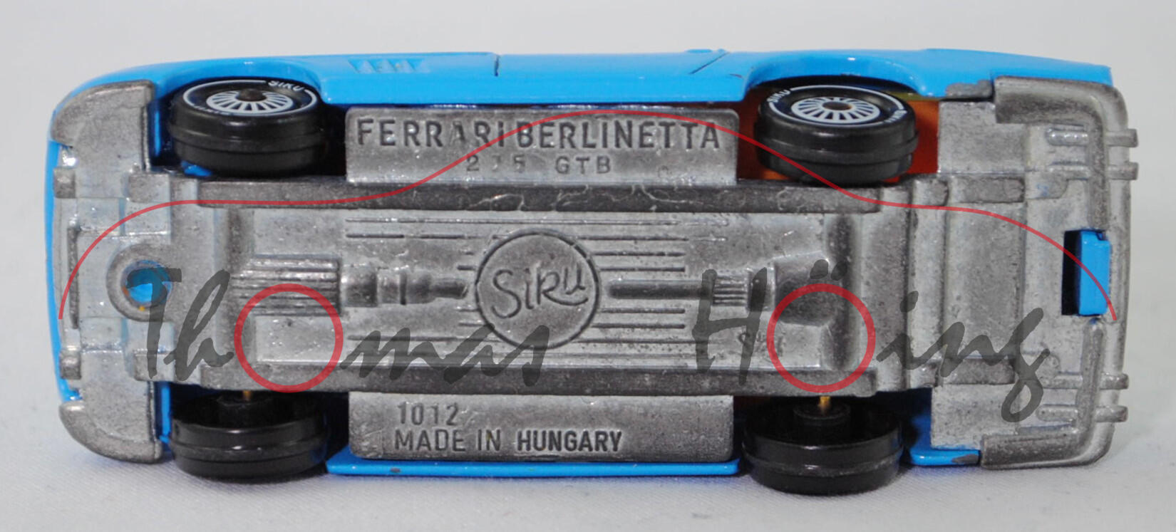 06401 HU Ferrari Berlinetta 275 GTB (1. Generation, Baureihe 275, interne Baureihenbezeichnung Tipo 563, 2. Serie, Long Nose oder Lange Nase genannt, zweitüriger Sportwagen als Coupé mit Fließheck und 2 Sitzplätzen, Design der Karosserie: Pininfarina, Produktion bei Carrozzeria Scaglietti s.r.l. viale Monte Kosica 66 41121 Modena Italien, Facelift 1965 zum Modelljahr 1966, längere Überhänge vorne, Stoßstangenecken vorne höher positioniert, Motorhaube glatt, Heckfenster vergrößert, Ausstattungslinie Berlinetta 275 GTB: Leiterrahmen mit Gitterrohrrahmen aus Stahl + Karosserie aus Stahl (glatte Verbindung zwischen B-Säule und Dach) + Türen und Hauben aus Aluminium + Schneckenlenkung + Fünfganggetriebe mit Differential an der Hinterachse montiert (Transaxle-Bauweise) + Einzelradaufhängung + Scheibenbremsen + Leder-Schalensitze + Nardi-Holzlenkrad, 5-Gang-Schaltgetriebe, Hinterradantrieb, Motor: Ferrari Tipo 213 wassergekühlter Zwölfzylinder-V-Viertakt-Otto mit 3 Fallstrom-Doppelvergaser Weber 40DCZ6 und eine obenliegende Nockenwelle (SOHC = Single Overhead Camshaft) je Zylinderbank sowie 2 Ventile pro Zylinder und 3286 cm³ sowie 280 PS, Radstand 2400 mm, Länge 4421 mm, Modell 1965-1966), lichtblau, innen hell-rotorange, Sitze hell-rotorange, Lenkrad schwarz, Bpr. 1012, Hungary, Chassis chrom, Verglasung gelb, R11 glatt (Ferrari Magnesium-Gussräder Typ Starbust im 20-Speichen-Design mit 10 Löchern (Hersteller Campagnolo) Größe 6,5 K x 14 (Teilenummer 40336) und Zentralverschluss mit Flügelmutter sowie Pirelli Cinturato CN72 Reifen 195-14), SIKU Ungarn / Metchy, ca. 1:56, m- (Limited Edition / HUNGARY SPECIAL) (Vitrinenmodell, A-Säulen unten am Fuß gebrochen, minimale Lackfehler) (EAN 4006874010127)