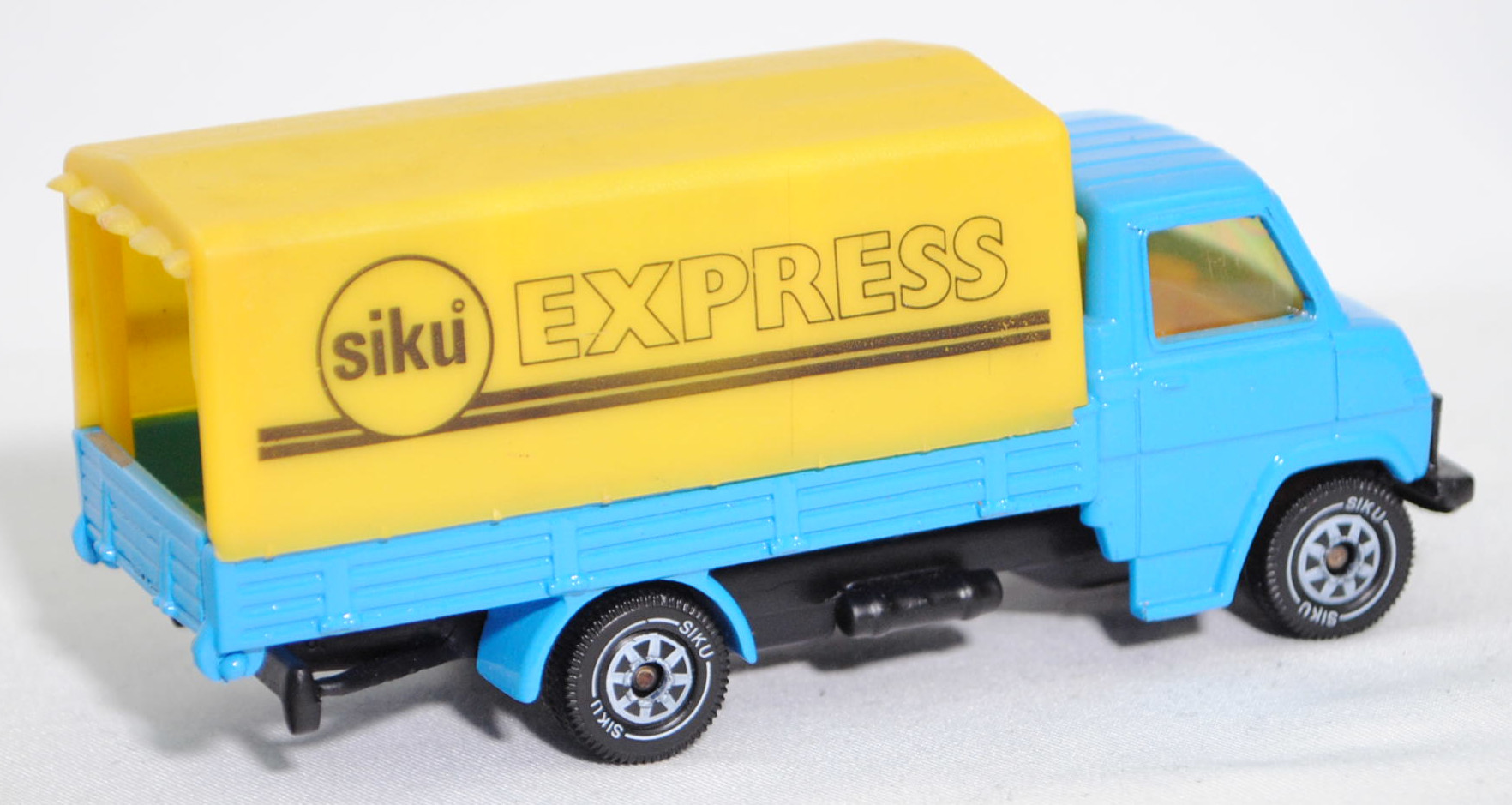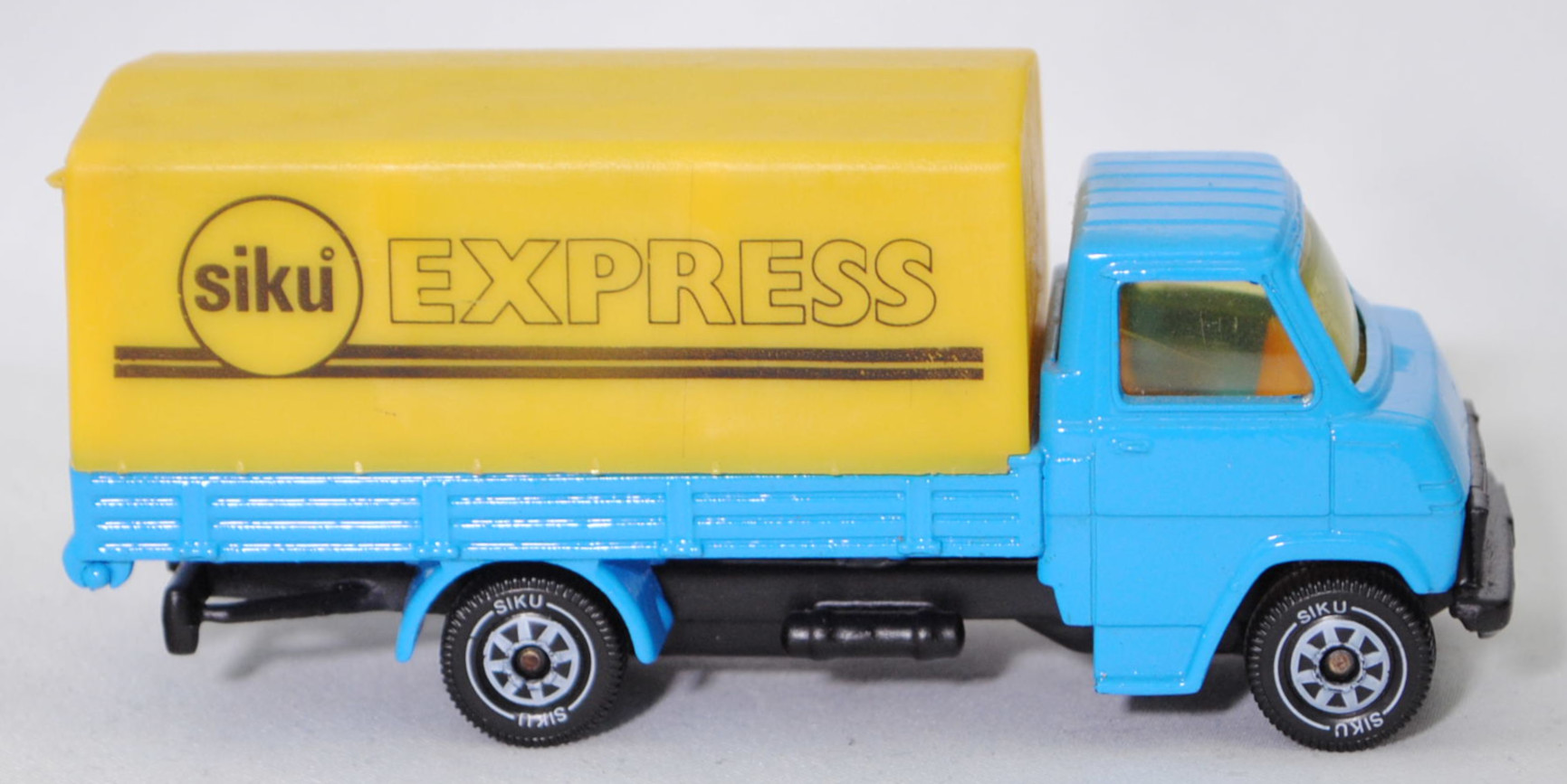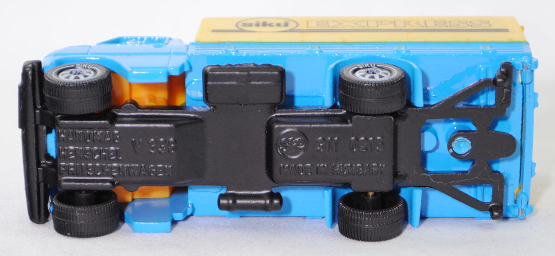 06402 HU Hanomag-Henschel F 55 (1. Generation, Baureihe F-Reihe, Kurzhauber mit kubischem Fahrerhaus als leichter LKW mit 3 Sitzplätzen, Design Louis Lucien Lepoix (1918-1998), Produktion im Werk Hanomag Sebaldsbrücker Heerstraße 2800 Bremen 11 (Sebaldsbrück) welches im Jahr 1961 von den Carl Friedrich Wilhelm Borgward G.m.b.H. Automobil- und Motoren-Werke erworben wurde, Facelift 1969, Schriftzug HANOMAG / HENSCHEL vorne links auf der Motorhaube, Leergewicht Pritschenwagen 2615 kg, zulässiges Gesamtgewicht 5300 kg, Hanomag G 150 synchronisiertes 5-Gang-Schaltgetriebe als Knüppel-Fernschaltung, Hinterradantrieb, Motor: Rheinmetall Hanomag Typ D 142 L 1 stehender (unter dem Mittelsitz des Fahrerhauses) wassergekühlter Vierzylinder-Reihen-Viertakt-Diesel mit indirekter Bosch Einspritzung und eine zahnradgetriebene untenliegende Nockenwelle sowie 2 hängende Ventile pro Zylinder und 3142 cm³ sowie 80 PS, Radstand 3500 mm, Pritschenlänge 4050 mm, Länge 6080 mm, Modell 1969-1973) Pritschenwagen mit Plane, himmelblau, innen dahliengelb, Sitze dahliengelb, Lenkrad integriert, Motorhaube ohne Aufkleber vorne links, Plane zinkgelb, Druck siku° EXPRESS in schwarz auf den Seiten der Plane, Chassis schwarz, Hungary, Verglasung gelb, B5 (Hanomag-Henschel zweiteilige Stahlblech-Scheibenräder mit Halbtiefbettfelgen Größe 6,00 G-16 SDC sowie Reifen 7,50-16 Tr (8 PR) vorne einfach und hinten doppelt), SIKU Ungarn / Metchy, ca. 1:60, m- (Limited Edition / HUNGARY SPECIAL) (Vitrinenmodell, werkseitige Lackfehler) (EAN 4006874016167)