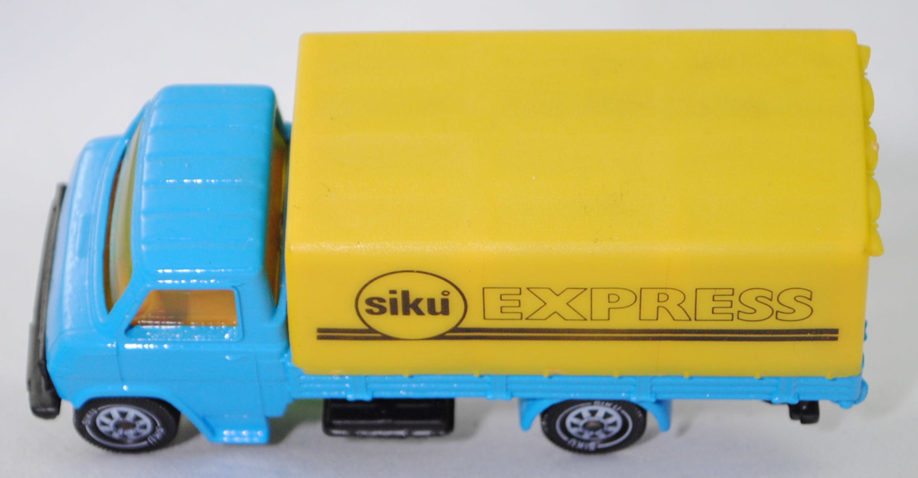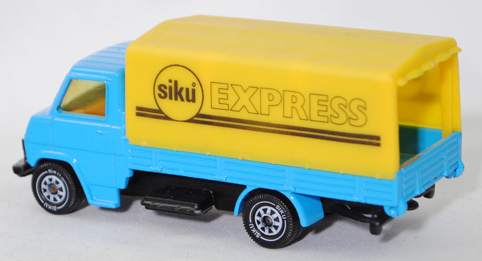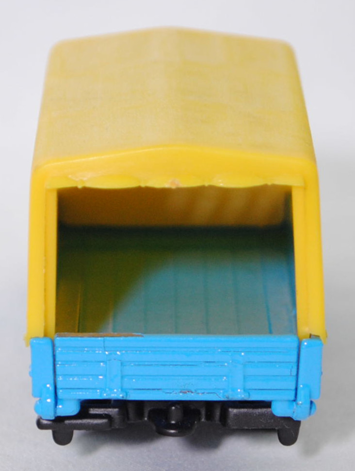 06402 HU Hanomag-Henschel F 55 (1. Generation, Baureihe F-Reihe, Kurzhauber mit kubischem Fahrerhaus als leichter LKW mit 3 Sitzplätzen, Design Louis Lucien Lepoix (1918-1998), Produktion im Werk Hanomag Sebaldsbrücker Heerstraße 2800 Bremen 11 (Sebaldsbrück) welches im Jahr 1961 von den Carl Friedrich Wilhelm Borgward G.m.b.H. Automobil- und Motoren-Werke erworben wurde, Facelift 1969, Schriftzug HANOMAG / HENSCHEL vorne links auf der Motorhaube, Leergewicht Pritschenwagen 2615 kg, zulässiges Gesamtgewicht 5300 kg, Hanomag G 150 synchronisiertes 5-Gang-Schaltgetriebe als Knüppel-Fernschaltung, Hinterradantrieb, Motor: Rheinmetall Hanomag Typ D 142 L 1 stehender (unter dem Mittelsitz des Fahrerhauses) wassergekühlter Vierzylinder-Reihen-Viertakt-Diesel mit indirekter Bosch Einspritzung und eine zahnradgetriebene untenliegende Nockenwelle sowie 2 hängende Ventile pro Zylinder und 3142 cm³ sowie 80 PS, Radstand 3500 mm, Pritschenlänge 4050 mm, Länge 6080 mm, Modell 1969-1973) Pritschenwagen mit Plane, himmelblau, innen dahliengelb, Sitze dahliengelb, Lenkrad integriert, Motorhaube ohne Aufkleber vorne links, Plane zinkgelb, Druck siku° EXPRESS in schwarz auf den Seiten der Plane, Chassis schwarz, Hungary, Verglasung gelb, B5 (Hanomag-Henschel zweiteilige Stahlblech-Scheibenräder mit Halbtiefbettfelgen Größe 6,00 G-16 SDC sowie Reifen 7,50-16 Tr (8 PR) vorne einfach und hinten doppelt), SIKU Ungarn / Metchy, ca. 1:60, m- (Limited Edition / HUNGARY SPECIAL) (Vitrinenmodell, werkseitige Lackfehler) (EAN 4006874016167)