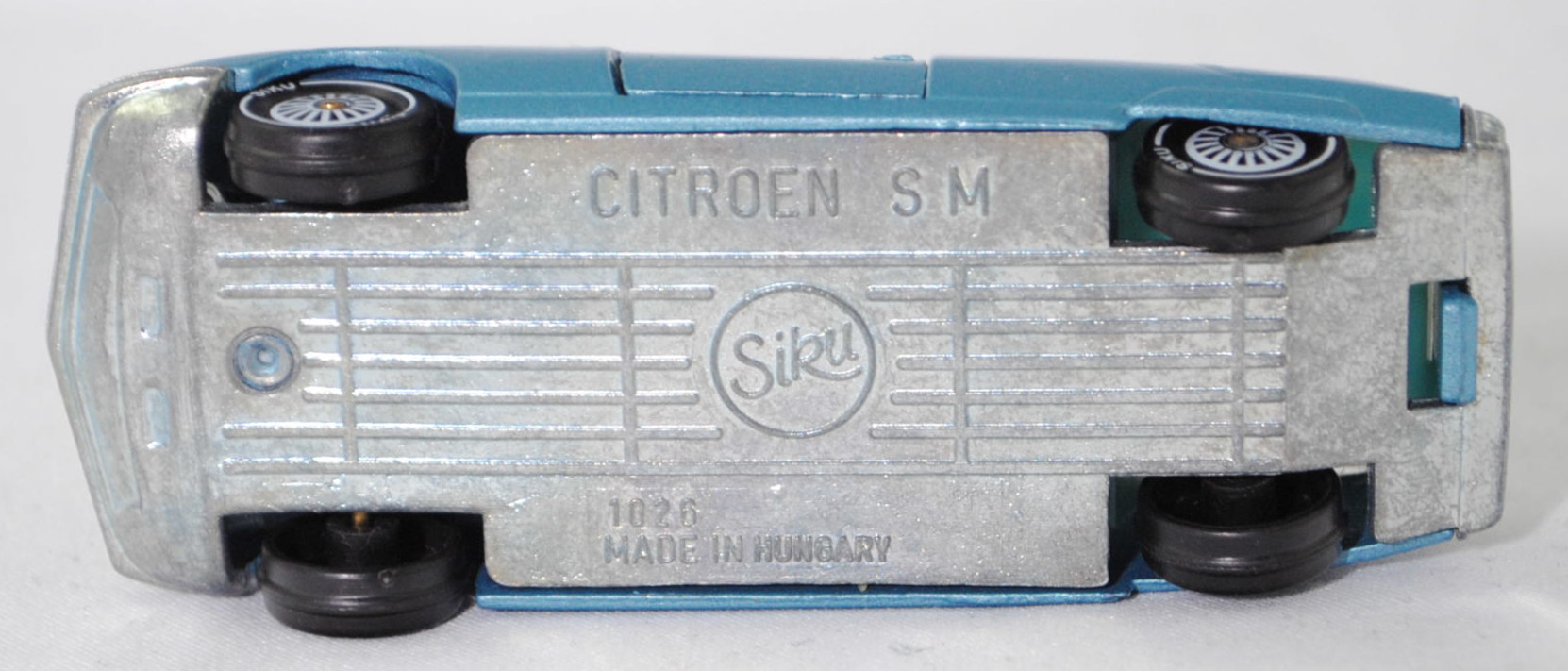 06403 HU Citroen SM 2.7 (1. Generation, Baureihe SM, SM = Sport Maserati (häufigste Übersetzung), interne Baureihenbezeichnung SB, zweitüriges Sportcoupé mit 4 Sitzplätzen, Design Robert Maurice Jean Opron, Ausstattungslinie SM 2.7: Motor mit Vergaser + 6 Jodscheinwerfer je 3 zusammengefasst in einem Gehäuse wobei 2 der 4 Scheinwerfer für das Fernlicht lenkungsabhängig sind + Einzelsitze vorne als Liegesitze + Türfenster elektrisch versenkbar + 2 Kopfstützen + Armstützen und Ablagefächer in den Türen + hintere Sitzbank mit 2 Schalensitzen und Armstütze in der Mitte + Tageskilometerzähler + beleuchtetes Zündschloss + getönte Scheiben + Klimaanlage, 5-Gang-Schaltgetriebe, Frontantrieb, Motor: Maserati Typ C114-1 wassergekühlter Sechszylinder-V-Viertakt-Otto mit 3 Weber-Doppelvergaser Typ 42 DCNF2 und zwei kettengetriebene obenliegende Nockenwellen (DOHC = Double Overhead Camshaft) pro Zylinderbank sowie 2 Ventile pro Zylinder und 2670 cm³ sowie 170 PS, Radstand 2950 mm, Länge 4893 mm, Modell 1970-1972), hellblaumetallic, innen hellblau, Sitze hellblau, Lenkrad schwarz, Chassis chrom, Bpr. 1026, Hungary, Verglasung klar, R11 glatt (Citroen Stahlfelgen Größe 6 J x 15 mit MICHELIN-Reifen 195/70 VR 15 X und verchromte Radzierkappen), SIKU Ungarn / Metchy, ca. 1:61, m (Limited Edition / HUNGARY SPECIAL) (Vitrinenmodell) (EAN 4006874010264)