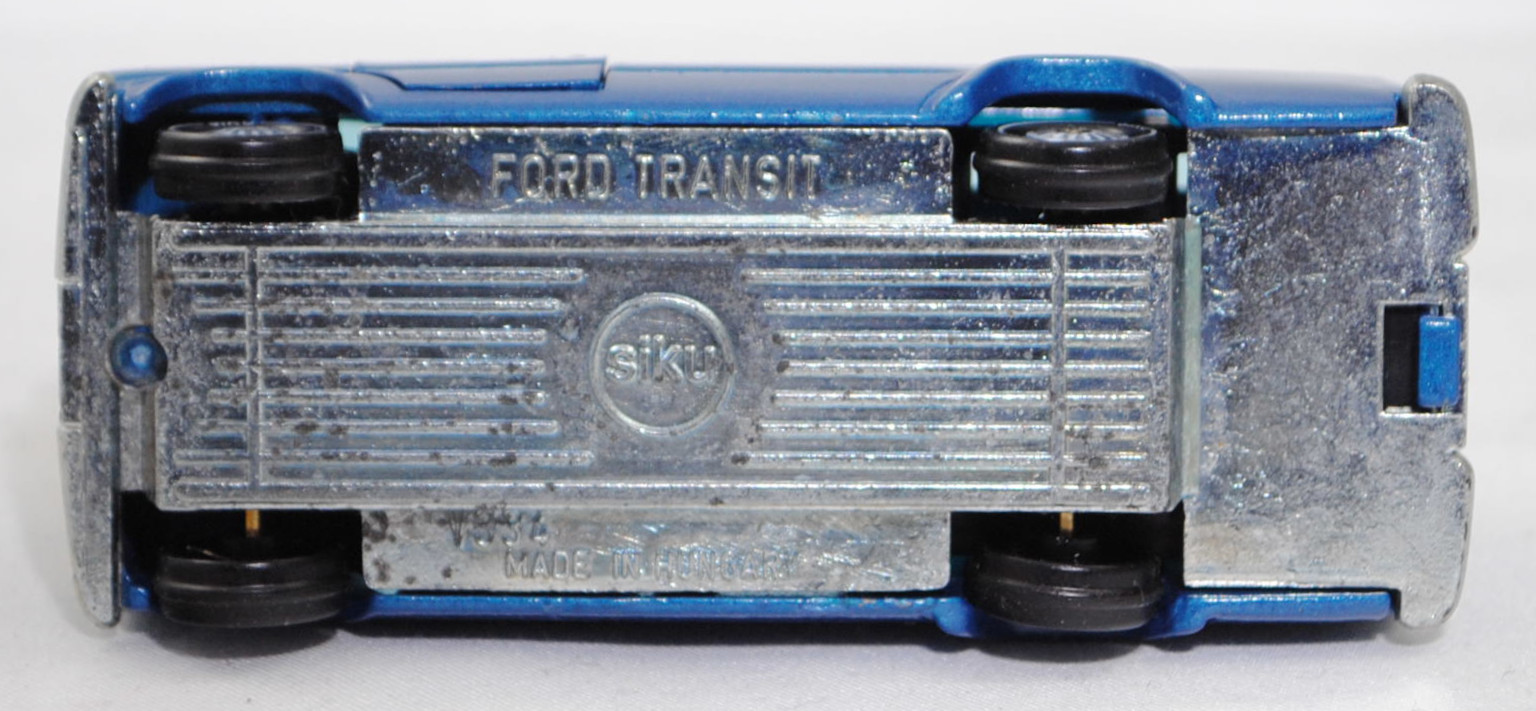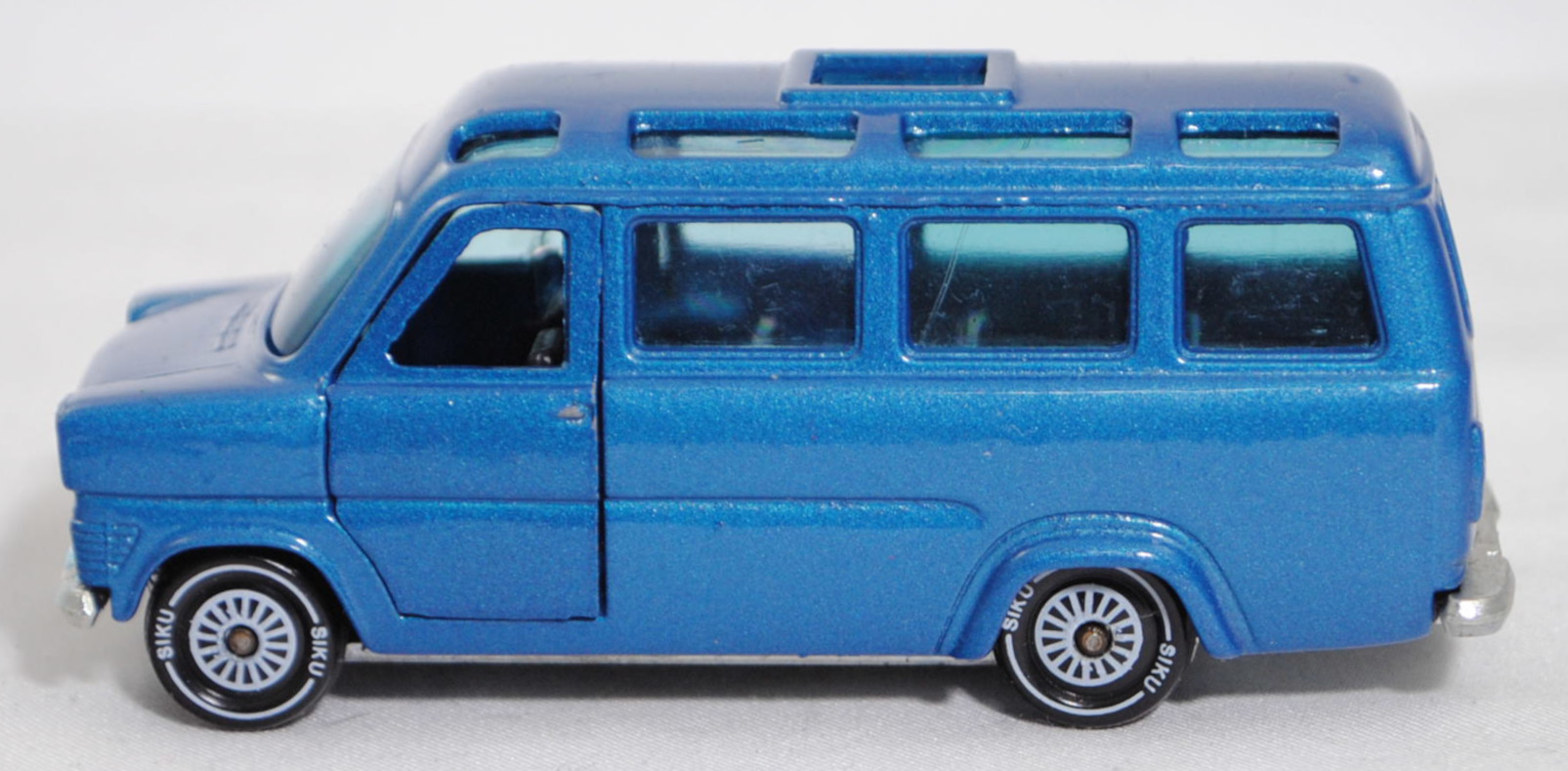 06403 HU Ford Transit Panorama-Bus FT 130 (2. Generation, Baureihe Transit, interne Baureihenbezeichnung Transit '71 oder Mark 1, fünftüriger Kleintransporter als Kleinbus mit 15 Sitzplätzen, Kurzhauber, Facelift 1971 / Mk1 Facelift 1971, weißer Kühlergrill mit abgerundetem hohen Gitter und Lüftungsschlitze in 9 Reihen und 8 Öffnungen pro Reihe, Typ Bus FT (FT = Ford Transit) 15-Sitzer mit langem Radstand und Hochdach sowie 9 Dachfenstern, Ausstattungslinie Bus 15-Sitzer: Fahrerhaus-Schwenktür links und rechts mit Kurbelfenster + Trittstufe im Fahrerhaus mit Gummibelag + breite Seitentür rechts mit gleitender Trittstufe + gepolstertes Instrumentenbrett schwarz + körpergerechte und bequem gepolsterte Sitze mit robustem pflegeleichtem Kunstleder bezogen + Fahrer-Einzelsitz zweifach verstellbar + Beifahrer-Doppelsitz fest + Armlehne/Tür-Zuziehgriff für Fahrer und Beifahrer + Haltegriff für Beifahrer + zwei gepolsterte Sonnenblenden + Handschuhfach mit Deckel + 3 Innenlampen + Wagenboden mit Gummiplatte ausgelegt + Innenwände, Decken und Türen mit abwaschbarem Kunstleder bespannt + 2 Kleiderhaken im Fahrerhaus und 6 Kleiderhaken im Fahrgastraum + Kraftstofftank 68 Liter + Doppelflügel-Hecktür mit Fenster + Kotflügel hinten weit ausgestellt + Zwillingsreifen hinten, Sonderausstattung gegen Mehrpreis: Dachrandverglasung mit breiten Scheiben in den Wölbungen des Daches + Passatluke (variabel ausstallbares Fenster im Dach), Leergewicht 1400 kg, Nutzlast 1300 kg, zulässiges Gesamtgewicht 2750 kg, vollsynchronisiertes 4-Gang-Schaltgetriebe mit Mittelschaltung, Hinterradantrieb, Motor: Ford Typ Ford Köln-V4 1,7L-LC (low compressed = niedrig verdichtet) wassergekühlter Vierzylinder-V-Viertakt-Otto mit Vergaser und eine zentrale untenliegende Nockenwelle (OHV = Overhead valve engine) sowie 2 Ventile pro Zylinder und 1688 cm³ sowie 65 PS, Motorcode EY, Radstand 2997 mm, Länge 5175 mm, Modell 1971-1975) Schulbus, grünblaumetallic, innen schwarz, Sitze schwarz, Lenkrad schwarz, Chassis chrom, Hungary, R11 glatt (Ford Stahlscheibenräder mit ungeteilter Tiefbettfelge Größe 5 K x 14 mit schlauchlosen Reifen 6,50-14 6PR und verchromten Radzierkappen), SIKU Ungarn / Metchy, ca. 1:60, Schachtel Ungarn 2 (Limited Edition / HUNGARY SPECIAL) (Vitrinenmodell, Perforation der Schachtel oben geöffnet, Schachtel mit Lagerspuren) (EAN 4006874013203)