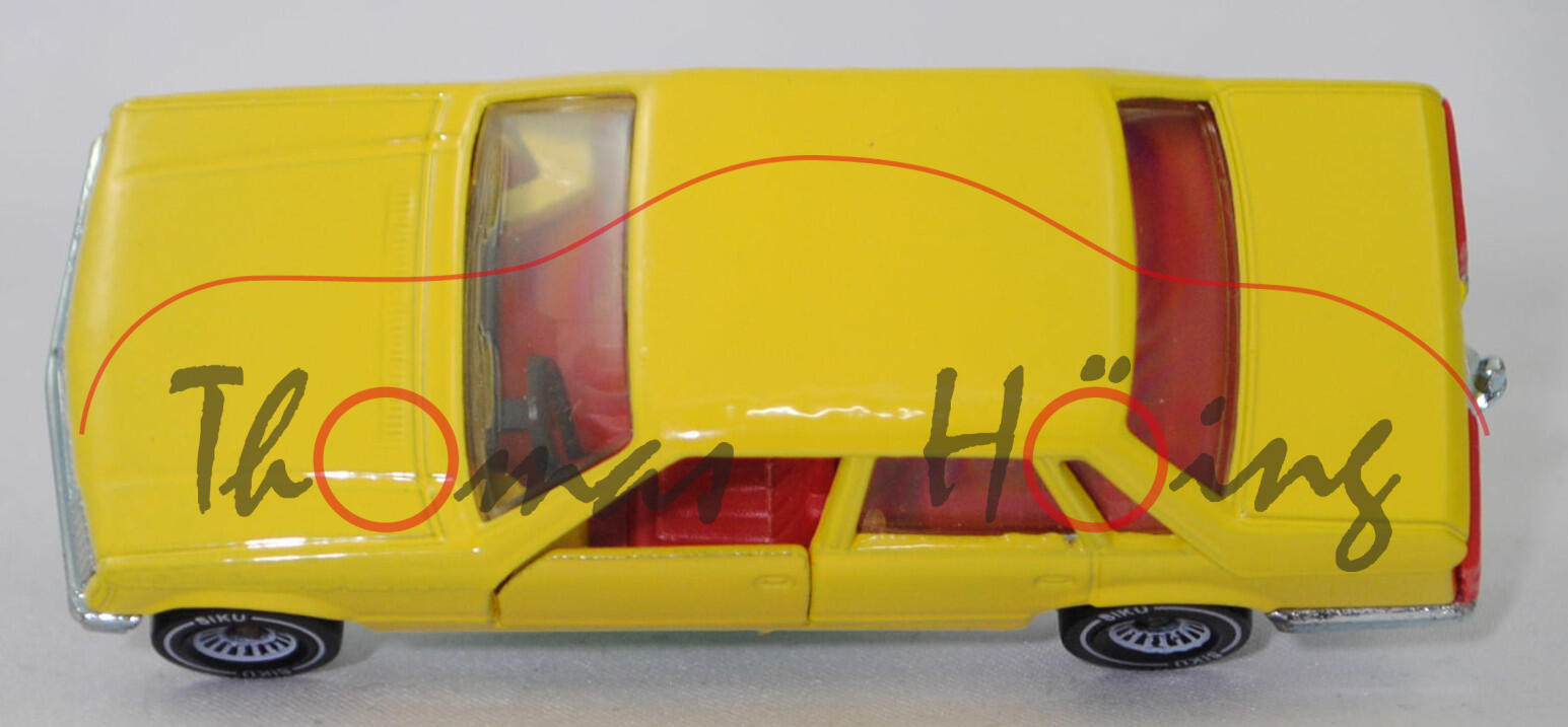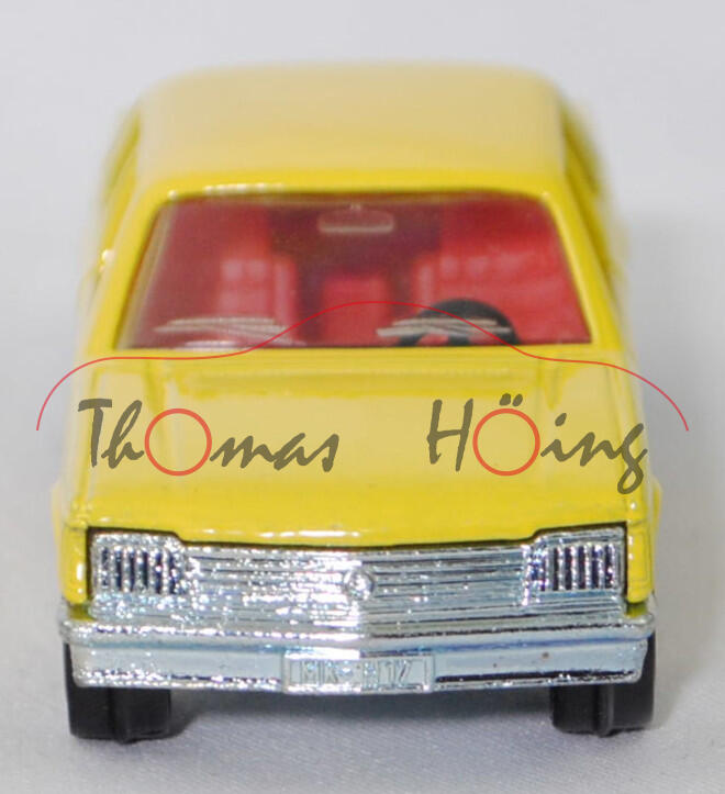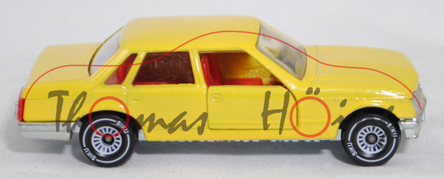 06406 HU Opel Senator 3.0 E (1. Generation, Baureihe Senator, interne Baureihenbezeichnung Typ A1, viertürige Stufenhecklimousine mit 5 Sitzplätzen, Modellcode 29 (Limousine 4-türig Stufenheck Luxus), Vorfacelift, Spoilerlippe unten ohne schwarze Plastikeinfassung, schmale dünne Außenspiegel, schwarze Blende zwischen den Rückleuchten, Cockpit gerade und nicht zum Fahrer hin angewinkelt, einzelne Instrumente im Cockpit, Ausstattungslinie Senator: Halogen-Breitbandscheinwerfer mit integrierten Blinkleuchten + sicherheitsgepolsterte Instrumententafel mit Tachometer, Tageskilometerzähler, Quarzuhr, Kraftstoff- und Temperaturanzeige + Holzimitatleisten nur unterhalb der Instrumententafel + vorne anatomisch geformte Vollschaum-Liegesitze mit Federunterstützung und einstellbaren stoffbezogenen Kopfstützen, Rückenlehnen über Handrad stufenlos bis in Liegeposition verstellbar + hinten Vollschaumsitze mit ausklappbarer Mittelarmlehne + Sitzbezüge aus hochwertigem Velour (vier Ziernähte in den Sitzflächen von oben nach unten und weiter nach vorne verlaufend) + 2 Sonnenblenden, auf der Beifahrerseite mit Make-up-Spiegel + Sportschaltung mit kurzem Schalthebel + Sicherheitsinnenrückspiegel, klappbar + Einstellgriff für großen schmutzabweisenden Außenspiegel links + ohne Außenspiegel auf der Beifahrerseite + Innenraumleuchte vorne und zwei Innenraumleuchten hinten mit Türkontaktschaltern vorne und hinten + Beleuchtung für Motorraum, Handschuhfach und Kofferraum + Fremdlichtgeschützte Rückleuchten mit integrierten Rückfahrscheinwerfern + ohne umlaufende Zierstreifen an den Flanken + Langloch-Stahlfelgen Größe 6 J x 14 mit Radzierringen, vollsynchronisiertes 4-Gang-Schaltgetriebe als Sportschaltung in der Mittelkonsole, Hinterradantrieb, Motor: Opel Typ 30E wassergekühlter Sechszylinder-Reihen-Viertakt-Otto mit Bosch L-Jetronic Saugrohreinspritzung und eine obenliegende Nockenwelle (SOHC = Single Overhead Camshaft) sowie 2 Ventile pro Zylinder und 2968 cm³ sowie 180 PS, Radstand 2683 mm, Länge 4811 mm, Modell 1978-1981), zinkgelb, innen verkehrsrot (vgl. ähnlich rot beim Original), Sitze verkehrsrot (vgl. ähnlich rot beim Original), Lenkrad schwarz, Chassis chrom, Bpr. OPEL SENATOR 3.0E CD, Hungary, Verglasung rauch, B4 = 5,0 mm breit (Opel Stahlfelgen im 6-Langloch-Design in silber Größe 6 J x 14 ET H2 49 mit Lochkreis 5 x 120 (Hersteller: Lemmerz-Werk GmbH, Nr. 1418, Teilenummer 1002237, OE-Nummer (Original Equipment Nummer) 90093469, Farbcode silber) und Nabenkappen / Radzierkappen (Teilenummer 1006058, OE-Nummer (Original Equipment Nummer) 90047032, Farbcode chrom mit Opel-Logo in schwarz mittig) sowie verchromte Radzierringen und Stahlgürtelreifen 195/70 R 14 89V), SIKU Ungarn / Metchy, ca. 1:59, Schachtel Ungarn 1 (Limited Edition / HUNGARY SPECIAL) (Vitrinenmodell, Schachtel mit Lagerspuren) (EAN 4006874010400)
