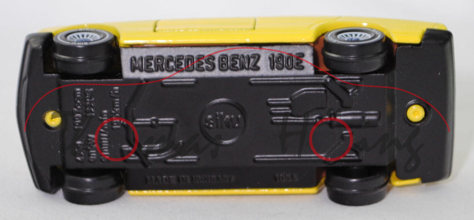 06407 HU Mercedes-Benz 190 E (1. Generation, Baureihe 190, interne Baureihenbezeichnung W 201, Konstruktionsbezeichnung W 201 E 20, Baumuster 201.024, viertürige Stufenhecklimousine mit 5 Sitzplätzen, Vor-MoPf (vor Modellpflege, Vorfacelift), Stoßfänger vorne und hinten unlackiert, schwarze schmale Zierleisten auf den Seiten (ohne Seitenplanken sogenannte Sacco-Bretter), Ausstattungslinie 190 E: Rechteck-Scheinwerfer mit Standlicht, asymmetrischem Abblendlicht, Fernlicht, Nebelscheinwerfer (Halogen-Ausstattung) + Armaturenanlage gepolstert und stoßelastisch + Ablageschale zwischen den Vordersitzen + gepolsterte Armlehnen an den Türen + Taschen an den Vordertüren + Handschuhfach + abblendbarer Panorama-Rückspiegel + von innen verstellbarer Außenspiegel + gepolsterte Sonnenblenden, auf Beifahrerseite mit Spiegel + Sitze körpergerecht geformt mit seitlichem Sitzhalt, Vordersitze in Längsrichtung und Lehnenneigung verstellbar + Fahrersitz mit Sitzhöhenverstellung + Dreipunkt-Sicherheitsgurte mit Aufrollautomatik und Sicherheitskopfstützen an den Vordersitzen + auf der Fondsitzbank 2 Dreipunkt-Sicherheitsgurte mit Aufrollautomatik, in der Mitte Beckengurt + Teppichboden vorne und hinten + Mittelschaltung mit 4-Gang-Schaltgetriebe + Motor mit 1997 cm³ und 122 PS, vollzwangssynchronisiertes 4-Gang-Schaltgetriebe als Mittelschaltung, Hinterradantrieb, Motor: Mercedes-Benz Typ M 102 E 20 wassergekühlter Vierzylinder-Reihen-Viertakt-Otto mit mechanisch-elektronisch geregelter Saugrohreinspritzung Bosch KE-Jetronic und eine obenliegende Nockenwelle (OHC = Overhead Camshaft) sowie 2 V-förmig hängende Ventile pro Zylinder und 1997 cm³ sowie 122 PS, Motor Baumuster 102.962, Radstand 2665 mm, Länge 4420 mm, Modell 1982-1988), zinkgelb, innen hell-ockerbraun, Sitze hell-ockerbraun, Lenkrad schwarz, Chassis schwarz, Hungary, B4 (Mercedes-Benz Stahlblechräder bzw. Stahl-Scheibenräder Größe 5 J x 14 H2 ET 50 mit Lochkreis 5 x 112 (Teilenummer A 201 400 0502) und Reifen 175/70 R 14 82H sowie Raddeckel / Radvollabdeckung 14 Zoll (Teilenummer A 201 401 0224) (bis 31. Dezember 1984) oder Mercedes-Benz Stahlblechräder bzw. Stahl-Scheibenräder Größe 6 J x 15 H2 ET 49 mit Lochkreis 5 x 112 (Teilenummer A 124 400 0602) und Reifen 185/65 R 15 87H sowie Raddeckel / Radvollabdeckung 15 Zoll (Teilenummer A 124 400 0425) (ab 01. Januar 1985)), SIKU Ungarn / Metchy, ca. 1:55, m (Limited Edition / HUNGARY SPECIAL) (Vitrinenmodell, werkseitige Lackfehler) (EAN 4006874010547)