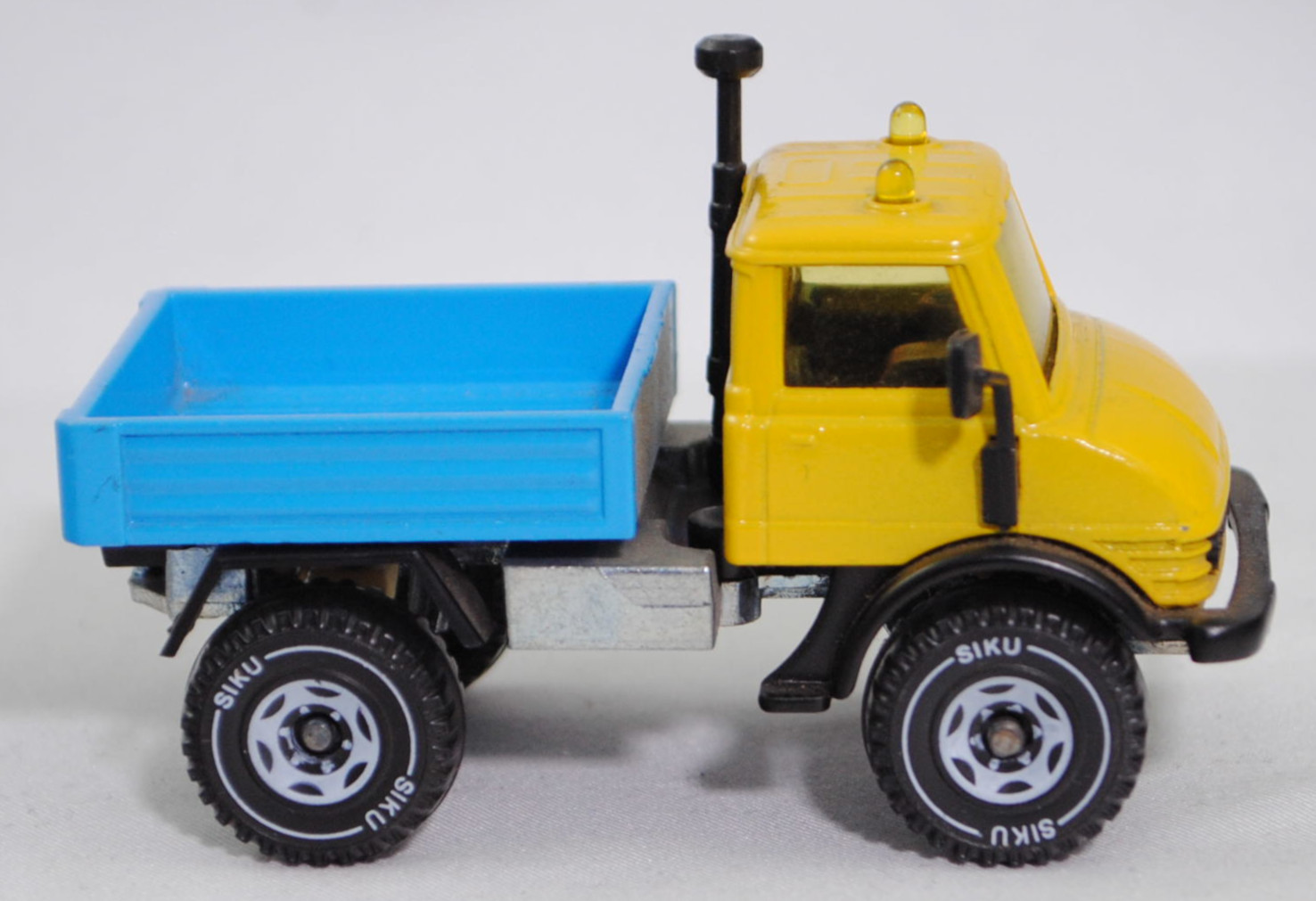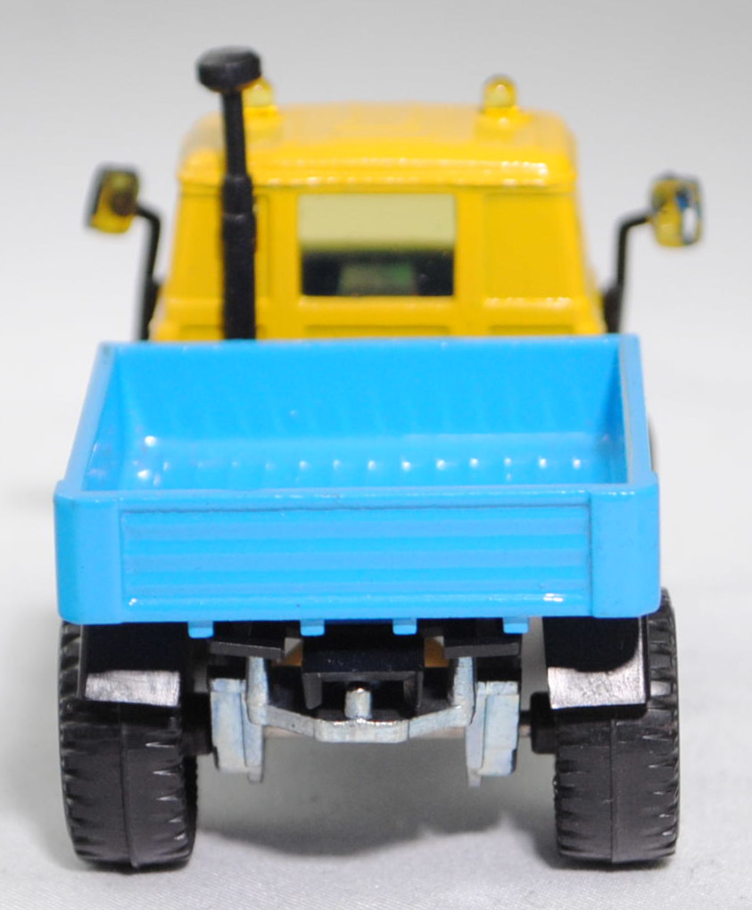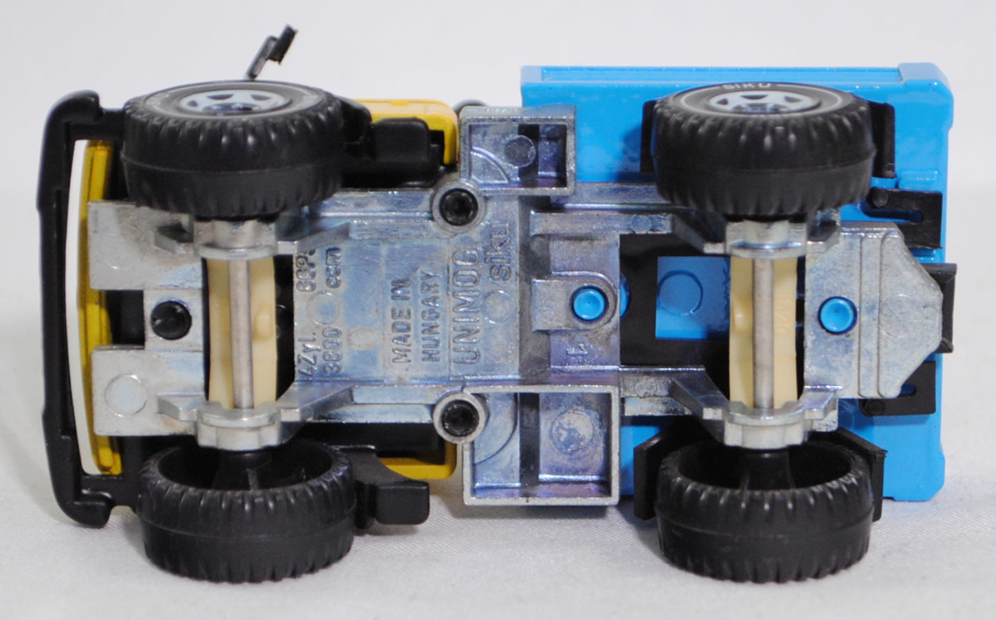 06407 HU Mercedes-Benz Unimog U 65 (Baureihe 406, Modell 1963-1964), Fahrerhaus gelb, innen basaltgrau, Pritsche blau, Chassis chrom, SIKU Ungarn / Metchy, 1:50, m- (HUNGARY SPECIAL)