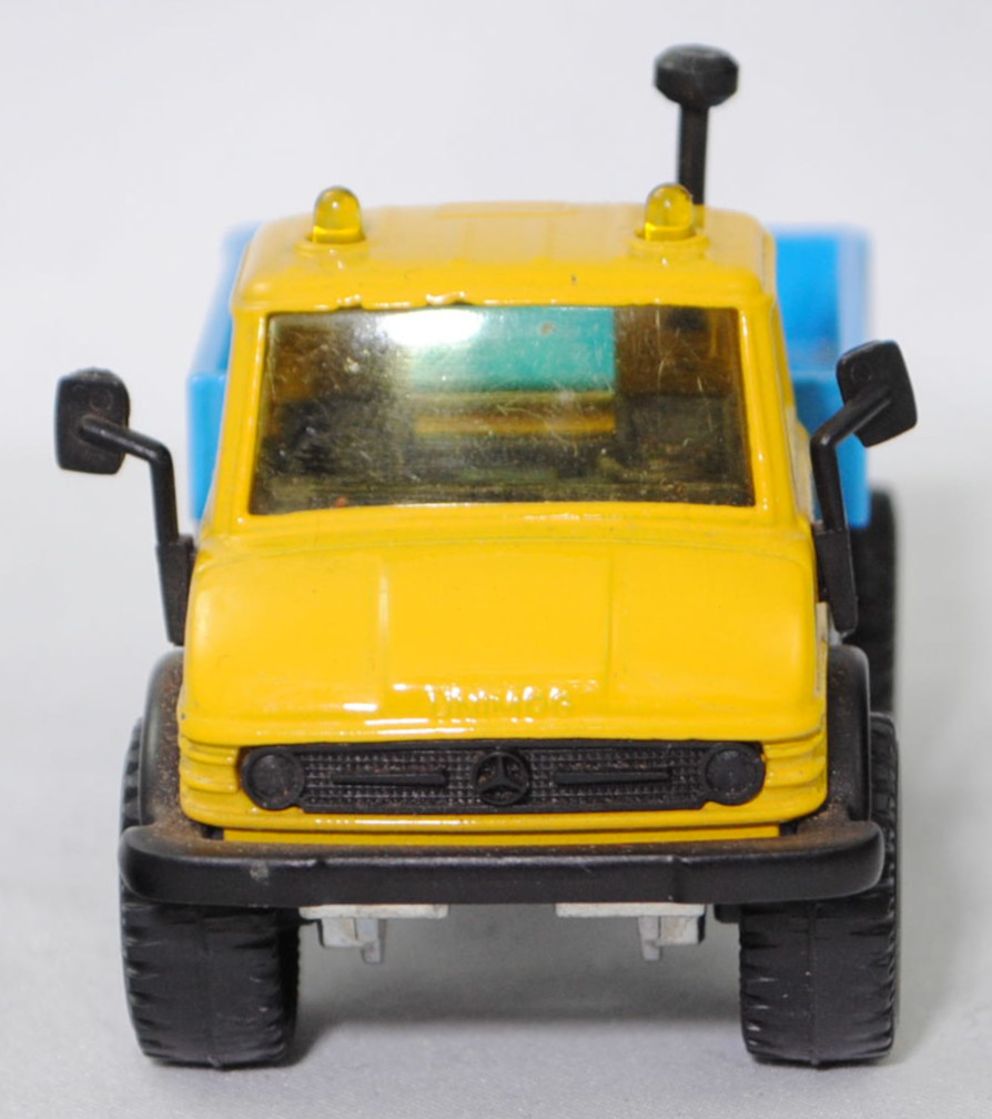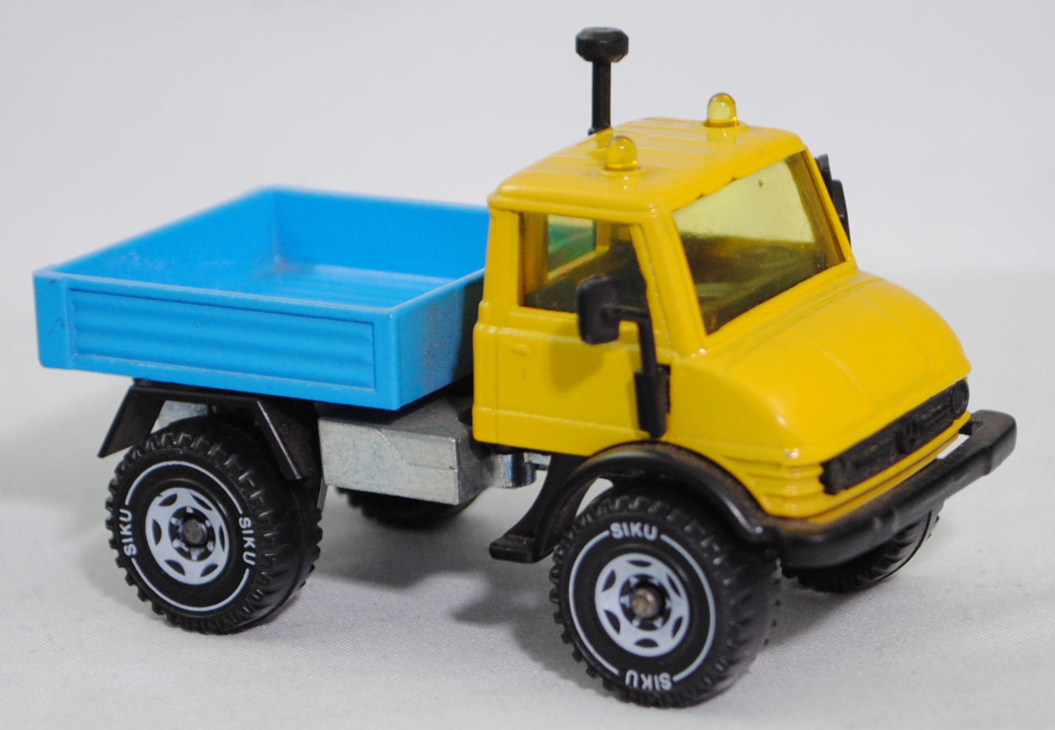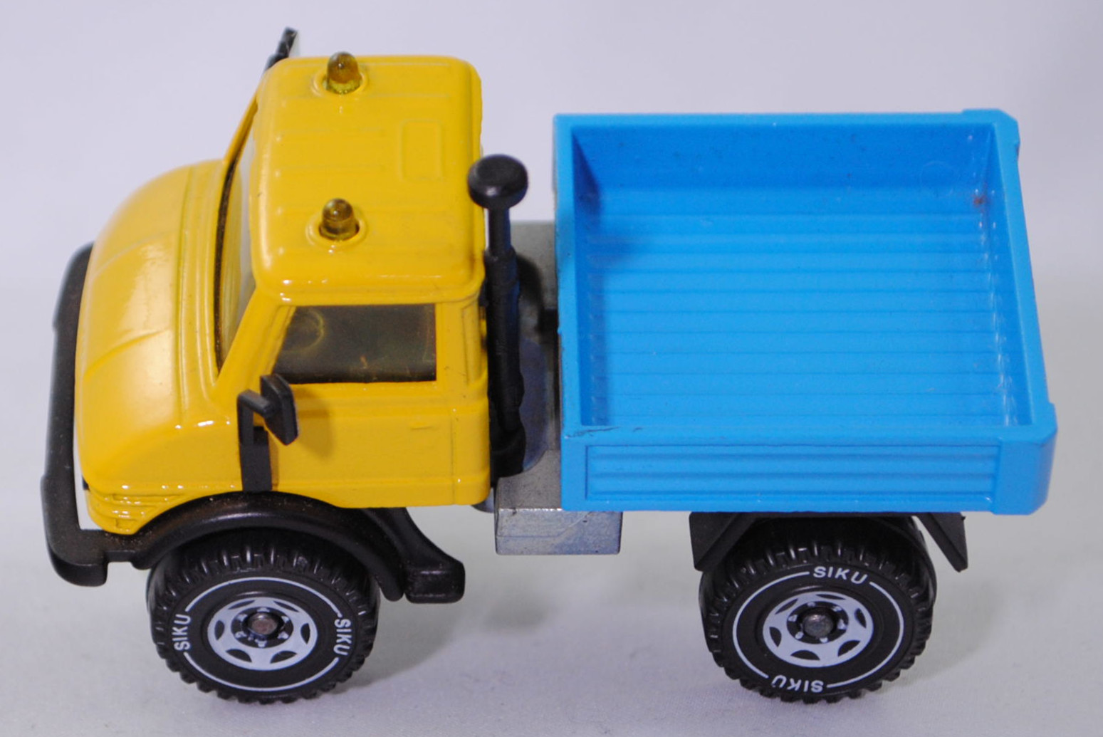 06407 HU Mercedes-Benz Unimog U 65 (Baureihe 406, Modell 1963-1964), Fahrerhaus gelb, innen basaltgrau, Pritsche blau, Chassis chrom, SIKU Ungarn / Metchy, 1:50, m- (HUNGARY SPECIAL)