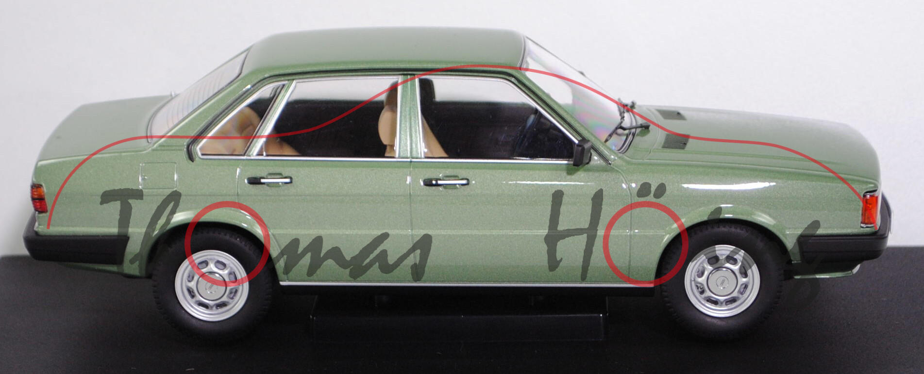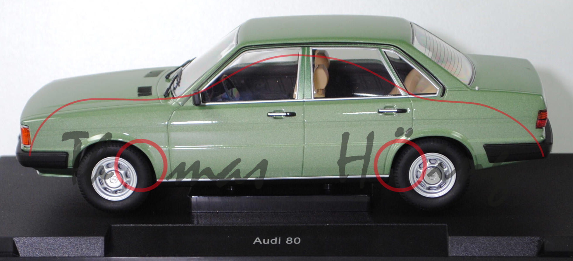 Audi 80 CL (2. Generation, Baureihe 80 Limousine, interne Baureihenbezeichnung B2, Typ 81, viertürige Stufenhecklimousine mit 5 Sitzplätzen, Vorfacelift (VFL), Kühlergrill und Frontscheinwerfer gerade stehend, einteilige breite Rückleuchten, Ladekante zum Kofferraum auf der gesamten Breite oberhalb der Rückleuchten, Ausstattungslinie CL: Ablagekästen an den vorderen Türen + Make-up Spiegel in der Sonnenblende der Beifahrerseite + Türkontaktschalter an den hinteren Türen, Frontantrieb, Motor: Audi Typ VW EA827 wassergekühlter Vierzylinder-Reihen-Viertakt-Otto mit Keihin 26/30 DC Registervergaser und eine obenliegende Nockenwelle (OHC = Overhead Camshaft) sowie 2 Ventile pro Zylinder und 1296 cm³ und 60 PS (Motorkennbuchstabe EP, 1981-1984) / Audi Typ VW EA827 wassergekühlter Vierzylinder-Reihen-Viertakt-Otto mit Pierburg 1B3 Vergaser und eine obenliegende Nockenwelle (OHC = Overhead Camshaft) sowie 2 Ventile pro Zylinder und 1577 cm³ und 75 PS (Motorkennbuchstabe YN oder WV, 1981-1983) / Audi Typ VW EA827 wassergekühlter Vierzylinder-Reihen-Viertakt-Otto mit Pierburg 2E2 Vergaser und eine obenliegende Nockenwelle (OHC = Overhead Camshaft) sowie 2 Ventile pro Zylinder und 1595 cm³ und 75 PS (Motorkennbuchstabe DT, 1983-1984) / Audi Typ VW EA827 wassergekühlter Vierzylinder-Reihen-Viertakt-Otto mit Solex Pierburg 2B5 Vergaser und eine obenliegende Nockenwelle (OHC = Overhead Camshaft) sowie 2 Ventile pro Zylinder und 1588 cm³ und 85 PS (Motorkennbuchstabe YP, 1981-1984) / Audi Typ VW EA827 wassergekühlter Vierzylinder-Reihen-Viertakt-Otto mit Pierburg 2E2 Vergaser und eine obenliegende Nockenwelle (OHC = Overhead Camshaft) sowie 2 Ventile pro Zylinder und 1781 cm³ und 90 PS (Motorkennbuchstabe DS, 1983-1984), Radstand 2538 mm, Länge 4383 mm, Modell 1981-1984), topasgrünmetallic (Verkaufskennzeichen Y3, Lacknummer LD6Y), innen hell-graubraun/beige, Sitze beige (vgl. Kunstleder-Sitzbezug sand beim Original, Verkaufskennzeichen MT), Lenkrad schwarz, Audi Stahl-Lochscheibenräder mit Tiefbettfelgen im 8-Loch-Design Größe 5 J x 13 H2 ET 45 mit Lochkreis 4 x 100 (Teilenummer 321 601 025 K, Farbcode silber) und Radzierdeckel / Radzierkappe (Teilenummer 811 601 151 A, Farbcode chrom) sowie Reifen 155 SR 13 (60 PS) / 165 SR 13 (75 PS) / 175/70 SR 13 (85 und 90 PS), MODELCAR GROUP, 1:18, mb (Limited Edition) (EAN 4052176824498)
