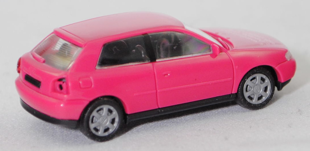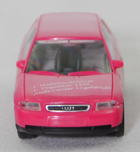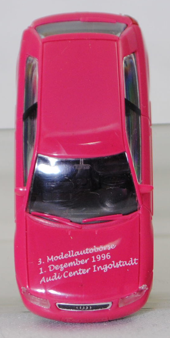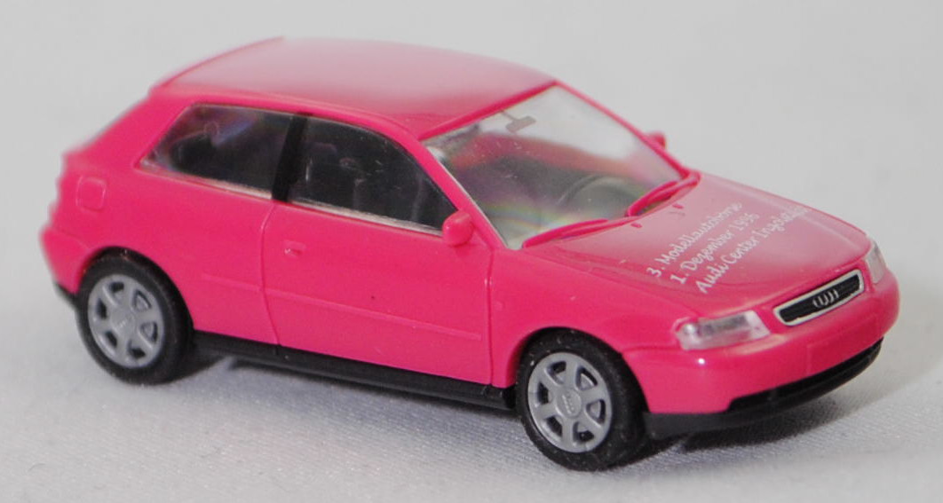 Audi A3 1.8 T 3-türig (8L, Modell 1996-2000), erikaviolett, 3. Modellautobörse / 1. Dezember 1996 / Audi Center Ingolstadt, Rietze, 1:87, Werbebox (Rückleuchte rechts weg)