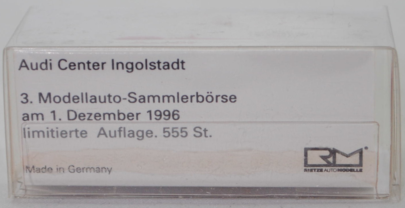 Audi A3 1.8 T 3-türig (1. Generation, Baureihe A3, interne Baureihenbezeichnung 8L, Typ 8L1, dreitürige Schräghecklimousine mit 5 Sitzplätzen, Vorfacelift, orange Blinker vorne und an den vorderen Kotflügeln, nur Rückfahrscheinwerfer unter Weißglas, 5-Gang-Schaltgetriebe, Frontantrieb, Motor: VW Typ EA113 wassergekühlter Vierzylinder-Reihen-Viertakt-Turbo-Otto mit Multi-Point-Einspritzung und zwei obenliegende Nockenwellen (DOHC = Double Overhead Camshaft) sowie 5 Ventile pro Zylinder und Ladeluftkühler sowie 1781 cm³ und 150 PS, Radstand 2513 mm, Länge 4152 mm, Modell 1996-2000), erikaviolett, innen schwarz, Sitze schwarz, Lenkrad schwarz, Druck 3. Modellautobörse / 1. Dezember 1996 / Audi Center Ingolstadt in reinweiß auf der Motoehaube, Audi Aluminium-Leichtbauräder im 6-Speichen-Design Größe 6 J x 15 ET 38 mit Lochkreis 5 x 100 (Teilenummer 8L0 601 025F) und Nabendeckel (Teilenummer 8L0 601 165 A Z17 avussilber) sowie Reifen 195/65 R 15 V, Rietze, 1:87, Werbeschachtel (Limited Edition 555 Stück zur 3. Modellauto-Sammlerbörse am 01. Dezember 1996, Rückleuchte rechts weg, Schachtel vergilbt und mit Lagerspuren) (EAN 4037748107803)