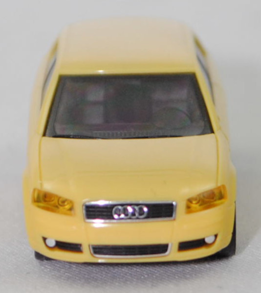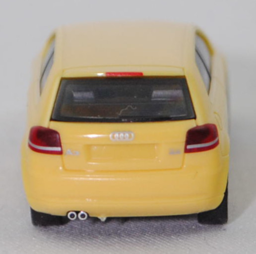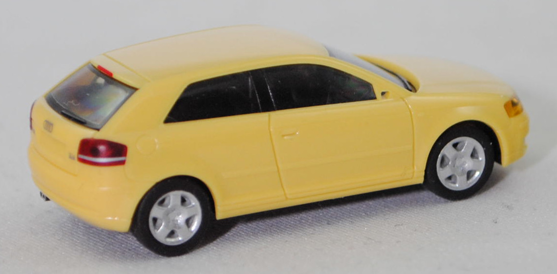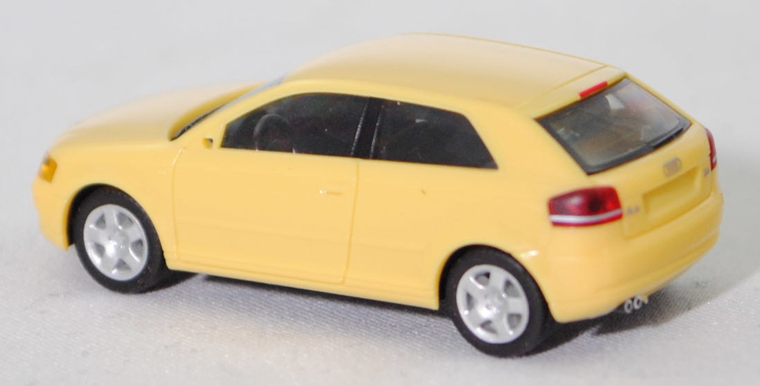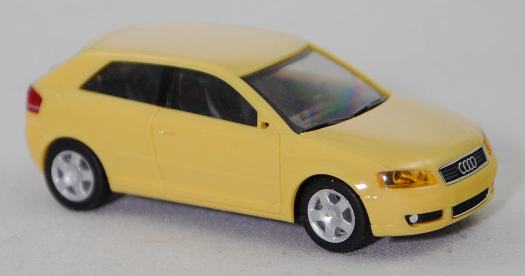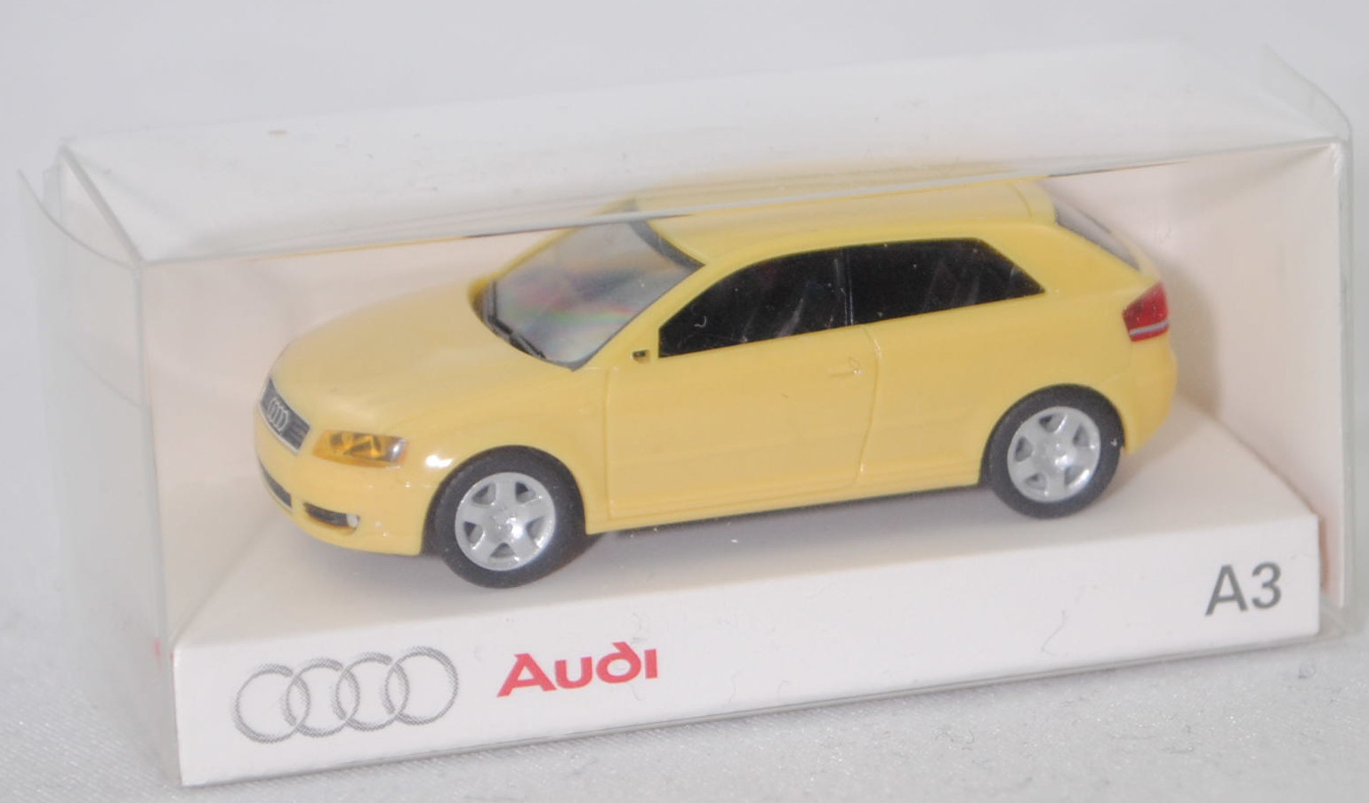 Audi A3 Ambition 3.2 quattro 3-türig (2. Generation, Baureihe A3, interne Baureihenbezeichnung 8P, dreitürige Schräghecklimousine mit 5 Sitzplätzen, Vorfacelift, Kühlergrill zwischen den Frontscheinwerfern, Stoßfänger vorne mit 3 Lüftungsschlitzen, Ausstattungslinie Ambition: Halogen Nebelscheinwerfer + Fahrerinformationssystem inclusive Funkuhr + Dekoreinlagen hochglanz + Sportlenkrad im 3-Speichen-Design + Sportschaltknauf mit Schalthebelmanschette und Handbremsgriff in Leder + Sportsitze vorne mit Sitzbezüge in Stoff Matrix + Beifahrersitz höhenverstellbar + Sportfahrwerk (Karosserie um 15 mm abgesenkt) + Aluminium-Gussräder im 5-Arm-Design Größe 7,5 J x 17 mit Reifen 225/45 R 17, 6-Gang-Schaltgetriebe, permanenter Allradantrieb quattro® mit elektronisch geregelter Lamellenkupplung, Motor: Audi Typ VW EA390 wassergekühlter Sechszylinder-VR-Viertakt-Otto mit vollelektronischer sequentieller Saugrohreinspritzung und zwei obenliegende Nockenwellen (DOHC = Double Overhead Camshaft) sowie 4 Ventile pro Zylinder und 3189 cm³ sowie 250 PS, Radstand 2578 mm, Länge 4203 mm, Modell 2003-2005), tukangelb (Verkaufskennzeichen 9N, Lacknummer LY1H), innen schwarz, Sitze schwarz, Lenkrad schwarz, Audi Aluminium-Gussräder im 5-Arm-Design Größe 7,5 J x 17 H2 ET 56 mit Lochkreis 5 x 112 (Teilenummer 8P0 601 025 E, Farbcode 1H7 Le Mans silber) und Nabendeckel (Teilenummer 4B0 601 170, Farbcode 7ZJ matt graumetallic) sowie Reifen 225/45 ZR 17 91Y, Herpa, 1:87, Werbeschachtel (Limited Edition quattro GmbH 85045 Ingolstadt, Audi authentic collection, Vitrinenmodell, Frontscheinwerfer vergilbt, Schachtel mit Lagerspuren, Außenspiegel liegen los bei) (EAN 2050000030598)