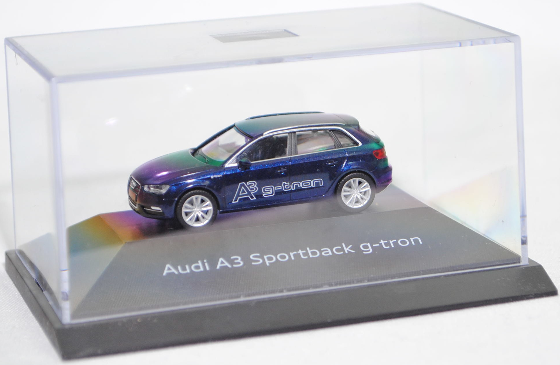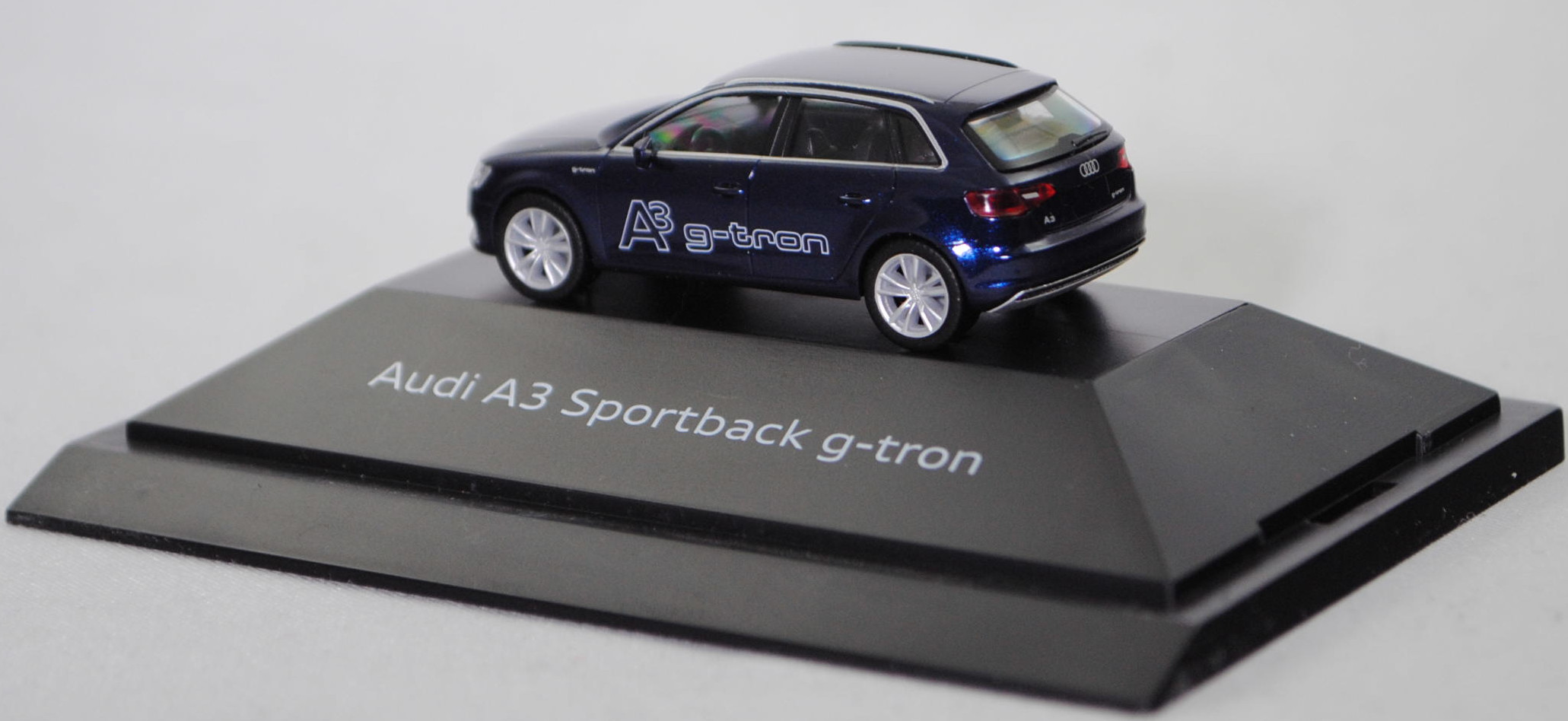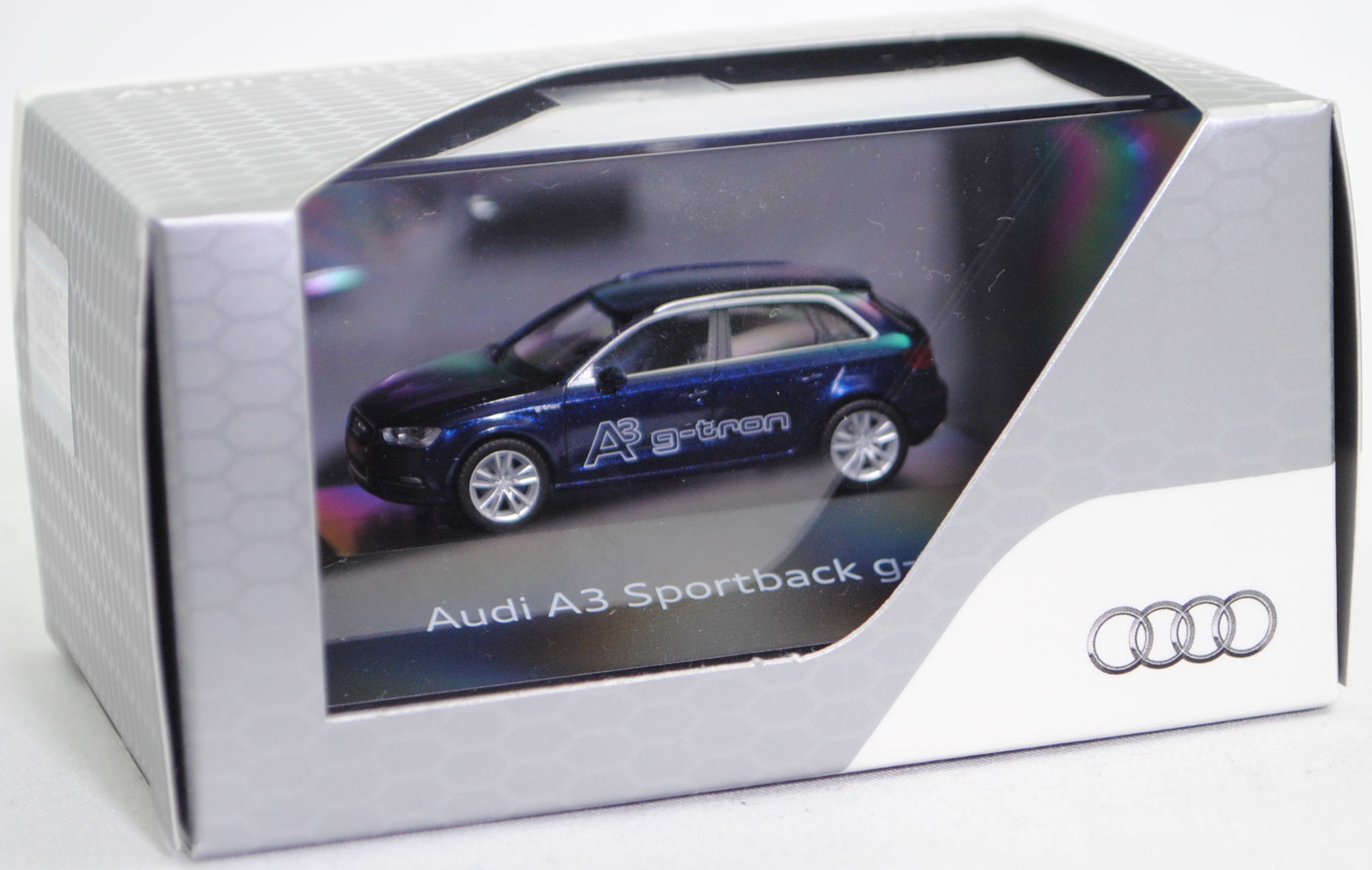 Audi A3 Sportback 1.4 TFSI g-tron Ambition (3. Generation, Baureihe A3 Sportback g-tron, interne Baureihenbezeichnung 8VA, fünftürige Schräghecklimousine mit 5 Sitzplätzen, Vorfacelift, Frontscheinwerfer unten im Außenbereich leicht abgerundet, Singleframe-Kühlergrill mit 7 Einzellamellen und an den oberen Ecken leicht abgeschrägt, Stoßfänger vorne mit Lüftungsöffnungen auf Scheinwerferbreite im Außenbereich und mittig unten mit trapezförmiger Lüftungsöffnung, schmale rechteckige Rückfahrscheinwerfer im hervorstehenden Teil der Heckklappe außen über dem Nummernschild positioniert, Stoßfänger hinten mit umlaufender Sicke im unteren Bereich und ohne Rückstrahler, Ausstattungslinie Ambition: Halogen Frontscheinwerfer + Nebelscheinwerfer + Innenspiegel abblendbar + Sonnenblenden für Fahrer und Beifahrer klapp- und schwenkbar mit abdeckbarem Make-up-Spiegel + Klimaanlage manuell + Sportlederlenkrad im 3-Speichen-Design + Sportsitze vorne + Sitzbezüge Stoff Rallye + Dekoreinlagen in Türverkleidungen und Schalttafel micrometallic silber + Dachkantenspoiler + ohne sichtbare Auspuff Endrohrblenden (nur bei g-tron), Sonderausstattung gegen Mehrpreis: Mittelarmlehne vorne + Glanzpaket mit Dachzierleisten sowie Seitenscheibenumfassung und Fensterschachtleisten in Aluminium eloxiert, weitere Sonderausstattung gegen Mehrpreis: S line Sportpaket bestehend aus: Audi Aluminium-Gussräder im 5-Parallelspeichen-Design (S-Design) teilpoliert Größe 7,5 J x 18 mit Reifen 225/40 R 18 + S line-Schriftzüge an den vorderen Kotflügeln sowie den Einstiegsleisten + Innenraum schwarz + S line-Dekoreinlagen in Aluminium matt gebürstet + Schalthebel in perforiertem Leder schwarz + Make-up-Spiegel beleuchtet + Sitzbezüge in Stoff Biathlon/Leder in schwarz mit S line-Prägung in den Lehnen der Vordersitze, 6-Gang-Schaltgetriebe, Frontantrieb, Motor (bivalent ausgelegt = Motor kann zwei verschiedene Kraftstoffe nutzen, hier: Benzin und Erdgas (CNG)): Audi Typ VW EA211 wassergekühlter Vierzylinder-Reihen-Viertakt-Turbo-Otto mit Direkteinspritzung und zwei obenliegende Nockenwellen (DOHC = Double Overhead Camshaft) sowie 4 Ventile pro Zylinder und 1395 cm³ sowie 110 PS, Motorkennbuchstabe CPWA, Radstand 2636 mm, Länge 4310 mm, Modell 2014-2016), estorilblau kristall perleffekt (Verkaufskennzeichen K0, Lacknummer LX5P), innen schwarz, Sitze schwarz, Lenkrad schwarz, Druck A3 g-tron in reinweiß auf den Türen, Audi Aluminium-Gussräder im 5-Parallelspeichen-Design (S-Design) teilpoliert Größe 7,5 J x 18 H2 ET 51 mit Lochkreis 5 x 112 (Teilenummer 8V0 601 025 BL, Farbcode 8Z8/K80 brillantsilber metallic/glanzgedreht) und Nabendeckel / Radzierkappe (Teilenummer 4F0 601 165 N, Farbcode grau) sowie Reifen 225/40 ZR 18 92Y, Herpa, 1:87, PC-Box Werbeschachtel (Limited Edition quattro GmbH 85045 Ingolstadt, Audi collection) (Vitrinenmodell, Schachtel mit Lagerspuren) (EAN 2160000024470)
