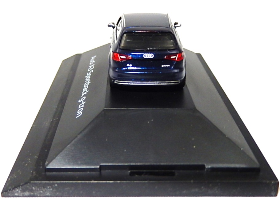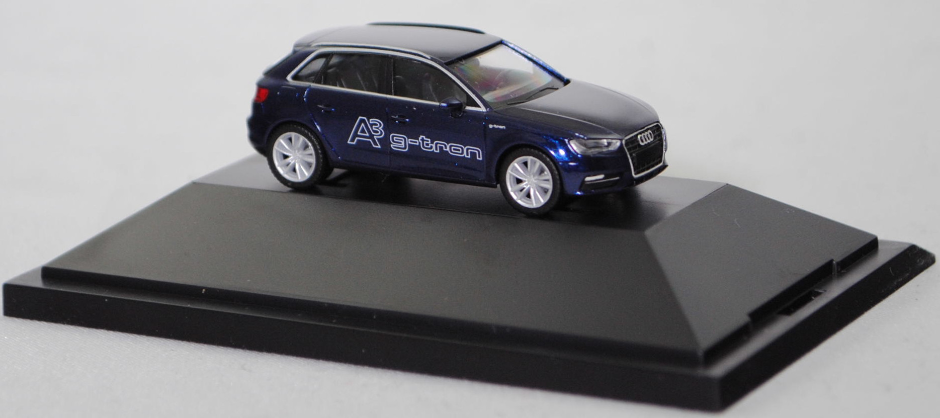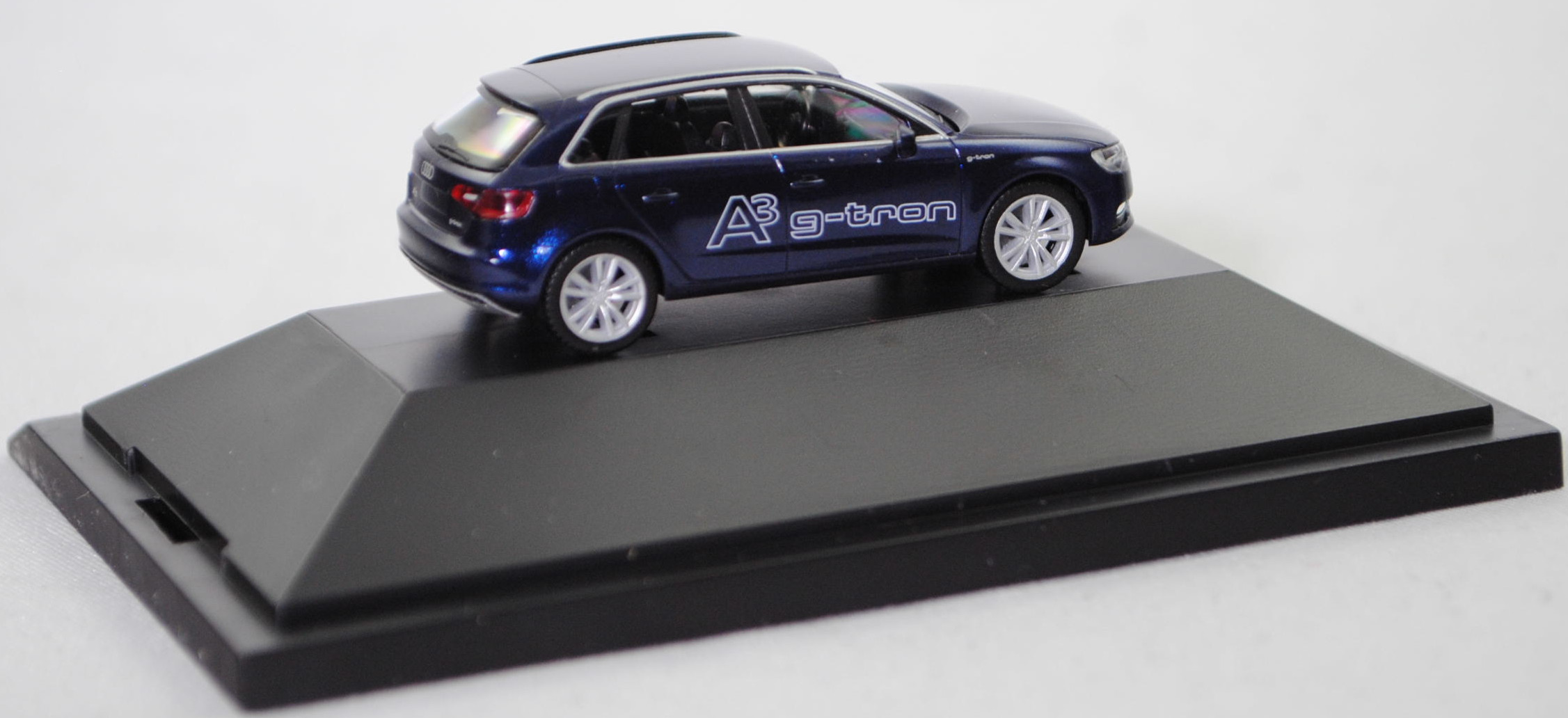 Audi A3 Sportback 1.4 TFSI g-tron Ambition (3. Generation, Baureihe A3 Sportback g-tron, interne Baureihenbezeichnung 8VA, fünftürige Schräghecklimousine mit 5 Sitzplätzen, Vorfacelift, Frontscheinwerfer unten im Außenbereich leicht abgerundet, Singleframe-Kühlergrill mit 7 Einzellamellen und an den oberen Ecken leicht abgeschrägt, Stoßfänger vorne mit Lüftungsöffnungen auf Scheinwerferbreite im Außenbereich und mittig unten mit trapezförmiger Lüftungsöffnung, schmale rechteckige Rückfahrscheinwerfer im hervorstehenden Teil der Heckklappe außen über dem Nummernschild positioniert, Stoßfänger hinten mit umlaufender Sicke im unteren Bereich und ohne Rückstrahler, Ausstattungslinie Ambition: Halogen Frontscheinwerfer + Nebelscheinwerfer + Innenspiegel abblendbar + Sonnenblenden für Fahrer und Beifahrer klapp- und schwenkbar mit abdeckbarem Make-up-Spiegel + Klimaanlage manuell + Sportlederlenkrad im 3-Speichen-Design + Sportsitze vorne + Sitzbezüge Stoff Rallye + Dekoreinlagen in Türverkleidungen und Schalttafel micrometallic silber + Dachkantenspoiler + ohne sichtbare Auspuff Endrohrblenden (nur bei g-tron), Sonderausstattung gegen Mehrpreis: Mittelarmlehne vorne + Glanzpaket mit Dachzierleisten sowie Seitenscheibenumfassung und Fensterschachtleisten in Aluminium eloxiert, weitere Sonderausstattung gegen Mehrpreis: S line Sportpaket bestehend aus: Audi Aluminium-Gussräder im 5-Parallelspeichen-Design (S-Design) teilpoliert Größe 7,5 J x 18 mit Reifen 225/40 R 18 + S line-Schriftzüge an den vorderen Kotflügeln sowie den Einstiegsleisten + Innenraum schwarz + S line-Dekoreinlagen in Aluminium matt gebürstet + Schalthebel in perforiertem Leder schwarz + Make-up-Spiegel beleuchtet + Sitzbezüge in Stoff Biathlon/Leder in schwarz mit S line-Prägung in den Lehnen der Vordersitze, 6-Gang-Schaltgetriebe, Frontantrieb, Motor (bivalent ausgelegt = Motor kann zwei verschiedene Kraftstoffe nutzen, hier: Benzin und Erdgas (CNG)): Audi Typ VW EA211 wassergekühlter Vierzylinder-Reihen-Viertakt-Turbo-Otto mit Direkteinspritzung und zwei obenliegende Nockenwellen (DOHC = Double Overhead Camshaft) sowie 4 Ventile pro Zylinder und 1395 cm³ sowie 110 PS, Motorkennbuchstabe CPWA, Radstand 2636 mm, Länge 4310 mm, Modell 2014-2016), estorilblau kristall perleffekt (Verkaufskennzeichen K0, Lacknummer LX5P), innen schwarz, Sitze schwarz, Lenkrad schwarz, Druck A3 g-tron in reinweiß auf den Türen, Audi Aluminium-Gussräder im 5-Parallelspeichen-Design (S-Design) teilpoliert Größe 7,5 J x 18 H2 ET 51 mit Lochkreis 5 x 112 (Teilenummer 8V0 601 025 BL, Farbcode 8Z8/K80 brillantsilber metallic/glanzgedreht) und Nabendeckel / Radzierkappe (Teilenummer 4F0 601 165 N, Farbcode grau) sowie Reifen 225/40 ZR 18 92Y, Herpa, 1:87, PC-Box Werbeschachtel (Limited Edition quattro GmbH 85045 Ingolstadt, Audi collection) (Vitrinenmodell, Schachtel mit Lagerspuren) (EAN 2160000024470)