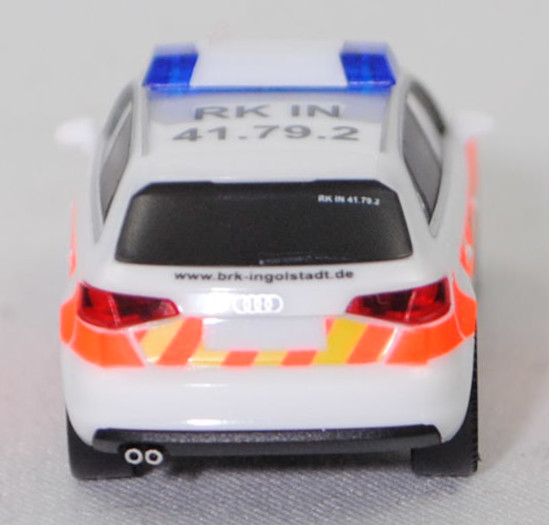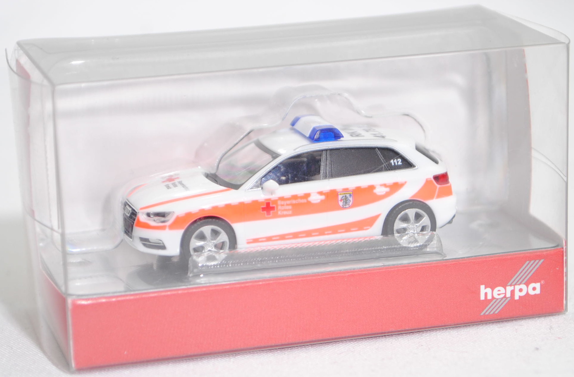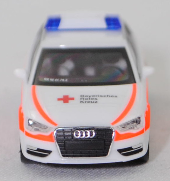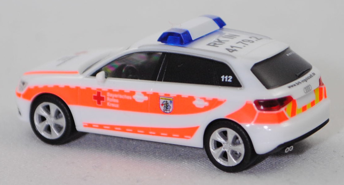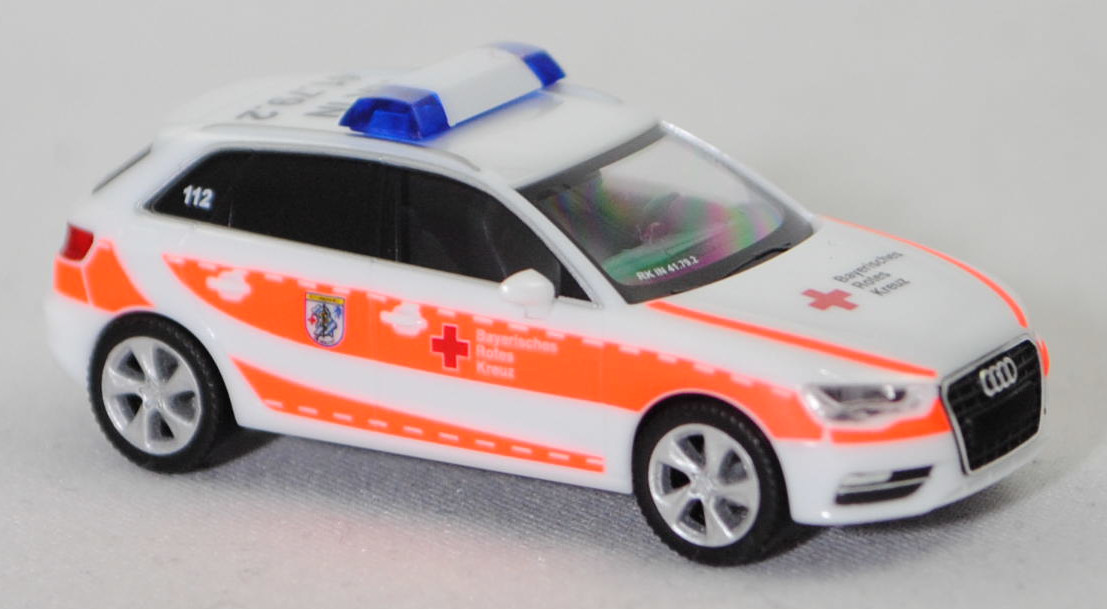 Audi A3 Sportback 1.4 TFSI / 1.4 TFSI cod / 1.8 TFSI / 2.0 TDI / 2.0 TDI clean diesel Ambiente (3. Generation, Baureihe A3 Sportback, interne Baureihenbezeichnung 8VA, fünftürige Schräghecklimousine mit 5 Sitzplätzen, Vorfacelift, Frontscheinwerfer unten im Außenbereich leicht abgerundet, Singleframe-Kühlergrill mit 7 Einzellamellen und an den oberen Ecken leicht abgeschrägt, Stoßfänger vorne mit Lüftungsöffnungen auf Scheinwerferbreite im Außenbereich und mittig unten mit trapezförmiger Lüftungsöffnung, schmale rechteckige Rückfahrscheinwerfer im hervorstehenden Teil der Heckklappe außen über dem Nummernschild positioniert, Stoßfänger hinten mit umlaufender Sicke im unteren Bereich und ohne Rückstrahler, Ausstattungslinie Ambiente: Halogen Frontscheinwerfer + Lichtpaket + Normalsitze vorne + Make-up-Spiegel für Fahrer und Beifahrer beleuchtet + Lederlenkrad im 4-Speichen-Design + Mittelarmlehne vorne + Sitzbezüge Stoff Regatta/mono.pur + Dekoreinlagen in Türverkleidungen und Schalttafel 3D-Optik Luv + Glanzpaket mit Dachzierleisten sowie Seitenscheibenumfassung und Fensterschachtleisten in Aluminium eloxiert + Geschwindigkeitsregelanlage + Einparkhilfe hinten + Auspuff Endrohrblenden verchromt, Sonderausstattung gegen Mehrpreis: Nebelscheinwerfer + Audi Aluminium-Gussräder 18 Zoll im 5-Arm-Dynamik-Design anthrazit teilpoliert, 6-Gang-Schaltgetriebe, Frontantrieb, Motor mit 2 Abgasendrohren links: Audi Typ VW EA211 wassergekühlter Vierzylinder-Reihen-Viertakt-Turbo-Otto mit Direkteinspritzung und zwei obenliegende Nockenwellen (DOHC = Double Overhead Camshaft) sowie 4 Ventile pro Zylinder und 1395 cm³ sowie 122 PS (1.4 TFSI, Motorkennbuchstabe CMBA / CXSA) / Audi Typ VW EA211 wassergekühlter Vierzylinder-Reihen-Viertakt-Turbo-Otto mit Direkteinspritzung und zwei obenliegende Nockenwellen (DOHC = Double Overhead Camshaft) sowie 4 Ventile pro Zylinder und 1395 cm³ sowie 140 PS (1.4 TFSI cod (cylinder on demand), Motorkennbuchstabe CPTA) / Audi Typ VW EA888 wassergekühlter Vierzylinder-Reihen-Viertakt-Turbo-Otto mit Benzindirekteinspritzung und zwei obenliegende Nockenwellen (DOHC = Double Overhead Camshaft) sowie 4 Ventile pro Zylinder und Ladeluftkühler sowie 1798 cm³ und 180 PS (1.8 TFSI, Motorkennbuchstabe CJSA / CJSB) / Audi Typ VW EA288 wassergekühlter Vierzylinder-Reihen-Viertakt-Turbo-Diesel mit Common-Rail-Einspritzung und zwei obenliegende Nockenwellen (DOHC = Double Overhead Camshaft) sowie 4 Ventile pro Zylinder und Ladeluftkühler sowie 1968 cm³ und 150 PS (2.0 TDI, Motorkennbuchstabe DBGA / DEJA / CRLB / DCYA) / Audi Typ VW EA288 wassergekühlter Vierzylinder-Reihen-Viertakt-Turbo-Diesel mit Common-Rail-Einspritzung und zwei obenliegende Nockenwellen (DOHC = Double Overhead Camshaft) sowie 4 Ventile pro Zylinder und Ladeluftkühler sowie 1968 cm³ und 184 PS (2.0 TDI clean diesel, Motorkennbuchstabe CUPA / CUNA), Radstand 2636 mm, Länge 4310 mm, Modell 2013-2016) BRK Ingolstadt, ibisweiß (Verkaufskennzeichen T9, Lacknummer LY9C), innen schwarz, Sitze schwarz, Lenkrad schwarz, Druck rotes Kreuz und Streifen in leuchtorange auf den Seiten wobei Bayerisches / Rotes / Kreuz in Wagenfarbe durchschimmert, zusätzlicher Druck Wappen BRK Rettungsdienst - Kreisverband Ingolstadt in schwarz/gelb/blau/weiß auf den hinteren Türen, Druck rotes Kreuz und Bayerisches / Rotes / Kreuz in schwarz und zwei Streifen in leuchtorange auf der Motorhaube, Druck RK IN / 41.79.2 in schwarz hinten auf dem Dach, Druck www.brk-ingolstadt.de in schwarz und Streifen in leuchtorange/schwefelgelb auf der Heckklappe, Druck Funkrufname RK IN 41.79.2 in reinweiß unten rechts auf der Windschutzscheibe, Druck 112 in reinweiß auf den hinteren Dreiecksscheiben, Blaulichtleiste auf dem Dach, Audi Aluminium-Gussräder 18 Zoll im 5-Arm-Dynamik-Design anthrazit teilpoliert Größe 7,5 J x 18 H2 ET 51 mit Lochkreis 5 x 112 (Teilenummer 8V0 601 025 CC, Farbcode JG3/K80 kontrastgrau, teilpoliert) und Nabendeckel / Radzierkappe (Teilenummer 4F0 601 165 N, Farbcode grau) sowie Reifen 225/40 ZR 18 92Y, Herpa, 1:87, mb (Vitrinenmodell, Schachtel mit Lagerspuren) (EAN 4013150091268)