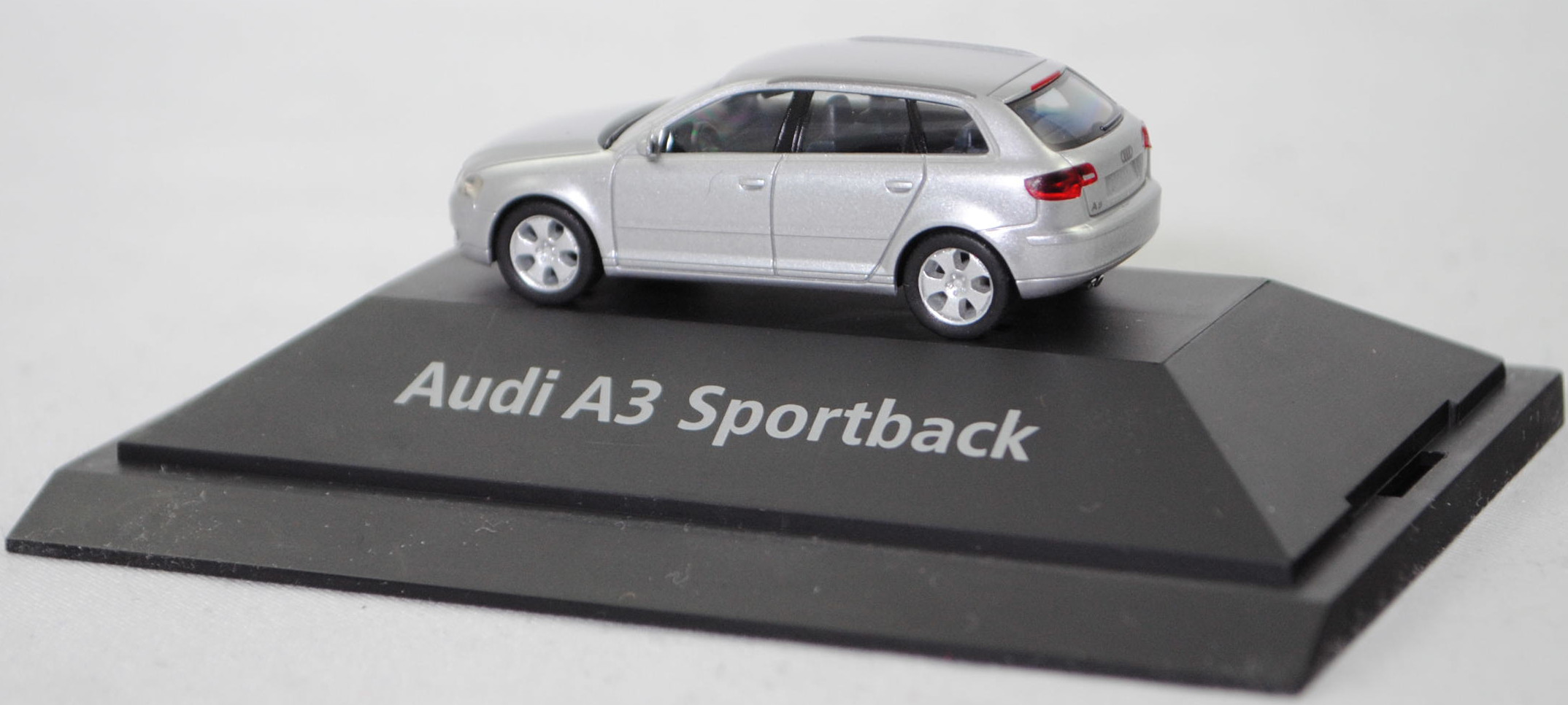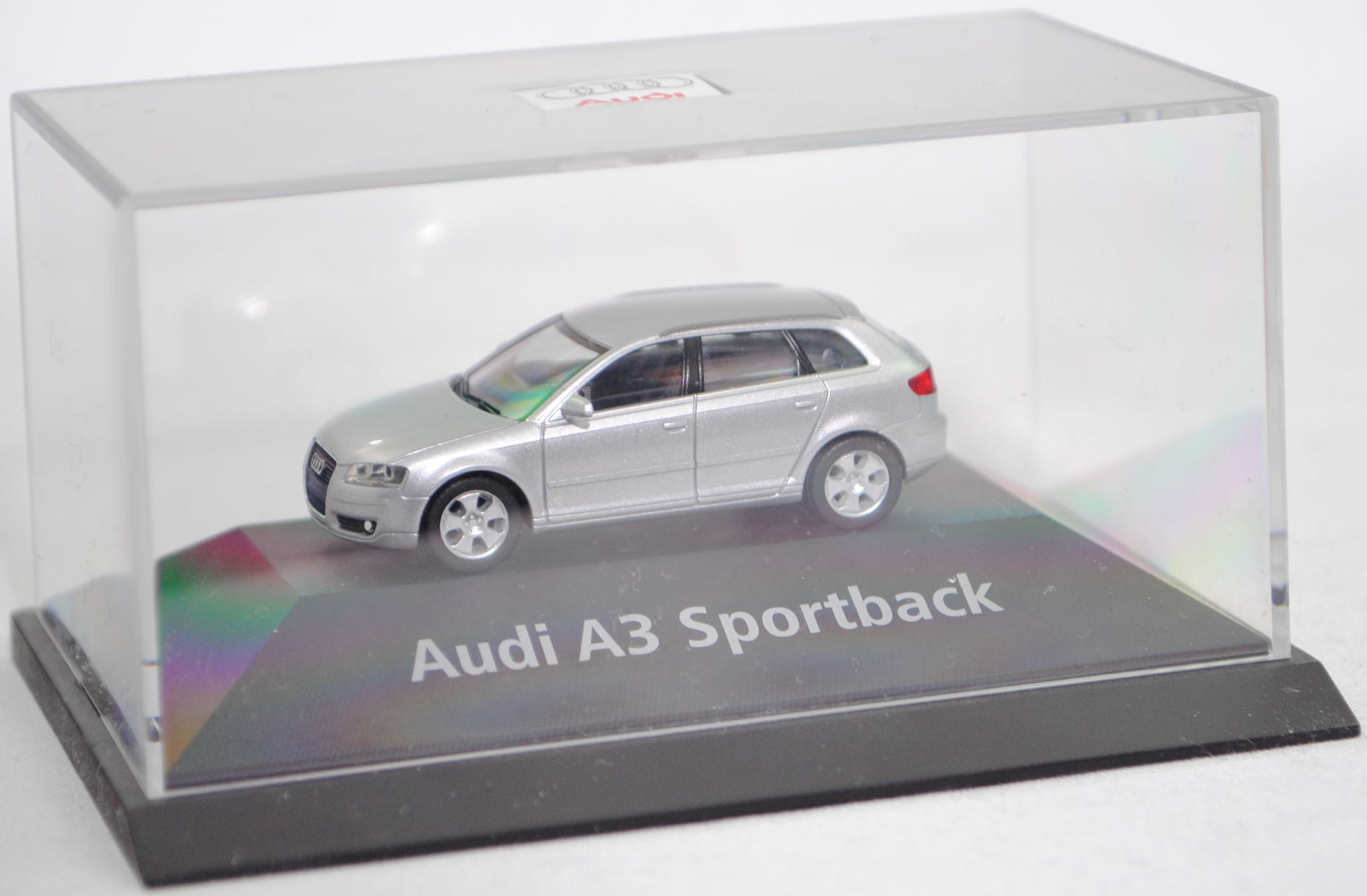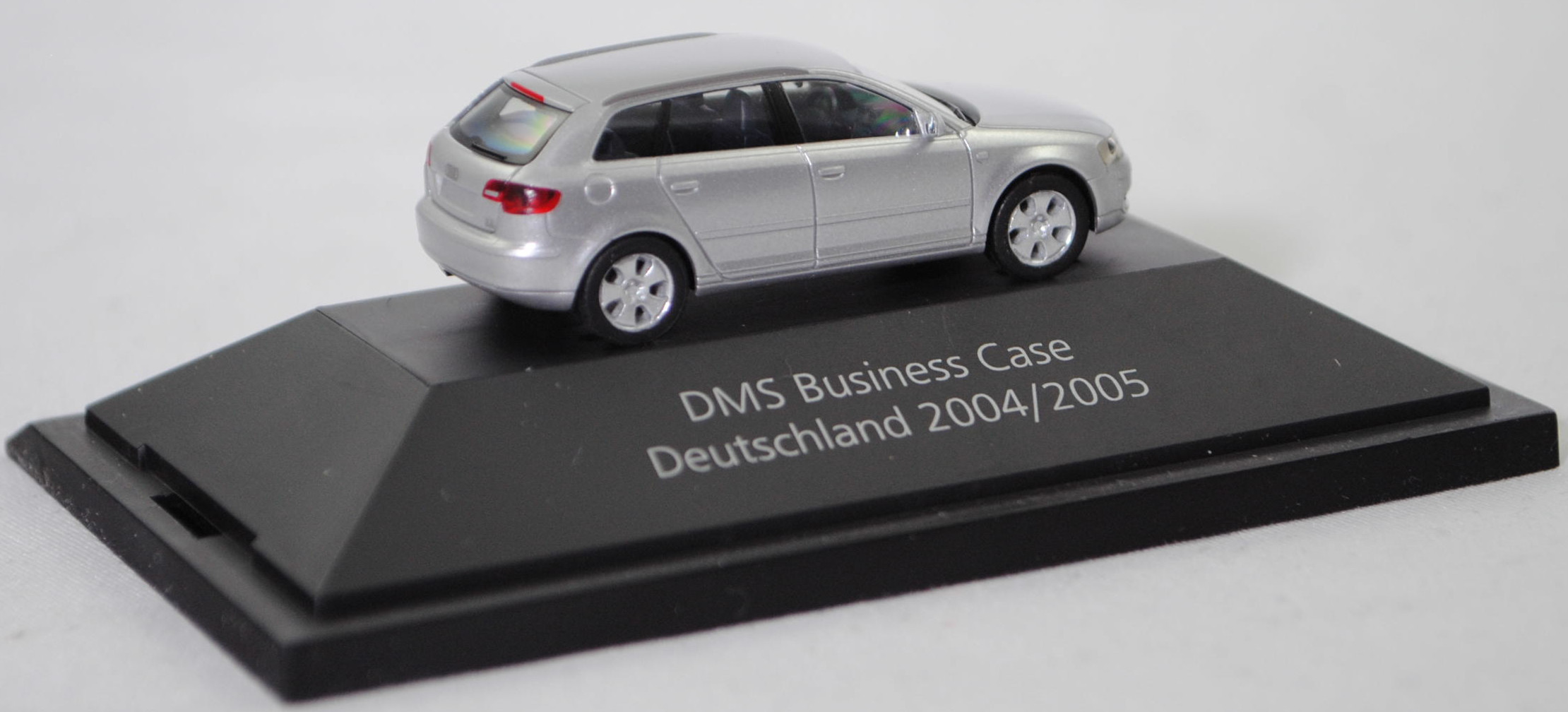 Audi A3 Sportback Ambition 3.2 quattro (2. Generation, Baureihe A3 Sportback, interne Baureihenbezeichnung 8PA facelift 1, fünftürige Schräghecklimousine mit 5 Sitzplätzen, entspricht Facelift 1 der Limousine von 2005, mit Singleframe-Kühlergrill, Stoßfänger vorne mit zusätzlichen Stoßleisten unter den Frontscheinwerfern, Stoßfänger hinten mit zusätzlichen Stoßleisten im oberen Bereich, äußere Einsätze im Stoßfänger mit Nebelscheinwerfer ganz außen und 2 waagerechten Lamellen daneben, 5 Lüftungsschlitze mittig unter dem Singleframe-Kühlergrill, Blinker hinten mit roter Verglasung unten angeordnet, Lenkrad im Singleframe-Design, Ausstattungslinie Ambition: Halogen Nebelscheinwerfer + Fahrerinformationssystem inclusive Funkuhr + Dekoreinlagen hochglanz + Sportlenkrad im 3-Speichen-Design + Sportschaltknauf mit Schalthebelmanschette und Handbremsgriff in Leder + Sportsitze vorne mit Sitzbezüge in Stoff Matrix + Beifahrersitz höhenverstellbar + Sportfahrwerk (Karosserie um 15 mm abgesenkt) + Aluminium-Gussräder im 5-Arm-Design Größe 7,5 J x 17 mit Reifen 225/45 R 17, 6-Gang-Schaltgetriebe, permanenter Allradantrieb quattro® mit elektronisch geregelter Lamellenkupplung, Motor: Audi Typ VW EA390 wassergekühlter Sechszylinder-VR-Viertakt-Otto mit vollelektronischer sequentieller Saugrohreinspritzung und zwei obenliegende Nockenwellen (DOHC = Double Overhead Camshaft) sowie 4 Ventile pro Zylinder und 3189 cm³ sowie 250 PS, Radstand 2578 mm, Länge 4203 mm, Modell 2004-2008), lichtsilber metallic (Verkaufskennzeichen 5B, Lacknummer LY7W), innen schwarz, Sitze schwarz, Lenkrad schwarz, Audi Aluminium-Gussräder im 5-Arm-Design Größe 7,5 J x 17 H2 ET 56 mit Lochkreis 5 x 112 (Teilenummer 8P0 601 025 C, Farbcode Z17 avussilber) und Nabendeckel / Radzierkappe (Teilenummer 8D0 601 170, Farbcode Z17 avussilber) sowie Reifen 225/45 ZR 17 91Y, Herpa, 1:87, PC-Box Werbeschachtel (Limited Edition quattro GmbH 85045 Ingolstadt, Audi collection, zusätzlicher Druck DMS Business Case / Deutschland 2004/2005 in silber auf dem Sockel der PC-Box) (Vitrinenmodell, Schachtel mit Lagerspuren, Umverpackung weg) (EAN 2050000034817)