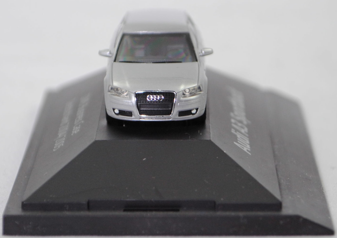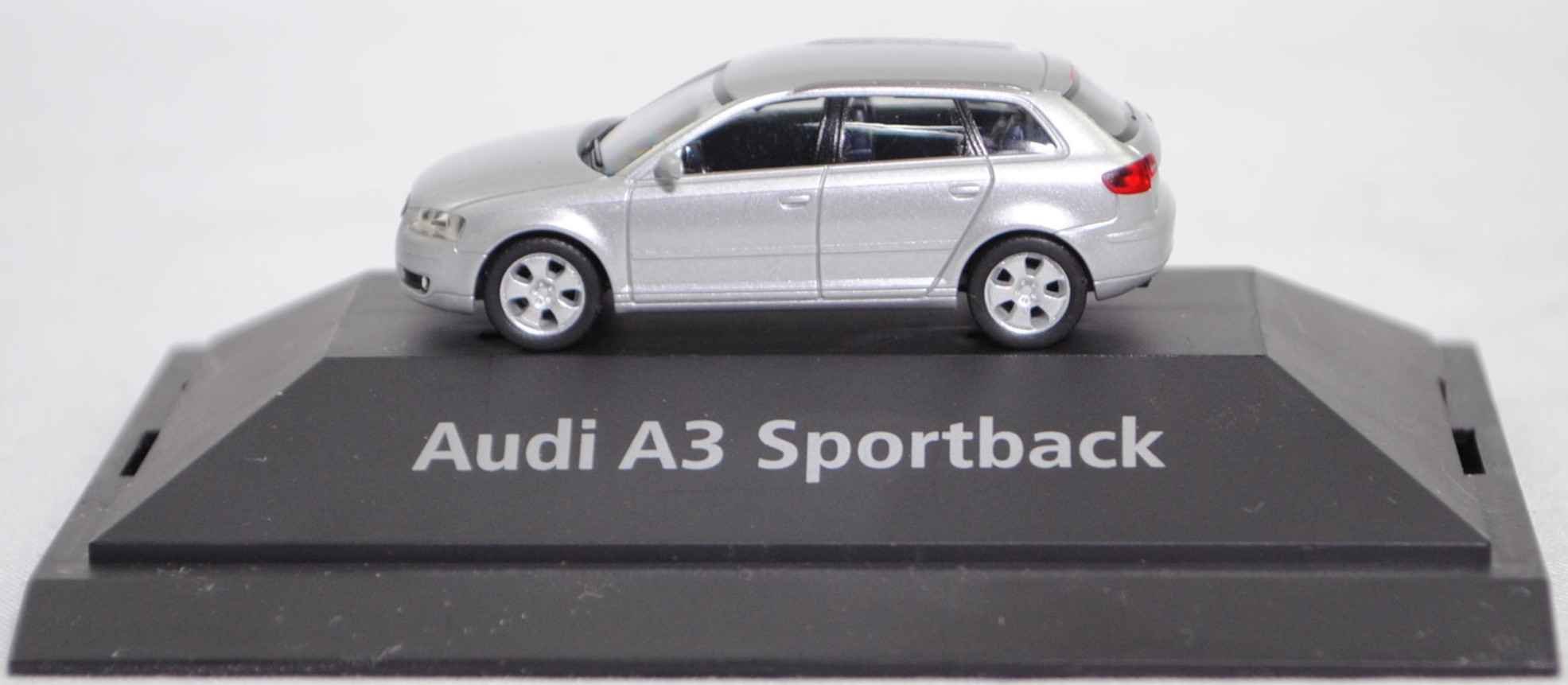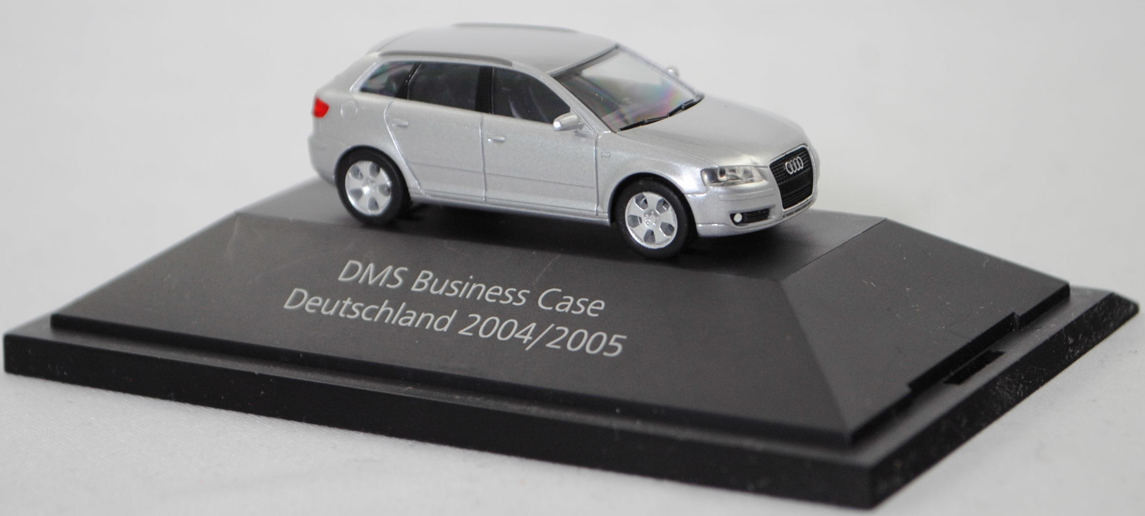 Audi A3 Sportback Ambition 3.2 quattro (2. Generation, Baureihe A3 Sportback, interne Baureihenbezeichnung 8PA facelift 1, fünftürige Schräghecklimousine mit 5 Sitzplätzen, entspricht Facelift 1 der Limousine von 2005, mit Singleframe-Kühlergrill, Stoßfänger vorne mit zusätzlichen Stoßleisten unter den Frontscheinwerfern, Stoßfänger hinten mit zusätzlichen Stoßleisten im oberen Bereich, äußere Einsätze im Stoßfänger mit Nebelscheinwerfer ganz außen und 2 waagerechten Lamellen daneben, 5 Lüftungsschlitze mittig unter dem Singleframe-Kühlergrill, Blinker hinten mit roter Verglasung unten angeordnet, Lenkrad im Singleframe-Design, Ausstattungslinie Ambition: Halogen Nebelscheinwerfer + Fahrerinformationssystem inclusive Funkuhr + Dekoreinlagen hochglanz + Sportlenkrad im 3-Speichen-Design + Sportschaltknauf mit Schalthebelmanschette und Handbremsgriff in Leder + Sportsitze vorne mit Sitzbezüge in Stoff Matrix + Beifahrersitz höhenverstellbar + Sportfahrwerk (Karosserie um 15 mm abgesenkt) + Aluminium-Gussräder im 5-Arm-Design Größe 7,5 J x 17 mit Reifen 225/45 R 17, 6-Gang-Schaltgetriebe, permanenter Allradantrieb quattro® mit elektronisch geregelter Lamellenkupplung, Motor: Audi Typ VW EA390 wassergekühlter Sechszylinder-VR-Viertakt-Otto mit vollelektronischer sequentieller Saugrohreinspritzung und zwei obenliegende Nockenwellen (DOHC = Double Overhead Camshaft) sowie 4 Ventile pro Zylinder und 3189 cm³ sowie 250 PS, Radstand 2578 mm, Länge 4203 mm, Modell 2004-2008), lichtsilber metallic (Verkaufskennzeichen 5B, Lacknummer LY7W), innen schwarz, Sitze schwarz, Lenkrad schwarz, Audi Aluminium-Gussräder im 5-Arm-Design Größe 7,5 J x 17 H2 ET 56 mit Lochkreis 5 x 112 (Teilenummer 8P0 601 025 C, Farbcode Z17 avussilber) und Nabendeckel / Radzierkappe (Teilenummer 8D0 601 170, Farbcode Z17 avussilber) sowie Reifen 225/45 ZR 17 91Y, Herpa, 1:87, PC-Box Werbeschachtel (Limited Edition quattro GmbH 85045 Ingolstadt, Audi collection, zusätzlicher Druck DMS Business Case / Deutschland 2004/2005 in silber auf dem Sockel der PC-Box) (Vitrinenmodell, Schachtel mit Lagerspuren, Umverpackung weg) (EAN 2050000034817)