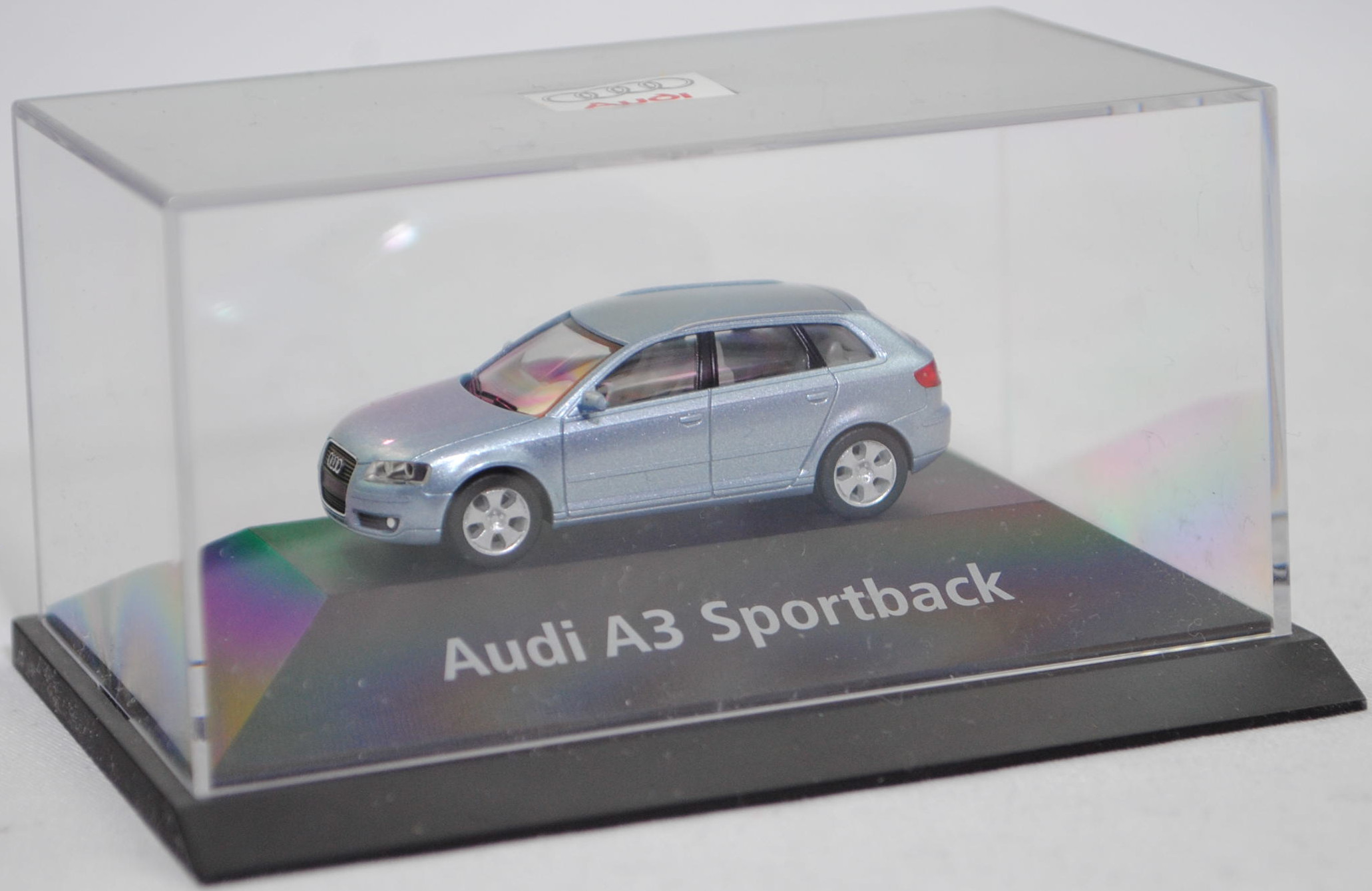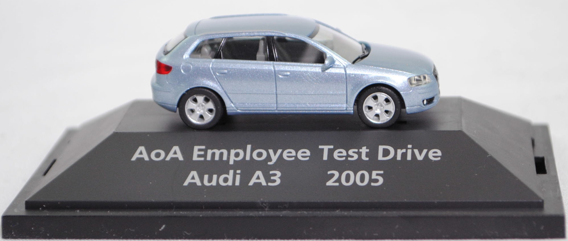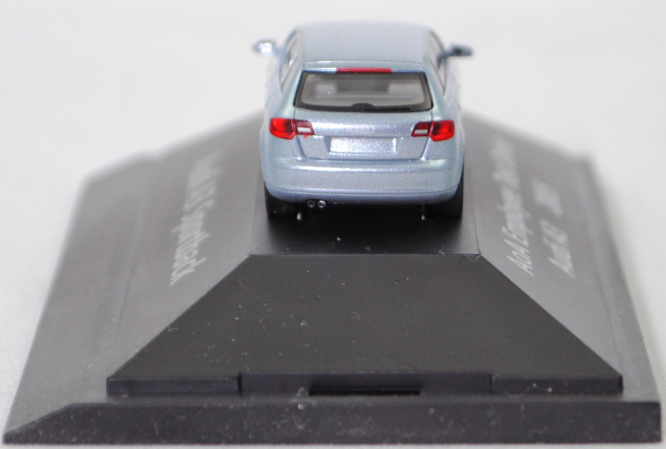 Audi A3 Sportback Ambition 3.2 quattro (2. Generation, Baureihe A3 Sportback, interne Baureihenbezeichnung 8PA facelift 1, fünftürige Schräghecklimousine mit 5 Sitzplätzen, entspricht Facelift 1 der Limousine von 2005, mit Singleframe-Kühlergrill, Stoßfänger vorne mit zusätzlichen Stoßleisten unter den Frontscheinwerfern, Stoßfänger hinten mit zusätzlichen Stoßleisten im oberen Bereich, äußere Einsätze im Stoßfänger mit Nebelscheinwerfer ganz außen und 2 waagerechten Lamellen daneben, 5 Lüftungsschlitze mittig unter dem Singleframe-Kühlergrill, Blinker hinten mit roter Verglasung unten angeordnet, Lenkrad im Singleframe-Design, Ausstattungslinie Ambition: Halogen Nebelscheinwerfer + Fahrerinformationssystem inclusive Funkuhr + Dekoreinlagen hochglanz + Sportlenkrad im 3-Speichen-Design + Sportschaltknauf mit Schalthebelmanschette und Handbremsgriff in Leder + Sportsitze vorne mit Sitzbezüge in Stoff Matrix + Beifahrersitz höhenverstellbar + Sportfahrwerk (Karosserie um 15 mm abgesenkt) + Aluminium-Gussräder im 5-Arm-Design Größe 7,5 J x 17 mit Reifen 225/45 R 17, 6-Gang-Schaltgetriebe, permanenter Allradantrieb quattro® mit elektronisch geregelter Lamellenkupplung, Motor: Audi Typ VW EA390 wassergekühlter Sechszylinder-VR-Viertakt-Otto mit vollelektronischer sequentieller Saugrohreinspritzung und zwei obenliegende Nockenwellen (DOHC = Double Overhead Camshaft) sowie 4 Ventile pro Zylinder und 3189 cm³ sowie 250 PS, Radstand 2578 mm, Länge 4203 mm, Modell 2004-2008), liquidblau metallic (Verkaufskennzeichen Q1, Lacknummer LY5J), innen moosgrau, Sitze moosgrau, Lenkrad schwarz, Audi Aluminium-Gussräder im 5-Arm-Design Größe 7,5 J x 17 H2 ET 56 mit Lochkreis 5 x 112 (Teilenummer 8P0 601 025 C, Farbcode Z17 avussilber) und Nabendeckel / Radzierkappe (Teilenummer 8D0 601 170, Farbcode Z17 avussilber) sowie Reifen 225/45 ZR 17 91Y, Herpa, 1:87, PC-Box Werbeschachtel (Limited Edition quattro GmbH 85045 Ingolstadt, Audi collection, zusätzlicher Druck AoA Employee Test Drive / Audi A3 2005 in silber auf dem Sockel der PC-Box) (Vitrinenmodell, Schachtel mit Lagerspuren, Umverpackung weg) (EAN 2050000034831)