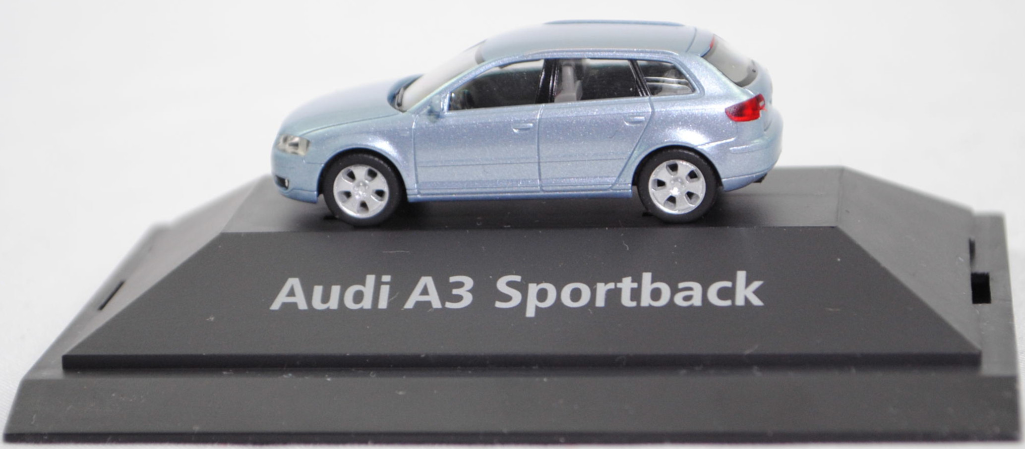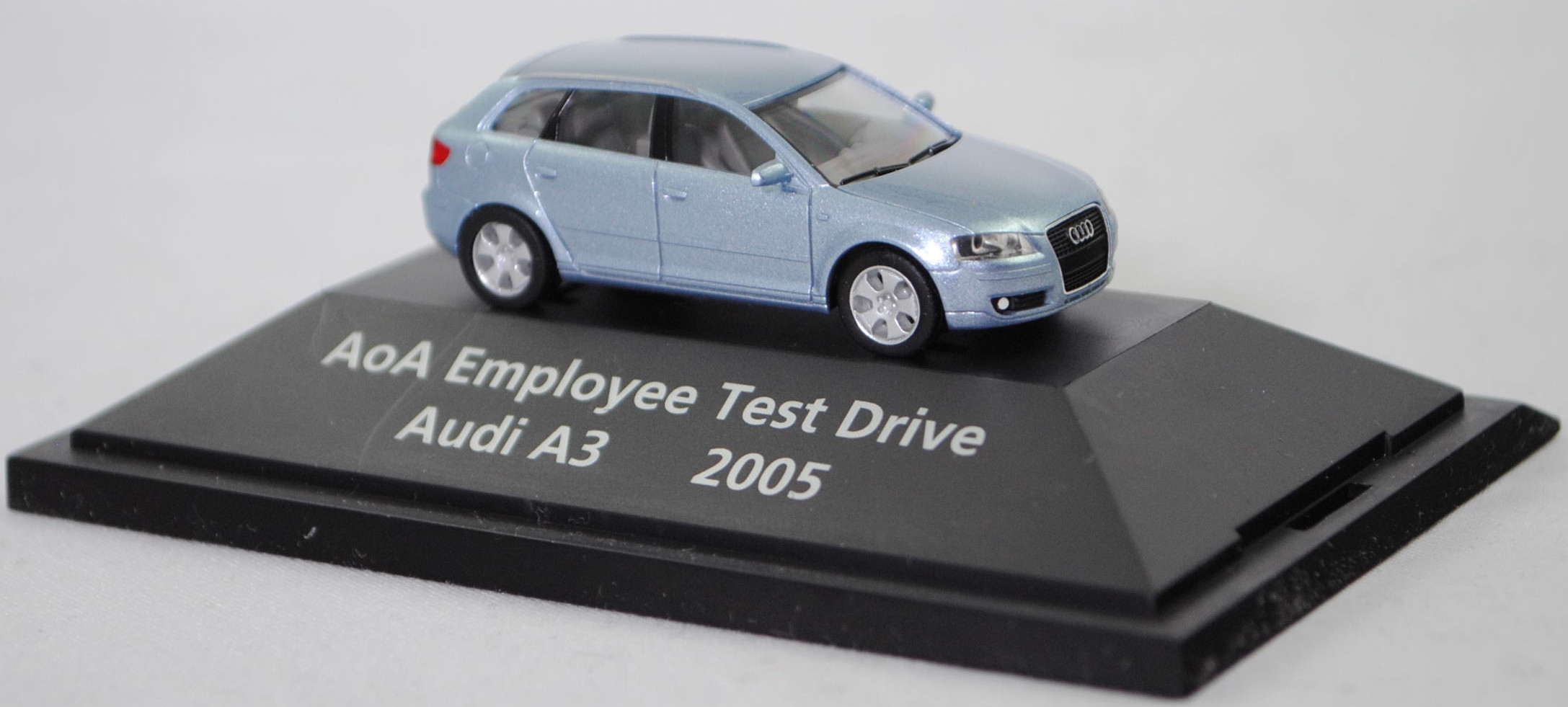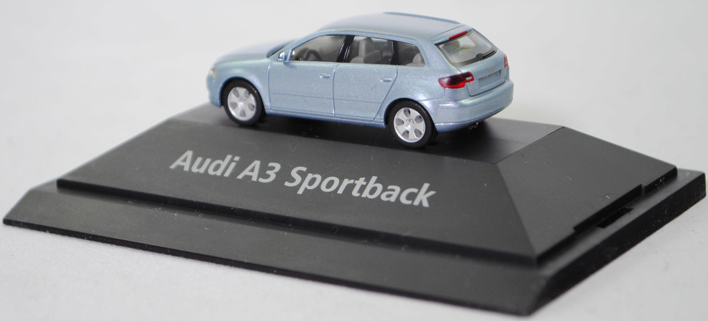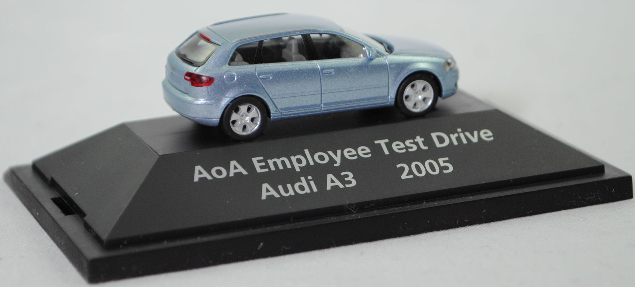 Audi A3 Sportback Ambition 3.2 quattro (2. Generation, Baureihe A3 Sportback, interne Baureihenbezeichnung 8PA facelift 1, fünftürige Schräghecklimousine mit 5 Sitzplätzen, entspricht Facelift 1 der Limousine von 2005, mit Singleframe-Kühlergrill, Stoßfänger vorne mit zusätzlichen Stoßleisten unter den Frontscheinwerfern, Stoßfänger hinten mit zusätzlichen Stoßleisten im oberen Bereich, äußere Einsätze im Stoßfänger mit Nebelscheinwerfer ganz außen und 2 waagerechten Lamellen daneben, 5 Lüftungsschlitze mittig unter dem Singleframe-Kühlergrill, Blinker hinten mit roter Verglasung unten angeordnet, Lenkrad im Singleframe-Design, Ausstattungslinie Ambition: Halogen Nebelscheinwerfer + Fahrerinformationssystem inclusive Funkuhr + Dekoreinlagen hochglanz + Sportlenkrad im 3-Speichen-Design + Sportschaltknauf mit Schalthebelmanschette und Handbremsgriff in Leder + Sportsitze vorne mit Sitzbezüge in Stoff Matrix + Beifahrersitz höhenverstellbar + Sportfahrwerk (Karosserie um 15 mm abgesenkt) + Aluminium-Gussräder im 5-Arm-Design Größe 7,5 J x 17 mit Reifen 225/45 R 17, 6-Gang-Schaltgetriebe, permanenter Allradantrieb quattro® mit elektronisch geregelter Lamellenkupplung, Motor: Audi Typ VW EA390 wassergekühlter Sechszylinder-VR-Viertakt-Otto mit vollelektronischer sequentieller Saugrohreinspritzung und zwei obenliegende Nockenwellen (DOHC = Double Overhead Camshaft) sowie 4 Ventile pro Zylinder und 3189 cm³ sowie 250 PS, Radstand 2578 mm, Länge 4203 mm, Modell 2004-2008), liquidblau metallic (Verkaufskennzeichen Q1, Lacknummer LY5J), innen moosgrau, Sitze moosgrau, Lenkrad schwarz, Audi Aluminium-Gussräder im 5-Arm-Design Größe 7,5 J x 17 H2 ET 56 mit Lochkreis 5 x 112 (Teilenummer 8P0 601 025 C, Farbcode Z17 avussilber) und Nabendeckel / Radzierkappe (Teilenummer 8D0 601 170, Farbcode Z17 avussilber) sowie Reifen 225/45 ZR 17 91Y, Herpa, 1:87, PC-Box Werbeschachtel (Limited Edition quattro GmbH 85045 Ingolstadt, Audi collection, zusätzlicher Druck AoA Employee Test Drive / Audi A3 2005 in silber auf dem Sockel der PC-Box) (Vitrinenmodell, Schachtel mit Lagerspuren, Umverpackung weg) (EAN 2050000034831)