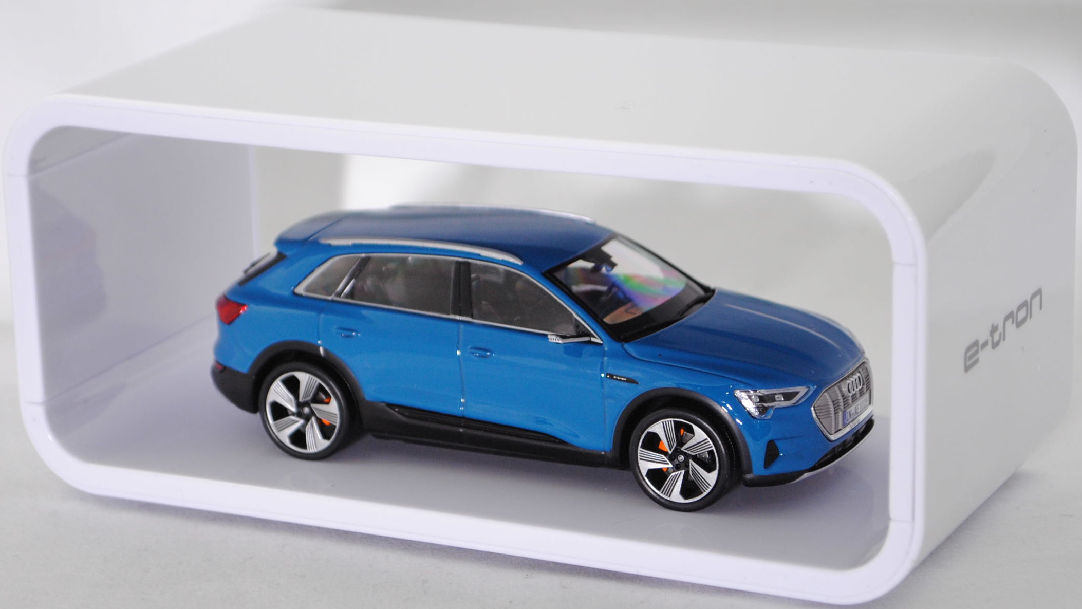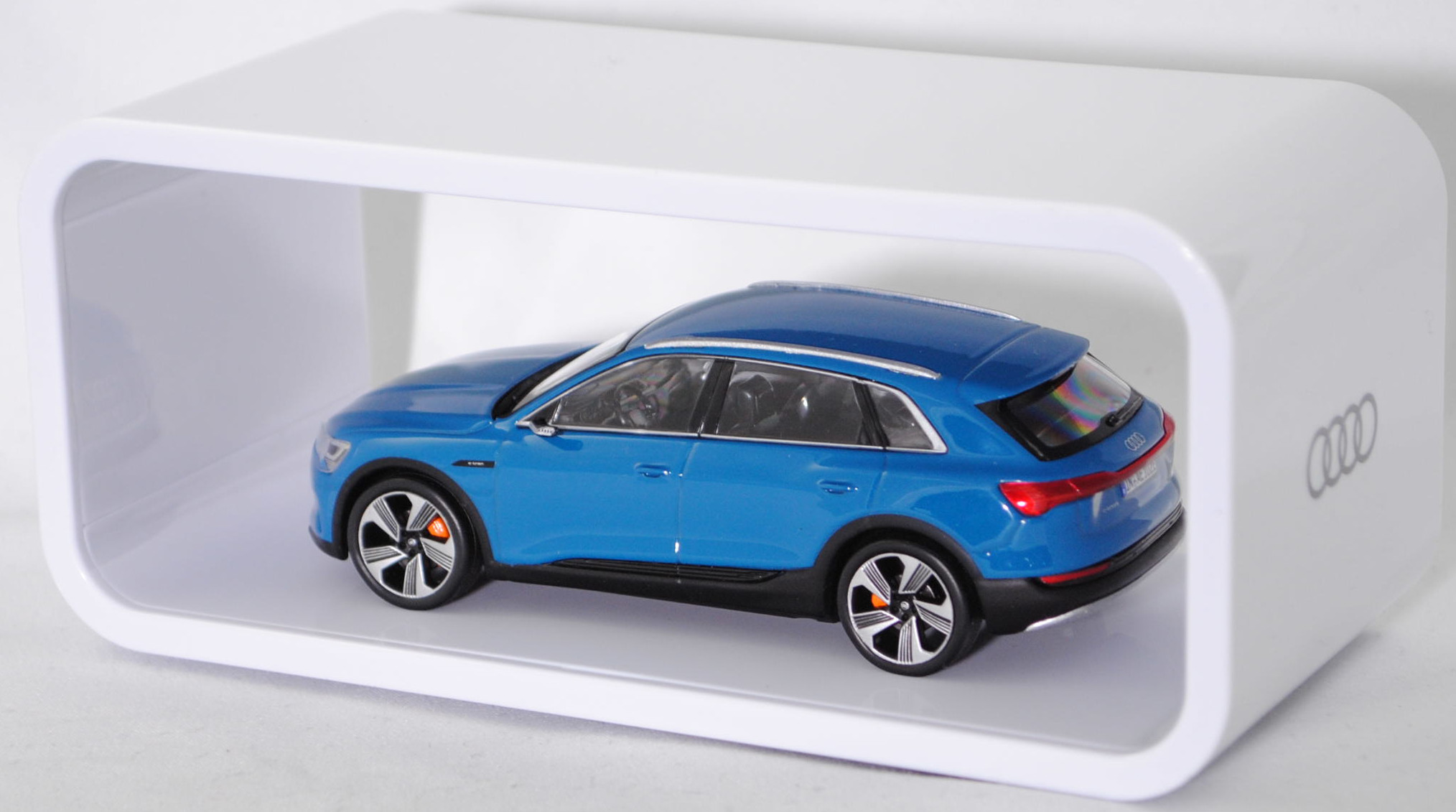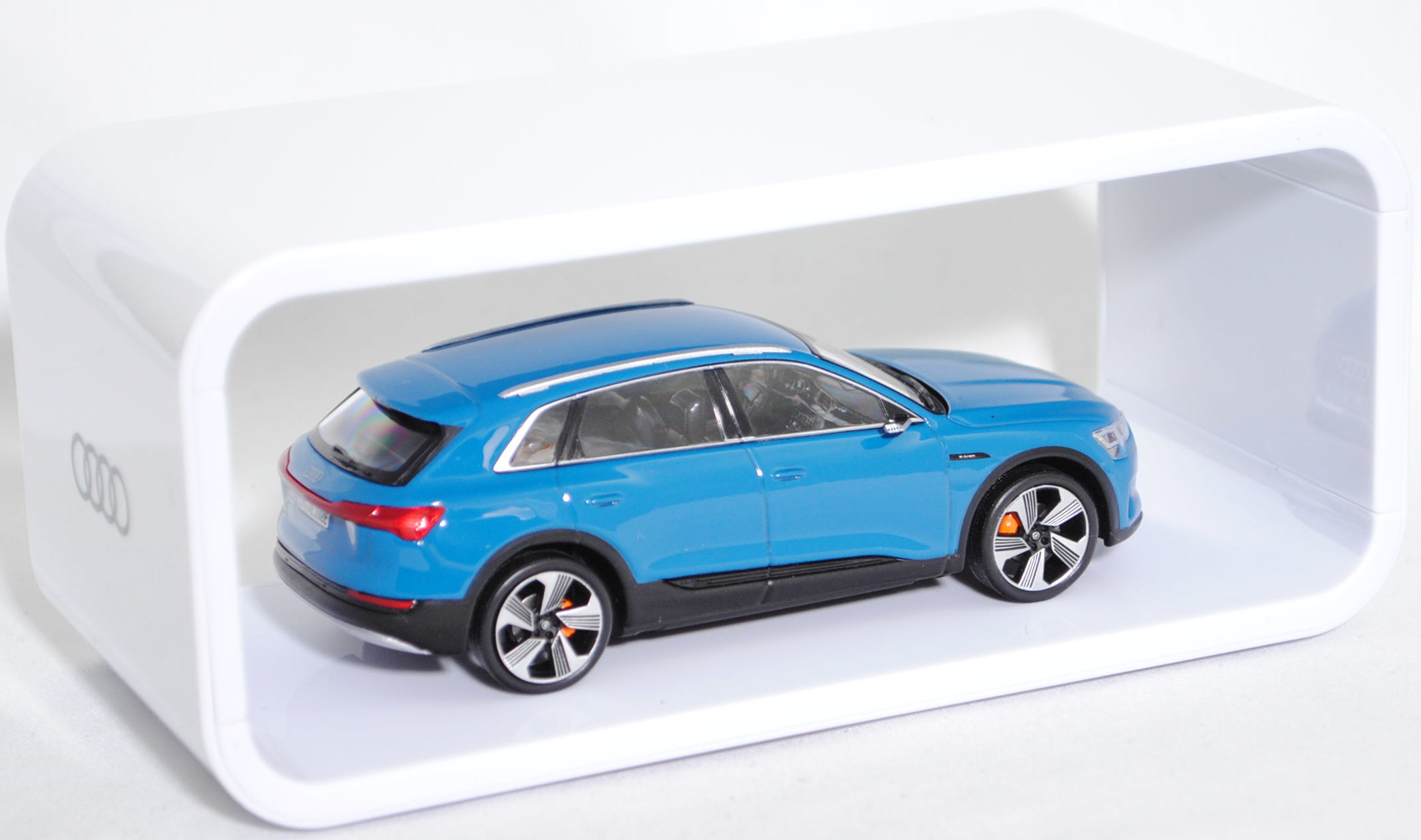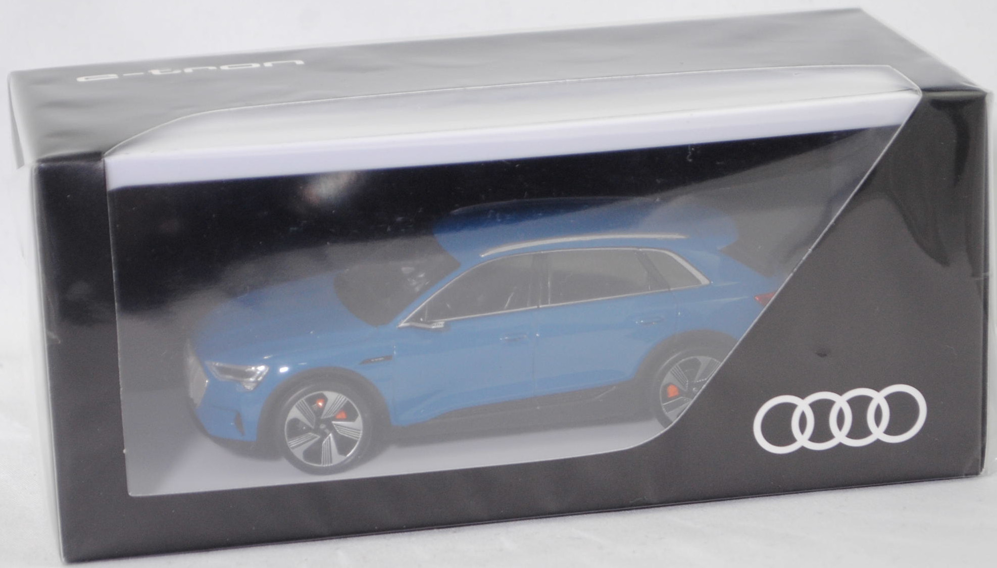 Audi e-tron advanced 55 quattro (1. Generation, Baureihe e-tron, interne Baureihenbezeichnung GE, fünftüriger batterieelektrisch angetriebenes Sport Utility Vehicle (SUV) mit 5 Sitzplätzen, Ausstattungslinie advanced: Anbauteile wie Radlaufblenden und Schweller in Kontrastlackierung in manhattangrau metallic + Unterfahrschutz vorne und Diffusor hinten in selenitsilber matt + Scheinwerferreinigungsanlage + grün getönte Wärmeschutzverglasung + rahmenloser Innenspiegel automatisch abblendend + Sonnenblenden mit beleuchtetem Make-up-Spiegel + Dekoreinlagen für Armaturentafel in Feinlack graphitgrau + 2-Zonen Komfortklimaautomatik + Normalsitze mit Stoff Effekt + Mittelarmlehne vorne + Rücksitzlehne umklappbar + Dachhimmel in Stoff mondsilber + Einstiegsleisten mit Aluminiumeinlage vorne und hinten unbeleuchtet ohne Schriftzug + Glanzpaket mit Dachrahmen und Fensterschachtleisten in Aluminium eloxiert + Gepäckraumklappe automatisch öffnend und schließend + Trennnetz + Gepäckraumabdeckung + Einparkhilfe plus mit Umgebungsanzeige, Sonderausstattung gegen Mehrpreis: virtuelle Außenspiegel + Sportlederlenkrad mit Multifunktion und Schaltwippen + Audi Aluminium-Schmiederäder im 5-Arm-Turbinen-Design in schwarz glänzend teilpoliert Größe 9,5 J x 21 H2 ET 36 (Bestellschlüssel 47B) mit Reifen 265/45 R 21, permanenter Allradantrieb quattro®, Motor: zwei Asynchronmaschinen ASM (Elektromotor 1 mit Motorcode EAS und 184 PS an der Vorderachse sowie Elektromotor 2 mit Motorcode EAW und 224 PS an der Hinterachse) mit 408 PS (Systemleistung), Lithium-Ionen-Batterie mit Batteriekapazität 95 kWh (brutto) bzw. 83,6 kWh (netto), Radstand 2928 mm, Länge 4901 mm, Modell 2018-2019), antiguablau metallic (Verkaufskennzeichen 3P, Farbcode LV5S), Stoßfänger vorne und hinten manhattangrau metallic, Radlaufblenden und Schweller manhattangrau metallic, Unterfahrschutz vorne und Diffusor hinten selenitsilber matt, innen schwarz, Sitze schwarz (vgl. Normalsitze beim Original), Lenkrad schwarz (vgl. Sportlederlenkrad mit Multifunktion und Schaltwippen beim Original), Audi Aluminium-Schmiederäder im 5-Arm-Turbinen-Design in schwarz glänzend teilpoliert Größe 9,5 J x 21 H2 ET 36 mit Lochkreis 5 x 112 (Bestellschlüssel 47B, Teilenummer 4KE 601 025 AC, Farbcode AX1/Z33) und Nabendeckel (Teilenummer 8W0 601 170 A) sowie Reifen 265/45 R 21, Minimax, 1:43, PC-Box Werbeschachtel (Limited Edition Audi AG 85045 Ingolstadt, Modell im Schaukasten, Vitrinenmodell, Schachtel mit Lagerspuren) (EAN 2160000050516)