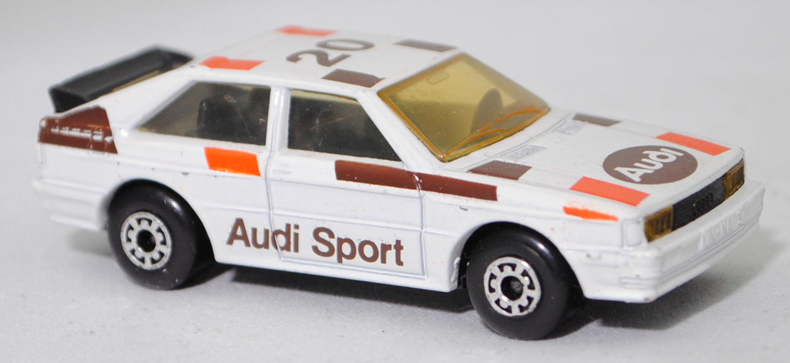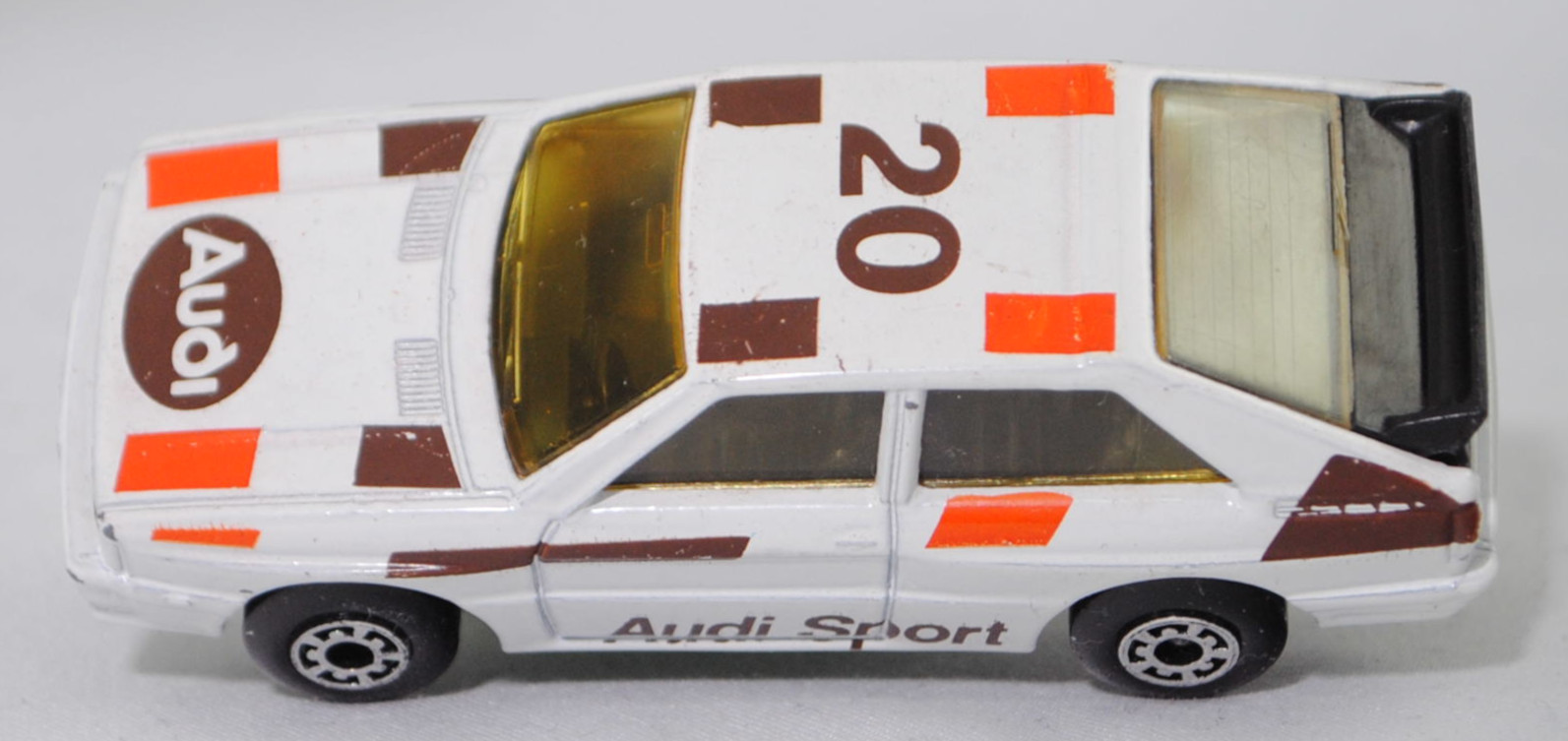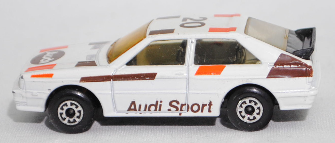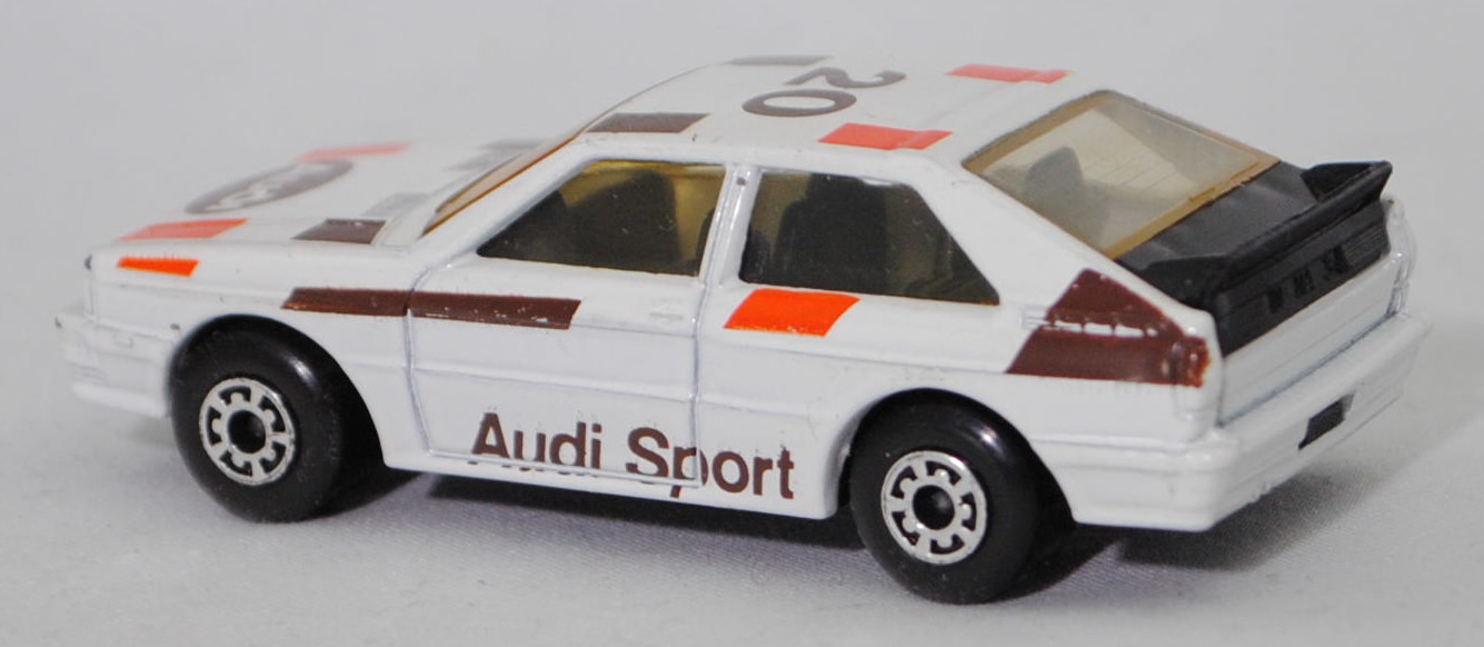 Audi quattro (1. Generation, Baureihe quattro, interne Baureihenbezeichnung B2, Typ 85Q, zweitüriger Sportwagen als Coupé mit 5 Sitzplätzen, VFL (Vorfacelift), versenkte Doppel-Halogen-Rechteckscheinwerfer mit blanken Rechteckausschnitten, gerade stehender Kühlergrill, Heckleuchten orange/rot, Heckleuchtenband rot mit integrierter Nebelschlussleuchte, schwarzer Heckspoiler, Ausstattungslinie quattro: versenkte Doppel-Halogen-Rechteckscheinwerfer mit blanken Rechteckausschnitten + Scheinwerfer-Reinigungsanlage + großer integrierter Frontspoiler + blanke Zierleiste ober- und unterhalb des Kühlergrills + in Front- und Heckschürze integrierter kunststoffummantelter Stoßfänger + seitliche Zusatzblinkleuchte + abblendbarer Sicherheitsinnenspiegel + klapp- und schwenkbare Sonnenblenden mit beleuchtetem Make-up-Spiegel auf der Beifahrerseite + abschließbarer Ablagekasten auf der Beifahrerseite mit Beleuchtung + Zweistufenschaltung und Tipp-Wisch-Kontakt für Scheibenwischer + elektrische Scheibenwaschanlage + Mittelkonsole + Schalthebelknopf und -stulpe in Leder + Türablagekästen + lederbezogenes 4-Speichen-Sportlenkrad + Sportsitze vorne + Liegesitzeinrichtung für Fahrer und Beifahrer + verstellbare Rahmenkopfstützen für Vordersitze + ausgeformte Rücksitzbank mit im Kopfraumbereich angeformter Rücksitzlehne + Stoffsitzbezüge in Quattro-Velours + schwarze Tür- und Seitenfenster-Rahmen + doppelter umlaufender Dekostreifen + Heckspoiler + zwei Rückfahrleuchten + Nebelschlußleuchte + Zierblende zwischen den Heckleuchten + rotes Leuchtband mit Schriftzug COUPÉ zwischen den Heckleuchten + Edelstahl-Auspuffanlage mit Doppelendrohr + Leichtmetallräder, vollsynchronisiertes 5-Gang-Schaltgetriebe als Mittelschaltung, permanenter Allradantrieb quattro®, Motor: Audi Typ VW EA828 wassergekühlter Fünfzylinder-Reihen-Viertakt-Otto mit KKK (Kühnle, Kopp & Kausch AG Frankenthal) K26 Abgas-Turbolader und mechanischer Einspritzanlage sowie eine obenliegende Nockenwelle (OHC = Overhead Camshaft) und 2 Ventile pro Zylinder sowie Ladeluftkühler und 2144 cm³ sowie 200 PS, Motorkennbuchstabe WR, Radstand 2524 mm, Länge 4404 mm, Modell 1980-1982), alpinweiß (Verkaufskennzeichen P1, Farbcode L90E), innen schwarz, Sitze schwarz, Lenkrad schwarz, Druck Streifen in reinorange/nußbraun und Audi Sport in nußbraun auf den Seiten, Druck Streifen in reinorange/nußbraun außen auf der Motorhaube und Ellipse in nußbraun vorne mittig auf der Motorhaube wobei Audi in Wagenfarbe von vorne aus lesbar durchschimmert, Druck Streifen in reinorange/nußbraun außen und 20 in nußbraun von vorne aus lesbar auf dem Dach, Design vgl. Audi Sport Lackierung der Jahre 1980 bis 1982 mit den Farben blutorange (RAL 2002) / telegrau (RAL 7045) / graubraun (RAL 8019), Bpr. LESNEY ENGLAND, Chassis schwarz, 5-Loch-Felgen in chrom (Audi Leichtmetallräder im 16-Speichen-Design (Hersteller RONAL) Größe 6 J x 15 H2 ET 45 mit Lochkreis 5 x 112 (Teilenummer 437 601 025 C) und Nabendeckel / Radzierkappe (58 mm, Teilenummer 841 601 165) sowie Reifen 205/60 VR 15), Matchbox, 1:58, m- (Vitrinenmodell, minimale Lackfehler, siehe auch Artikelnummer MB23-D in den USA) (EAN 035995102729)