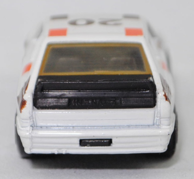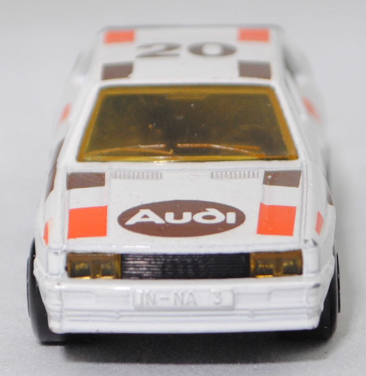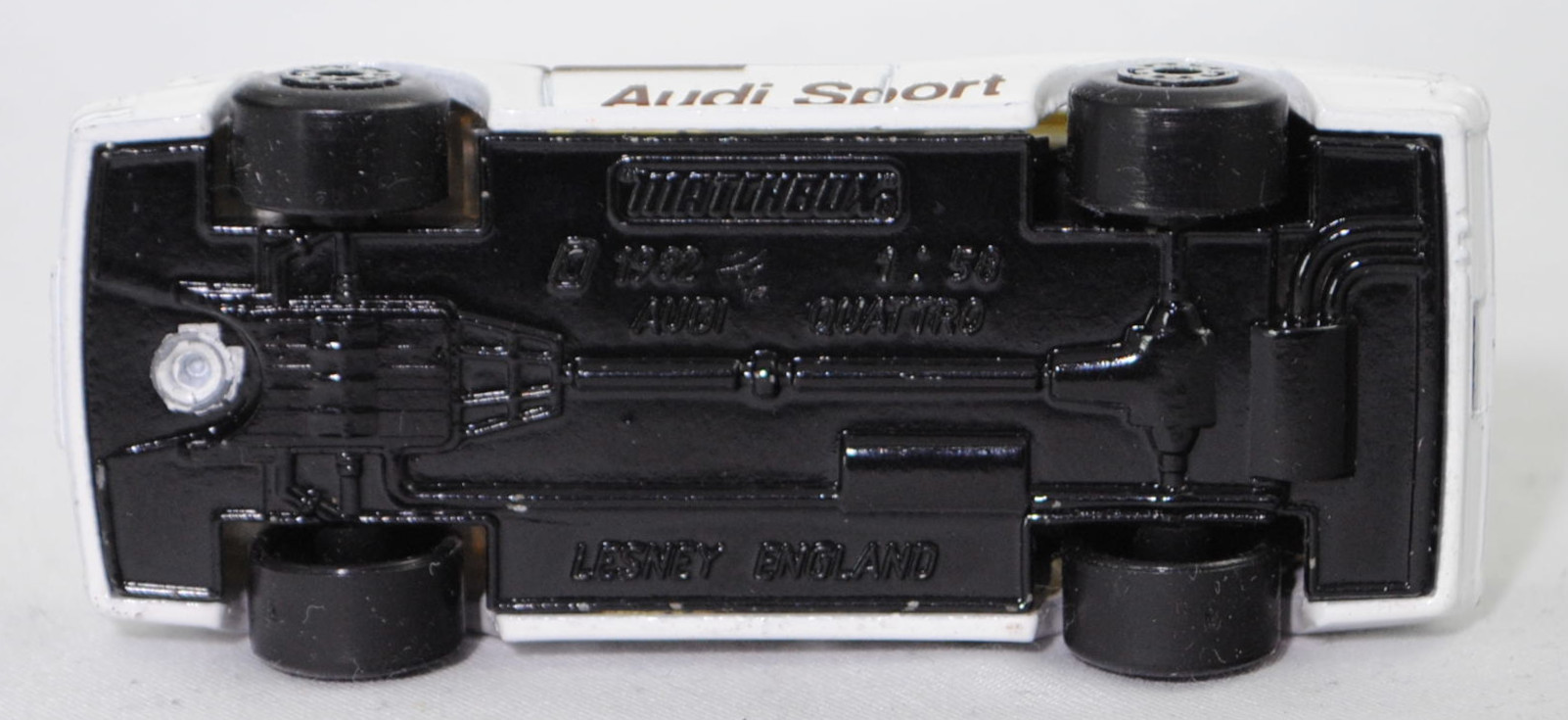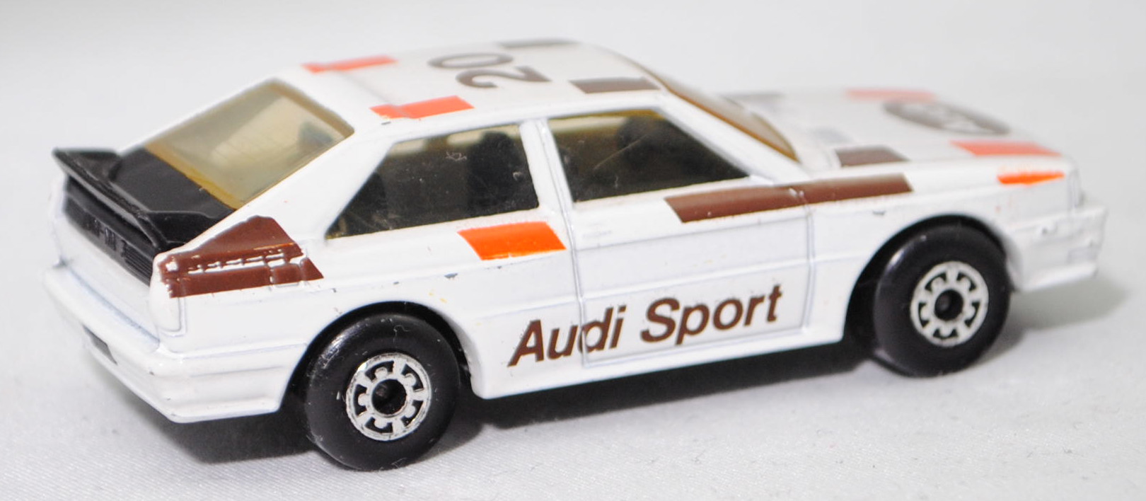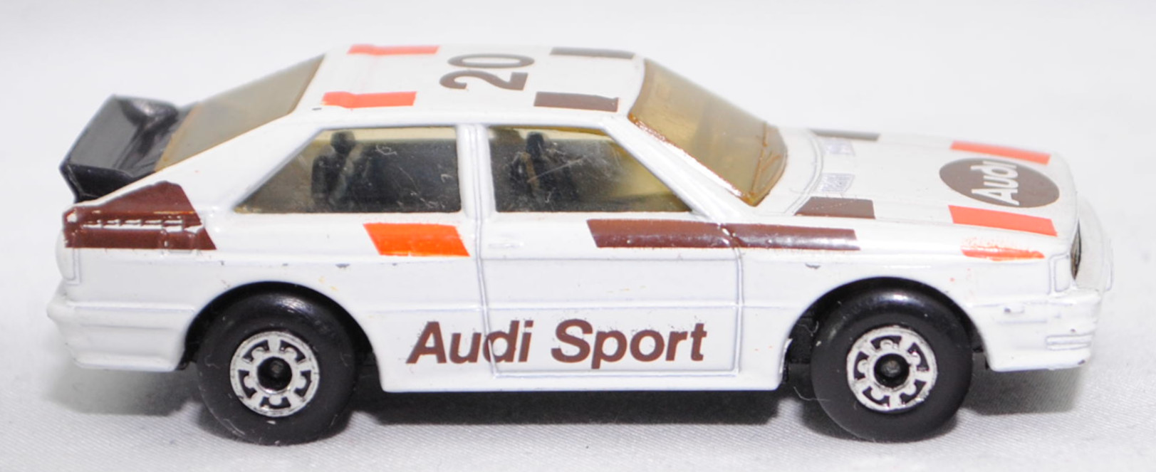 Audi quattro (1. Generation, Baureihe quattro, interne Baureihenbezeichnung B2, Typ 85Q, zweitüriger Sportwagen als Coupé mit 5 Sitzplätzen, VFL (Vorfacelift), versenkte Doppel-Halogen-Rechteckscheinwerfer mit blanken Rechteckausschnitten, gerade stehender Kühlergrill, Heckleuchten orange/rot, Heckleuchtenband rot mit integrierter Nebelschlussleuchte, schwarzer Heckspoiler, Ausstattungslinie quattro: versenkte Doppel-Halogen-Rechteckscheinwerfer mit blanken Rechteckausschnitten + Scheinwerfer-Reinigungsanlage + großer integrierter Frontspoiler + blanke Zierleiste ober- und unterhalb des Kühlergrills + in Front- und Heckschürze integrierter kunststoffummantelter Stoßfänger + seitliche Zusatzblinkleuchte + abblendbarer Sicherheitsinnenspiegel + klapp- und schwenkbare Sonnenblenden mit beleuchtetem Make-up-Spiegel auf der Beifahrerseite + abschließbarer Ablagekasten auf der Beifahrerseite mit Beleuchtung + Zweistufenschaltung und Tipp-Wisch-Kontakt für Scheibenwischer + elektrische Scheibenwaschanlage + Mittelkonsole + Schalthebelknopf und -stulpe in Leder + Türablagekästen + lederbezogenes 4-Speichen-Sportlenkrad + Sportsitze vorne + Liegesitzeinrichtung für Fahrer und Beifahrer + verstellbare Rahmenkopfstützen für Vordersitze + ausgeformte Rücksitzbank mit im Kopfraumbereich angeformter Rücksitzlehne + Stoffsitzbezüge in Quattro-Velours + schwarze Tür- und Seitenfenster-Rahmen + doppelter umlaufender Dekostreifen + Heckspoiler + zwei Rückfahrleuchten + Nebelschlußleuchte + Zierblende zwischen den Heckleuchten + rotes Leuchtband mit Schriftzug COUPÉ zwischen den Heckleuchten + Edelstahl-Auspuffanlage mit Doppelendrohr + Leichtmetallräder, vollsynchronisiertes 5-Gang-Schaltgetriebe als Mittelschaltung, permanenter Allradantrieb quattro®, Motor: Audi Typ VW EA828 wassergekühlter Fünfzylinder-Reihen-Viertakt-Otto mit KKK (Kühnle, Kopp & Kausch AG Frankenthal) K26 Abgas-Turbolader und mechanischer Einspritzanlage sowie eine obenliegende Nockenwelle (OHC = Overhead Camshaft) und 2 Ventile pro Zylinder sowie Ladeluftkühler und 2144 cm³ sowie 200 PS, Motorkennbuchstabe WR, Radstand 2524 mm, Länge 4404 mm, Modell 1980-1982), alpinweiß (Verkaufskennzeichen P1, Farbcode L90E), innen schwarz, Sitze schwarz, Lenkrad schwarz, Druck Streifen in reinorange/nußbraun und Audi Sport in nußbraun auf den Seiten, Druck Streifen in reinorange/nußbraun außen auf der Motorhaube und Ellipse in nußbraun vorne mittig auf der Motorhaube wobei Audi in Wagenfarbe von vorne aus lesbar durchschimmert, Druck Streifen in reinorange/nußbraun außen und 20 in nußbraun von vorne aus lesbar auf dem Dach, Design vgl. Audi Sport Lackierung der Jahre 1980 bis 1982 mit den Farben blutorange (RAL 2002) / telegrau (RAL 7045) / graubraun (RAL 8019), Bpr. LESNEY ENGLAND, Chassis schwarz, 5-Loch-Felgen in chrom (Audi Leichtmetallräder im 16-Speichen-Design (Hersteller RONAL) Größe 6 J x 15 H2 ET 45 mit Lochkreis 5 x 112 (Teilenummer 437 601 025 C) und Nabendeckel / Radzierkappe (58 mm, Teilenummer 841 601 165) sowie Reifen 205/60 VR 15), Matchbox, 1:58, m- (Vitrinenmodell, minimale Lackfehler, siehe auch Artikelnummer MB23-D in den USA) (EAN 035995102729)