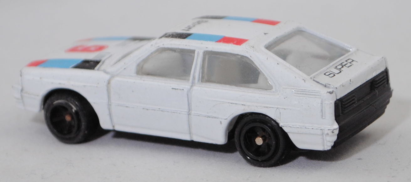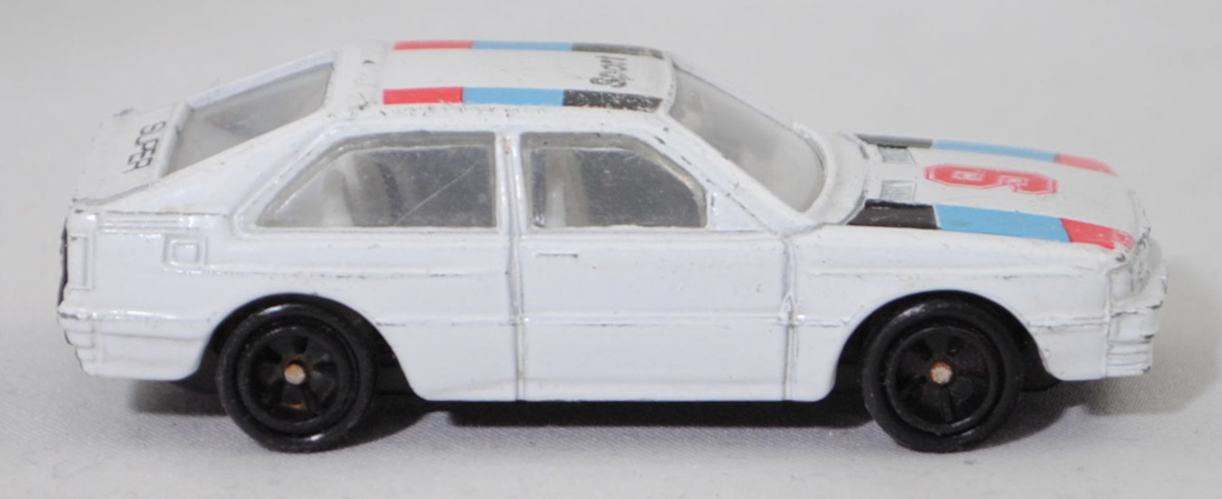 Audi quattro (1. Generation, B2, Typ 85Q, VFL (Vorfacelift), Modell 1980-1982), alpinweiß (L90E), Streifen in rot/blau/schwarz und 9 / Sport , Elite für Kaufhof AG Köln, 1:61, m-