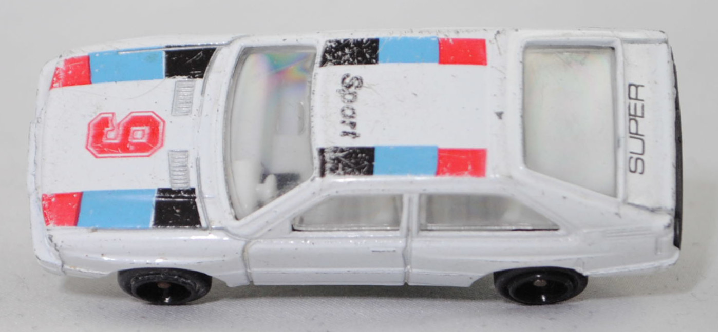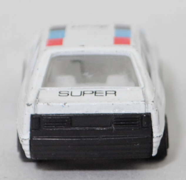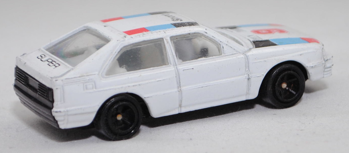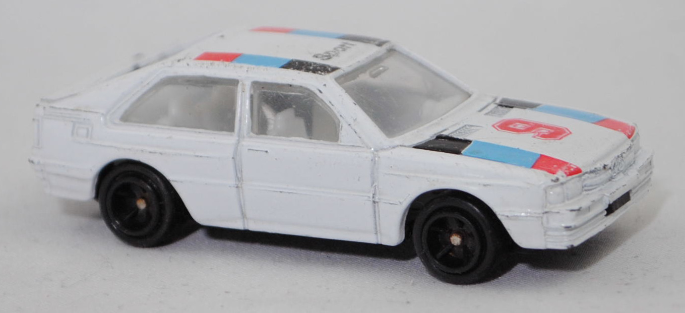 Audi quattro (1. Generation, Baureihe quattro, interne Baureihenbezeichnung B2, Typ 85Q, zweitüriger Sportwagen als Coupé mit 5 Sitzplätzen, VFL (Vorfacelift), versenkte Doppel-Halogen-Rechteckscheinwerfer mit blanken Rechteckausschnitten, gerade stehender Kühlergrill, Heckleuchten orange/rot, Heckleuchtenband rot mit integrierter Nebelschlussleuchte, schwarzer Heckspoiler, Ausstattungslinie quattro: versenkte Doppel-Halogen-Rechteckscheinwerfer mit blanken Rechteckausschnitten + Scheinwerfer-Reinigungsanlage + großer integrierter Frontspoiler + blanke Zierleiste ober- und unterhalb des Kühlergrills + in Front- und Heckschürze integrierter kunststoffummantelter Stoßfänger + seitliche Zusatzblinkleuchte + abblendbarer Sicherheitsinnenspiegel + klapp- und schwenkbare Sonnenblenden mit beleuchtetem Make-up-Spiegel auf der Beifahrerseite + abschließbarer Ablagekasten auf der Beifahrerseite mit Beleuchtung + Zweistufenschaltung und Tipp-Wisch-Kontakt für Scheibenwischer + elektrische Scheibenwaschanlage + Mittelkonsole + Schalthebelknopf und -stulpe in Leder + Türablagekästen + lederbezogenes 4-Speichen-Sportlenkrad + Sportsitze vorne + Liegesitzeinrichtung für Fahrer und Beifahrer + verstellbare Rahmenkopfstützen für Vordersitze + ausgeformte Rücksitzbank mit im Kopfraumbereich angeformter Rücksitzlehne + Stoffsitzbezüge in Quattro-Velours + schwarze Tür- und Seitenfenster-Rahmen + doppelter umlaufender Dekostreifen + Heckspoiler + zwei Rückfahrleuchten + Nebelschlußleuchte + Zierblende zwischen den Heckleuchten + rotes Leuchtband mit Schriftzug COUPÉ zwischen den Heckleuchten + Edelstahl-Auspuffanlage mit Doppelendrohr + Leichtmetallräder, vollsynchronisiertes 5-Gang-Schaltgetriebe als Mittelschaltung, permanenter Allradantrieb quattro®, Motor: Audi Typ VW EA828 wassergekühlter Fünfzylinder-Reihen-Viertakt-Otto mit KKK (Kühnle, Kopp & Kausch AG Frankenthal) K26 Abgas-Turbolader und mechanischer Einspritzanlage sowie eine obenliegende Nockenwelle (OHC = Overhead Camshaft) und 2 Ventile pro Zylinder sowie Ladeluftkühler und 2144 cm³ sowie 200 PS, Motorkennbuchstabe WR, Radstand 2524 mm, Länge 4404 mm, Modell 1980-1982), alpinweiß (Verkaufskennzeichen P1, Farbcode L90E), innen reinweiß, Sitze reinweiß, Lenkrad reinweiß, Druck Streifen in verkehrsrot/lichtblau/schwarz außen auf der Motorhaube, Druck 9 in verkehrsrot von vorne aus lesbar mittig auf der Motorhaube, Druck Streifen in verkehrsrot/lichtblau/schwarz außen und Sport in schwarz von vorne aus lesbar vorne auf dem Dach, Druck SUPER in schwarz von hinten aus lesbar oben auf der motorhaube, 5-Arm-Felgen in schwarz (Audi Leichtmetallräder im 16-Speichen-Design (Hersteller RONAL) Größe 6 J x 15 H2 ET 45 mit Lochkreis 5 x 112 (Teilenummer 437 601 025 C) und Nabendeckel / Radzierkappe (58 mm, Teilenummer 841 601 165) sowie Reifen 205/60 VR 15), Elite für Kaufhof AG Köln, ca. 1:61, m- (Modellserie Racer, Vitrinenmodell, Drucke etwas abgegriffen, leichte Spielspuren) (EAN 4333099269499)