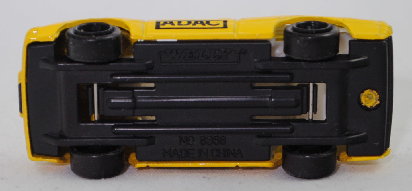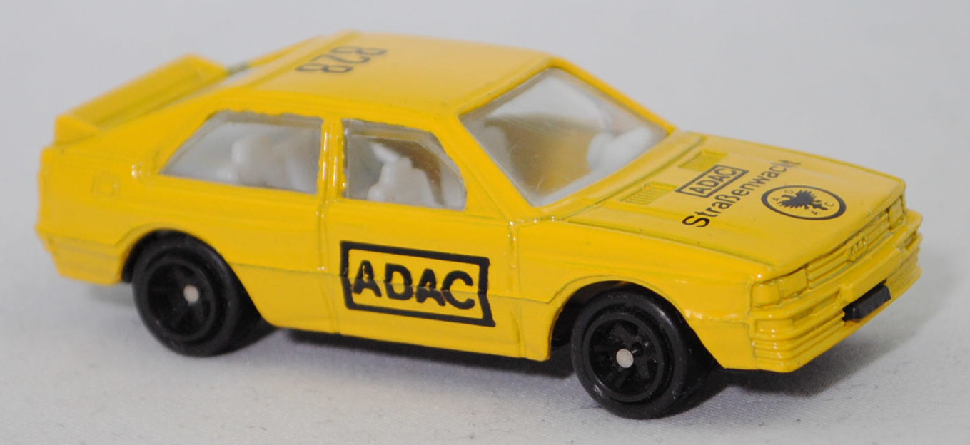 Audi quattro (1. Generation, Baureihe quattro, interne Baureihenbezeichnung B2, Typ 85Q, zweitüriger Sportwagen als Coupé mit 5 Sitzplätzen, VFL (Vorfacelift), versenkte Doppel-Halogen-Rechteckscheinwerfer mit blanken Rechteckausschnitten, gerade stehender Kühlergrill, Heckleuchten orange/rot, Heckleuchtenband rot mit integrierter Nebelschlussleuchte, schwarzer Heckspoiler, Ausstattungslinie quattro: versenkte Doppel-Halogen-Rechteckscheinwerfer mit blanken Rechteckausschnitten + Scheinwerfer-Reinigungsanlage + großer integrierter Frontspoiler + blanke Zierleiste ober- und unterhalb des Kühlergrills + in Front- und Heckschürze integrierter kunststoffummantelter Stoßfänger + seitliche Zusatzblinkleuchte + abblendbarer Sicherheitsinnenspiegel + klapp- und schwenkbare Sonnenblenden mit beleuchtetem Make-up-Spiegel auf der Beifahrerseite + abschließbarer Ablagekasten auf der Beifahrerseite mit Beleuchtung + Zweistufenschaltung und Tipp-Wisch-Kontakt für Scheibenwischer + elektrische Scheibenwaschanlage + Mittelkonsole + Schalthebelknopf und -stulpe in Leder + Türablagekästen + lederbezogenes 4-Speichen-Sportlenkrad + Sportsitze vorne + Liegesitzeinrichtung für Fahrer und Beifahrer + verstellbare Rahmenkopfstützen für Vordersitze + ausgeformte Rücksitzbank mit im Kopfraumbereich angeformter Rücksitzlehne + Stoffsitzbezüge in Quattro-Velours + schwarze Tür- und Seitenfenster-Rahmen + doppelter umlaufender Dekostreifen + Heckspoiler + zwei Rückfahrleuchten + Nebelschlußleuchte + Zierblende zwischen den Heckleuchten + rotes Leuchtband mit Schriftzug COUPÉ zwischen den Heckleuchten + Edelstahl-Auspuffanlage mit Doppelendrohr + Leichtmetallräder, vollsynchronisiertes 5-Gang-Schaltgetriebe als Mittelschaltung, permanenter Allradantrieb quattro®, Motor: Audi Typ VW EA828 wassergekühlter Fünfzylinder-Reihen-Viertakt-Otto mit KKK (Kühnle, Kopp & Kausch AG Frankenthal) K26 Abgas-Turbolader und mechanischer Einspritzanlage sowie eine obenliegende Nockenwelle (OHC = Overhead Camshaft) und 2 Ventile pro Zylinder sowie Ladeluftkühler und 2144 cm³ sowie 200 PS, Motorkennbuchstabe WR, Radstand 2524 mm, Länge 4404 mm, Modell 1980-1982), kadmiumgelb, innen reinweiß, Sitze reinweiß, Lenkrad reinweiß, Druck ADAC mit Rahmnen in schwarz auf den Türen, Druck ADAC mit Rahmnen / Straßenwacht und ADAC-Logo mit Adler in schwarz von vorne aus lesbar auf der Motorhaube, Druck 828 in schwarz von hinten aus lesbar hinten auf dem Dach, Bpr. MADE IN CHINA, Chassis schwarz, 5-Arm-Felgen in schwarz (Audi Leichtmetallräder im 16-Speichen-Design (Hersteller RONAL) Größe 6 J x 15 H2 ET 45 mit Lochkreis 5 x 112 (Teilenummer 437 601 025 C) und Nabendeckel / Radzierkappe (58 mm, Teilenummer 841 601 165) sowie Reifen 205/60 VR 15), WELLY, 1:62, m (Vitrinenmodell) (EAN 5906168336300)