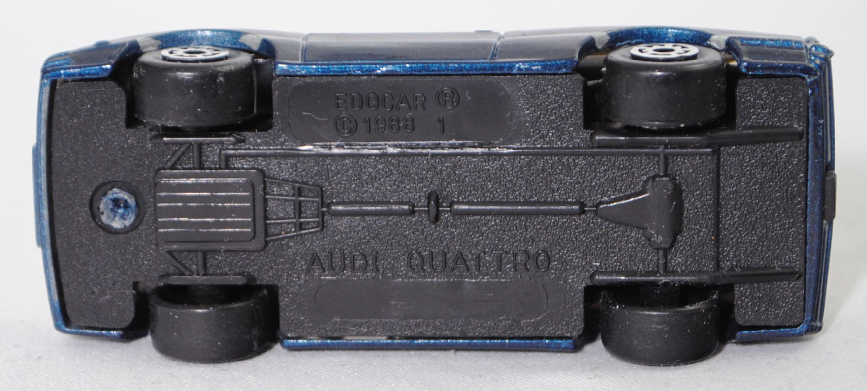 Audi quattro (1. Generation, Baureihe quattro, interne Baureihenbezeichnung B2, Typ 85Q, zweitüriger Sportwagen als Coupé mit 5 Sitzplätzen, VFL (Vorfacelift), versenkte Doppel-Halogen-Rechteckscheinwerfer mit blanken Rechteckausschnitten, gerade stehender Kühlergrill, Heckleuchten orange/rot, Heckleuchtenband rot mit integrierter Nebelschlussleuchte, schwarzer Heckspoiler, Ausstattungslinie quattro: versenkte Doppel-Halogen-Rechteckscheinwerfer mit blanken Rechteckausschnitten + Scheinwerfer-Reinigungsanlage + großer integrierter Frontspoiler + blanke Zierleiste ober- und unterhalb des Kühlergrills + in Front- und Heckschürze integrierter kunststoffummantelter Stoßfänger + seitliche Zusatzblinkleuchte + abblendbarer Sicherheitsinnenspiegel + klapp- und schwenkbare Sonnenblenden mit beleuchtetem Make-up-Spiegel auf der Beifahrerseite + abschließbarer Ablagekasten auf der Beifahrerseite mit Beleuchtung + Zweistufenschaltung und Tipp-Wisch-Kontakt für Scheibenwischer + elektrische Scheibenwaschanlage + Mittelkonsole + Schalthebelknopf und -stulpe in Leder + Türablagekästen + lederbezogenes 4-Speichen-Sportlenkrad + Sportsitze vorne + Liegesitzeinrichtung für Fahrer und Beifahrer + verstellbare Rahmenkopfstützen für Vordersitze + ausgeformte Rücksitzbank mit im Kopfraumbereich angeformter Rücksitzlehne + Stoffsitzbezüge in Quattro-Velours + schwarze Tür- und Seitenfenster-Rahmen + doppelter umlaufender Dekostreifen + Heckspoiler + zwei Rückfahrleuchten + Nebelschlußleuchte + Zierblende zwischen den Heckleuchten + rotes Leuchtband mit Schriftzug COUPÉ zwischen den Heckleuchten + Edelstahl-Auspuffanlage mit Doppelendrohr + Leichtmetallräder, vollsynchronisiertes 5-Gang-Schaltgetriebe als Mittelschaltung, permanenter Allradantrieb quattro®, Motor: Audi Typ VW EA828 wassergekühlter Fünfzylinder-Reihen-Viertakt-Otto mit KKK (Kühnle, Kopp & Kausch AG Frankenthal) K26 Abgas-Turbolader und mechanischer Einspritzanlage sowie eine obenliegende Nockenwelle (OHC = Overhead Camshaft) und 2 Ventile pro Zylinder sowie Ladeluftkühler und 2144 cm³ sowie 200 PS, Motorkennbuchstabe WR, Radstand 2524 mm, Länge 4404 mm, Modell 1980-1982), stahlblaumetallic, innen schwarz, Sitze schwarz, Lenkrad schwarz, Druck Streifen in silber auf den Seiten, Chassis schwarz, 5-Loch-Felgen in chrom (Audi Leichtmetallräder im 16-Speichen-Design (Hersteller RONAL) Größe 6 J x 15 H2 ET 45 mit Lochkreis 5 x 112 (Teilenummer 437 601 025 C) und Nabendeckel / Radzierkappe (58 mm, Teilenummer 841 601 165) sowie Reifen 205/60 VR 15), EDOCAR®, 1:58, m (Vitrinenmodell) (EAN 8711159010018)