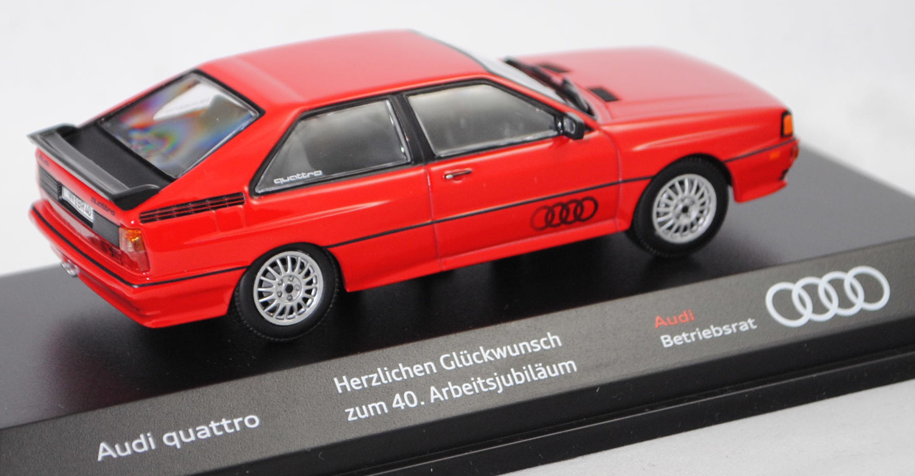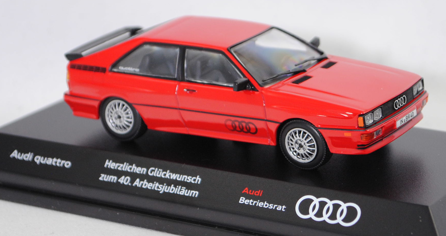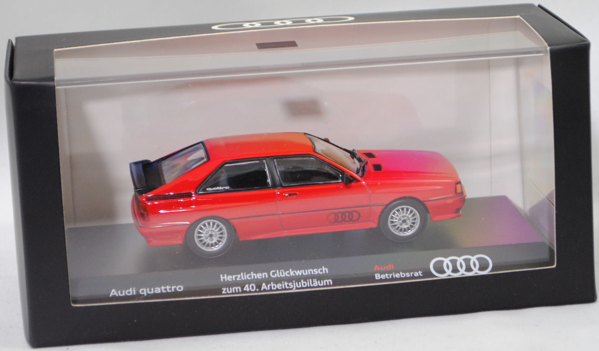 Audi quattro (1. Generation, Baureihe quattro, interne Baureihenbezeichnung B2, Typ 85Q, zweitüriger Sportwagen als Coupé mit 5 Sitzplätzen, VFL (Vorfacelift), versenkte Doppel-Halogen-Rechteckscheinwerfer mit blanken Rechteckausschnitten, gerade stehender Kühlergrill, Heckleuchten orange/rot, Heckleuchtenband rot mit integrierter Nebelschlussleuchte, schwarzer Heckspoiler, Ausstattungslinie quattro: versenkte Doppel-Halogen-Rechteckscheinwerfer mit blanken Rechteckausschnitten + Scheinwerfer-Reinigungsanlage + großer integrierter Frontspoiler + blanke Zierleiste ober- und unterhalb des Kühlergrills + in Front- und Heckschürze integrierter kunststoffummantelter Stoßfänger + seitliche Zusatzblinkleuchte + abblendbarer Sicherheitsinnenspiegel + klapp- und schwenkbare Sonnenblenden mit beleuchtetem Make-up-Spiegel auf der Beifahrerseite + abschließbarer Ablagekasten auf der Beifahrerseite mit Beleuchtung + Zweistufenschaltung und Tipp-Wisch-Kontakt für Scheibenwischer + elektrische Scheibenwaschanlage + Mittelkonsole + Schalthebelknopf und -stulpe in Leder + Türablagekästen + lederbezogenes 4-Speichen-Sportlenkrad + Sportsitze vorne + Liegesitzeinrichtung für Fahrer und Beifahrer + verstellbare Rahmenkopfstützen für Vordersitze + ausgeformte Rücksitzbank mit im Kopfraumbereich angeformter Rücksitzlehne + Stoffsitzbezüge in Quattro-Velours + schwarze Tür- und Seitenfenster-Rahmen + doppelter umlaufender Dekostreifen + Heckspoiler + zwei Rückfahrleuchten + Nebelschlußleuchte + Zierblende zwischen den Heckleuchten + rotes Leuchtband mit Schriftzug COUPÉ zwischen den Heckleuchten + Edelstahl-Auspuffanlage mit Doppelendrohr + Leichtmetallräder, vollsynchronisiertes 5-Gang-Schaltgetriebe als Mittelschaltung, permanenter Allradantrieb quattro®, Motor: Audi Typ VW EA828 wassergekühlter Fünfzylinder-Reihen-Viertakt-Otto mit KKK (Kühnle, Kopp & Kausch AG Frankenthal) K26 Abgas-Turbolader und mechanischer Einspritzanlage sowie eine obenliegende Nockenwelle (OHC = Overhead Camshaft) und 2 Ventile pro Zylinder sowie Ladeluftkühler und 2144 cm³ sowie 200 PS, Motorkennbuchstabe WR, Radstand 2524 mm, Länge 4404 mm, Modell 1980-1982, Baujahr 1981), tornadorot (Verkaufskennzeichen G2, Lacknummer LY3D), innen schwarz/eisengrau, Sitze eisengrau, Lenkrad schwarz, Audi Leichtmetallräder im 16-Speichen-Design (Hersteller RONAL) Größe 6 J x 15 H2 ET 45 mit Lochkreis 5 x 112 (Teilenummer 437 601 025 C) und Nabendeckel / Radzierkappe (58 mm, Teilenummer 841 601 165) sowie Reifen 205/60 VR 15, Minichamps, 1:43, PC-Box (Limited Edition AUDI AG 85045 Ingolstadt, Audi collection, Druck Audi quattro / Herzlichen Glückwunsch / zum 40. Arbeitsjubiläum / Audi / Betriebsrat auf der Sockelplatte) (Vitrinenmodell, Schachtel mit Lagerspuren) (EAN 4012138113220)