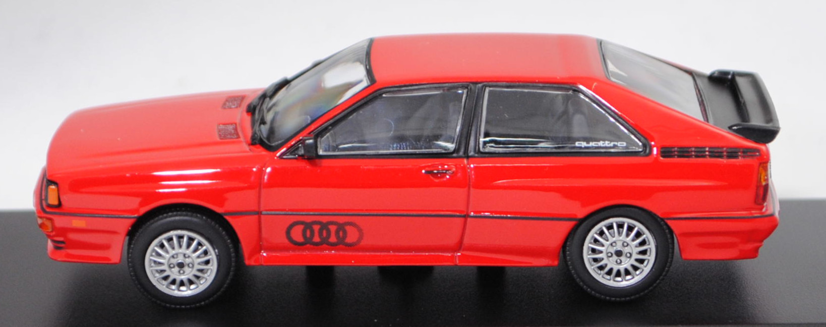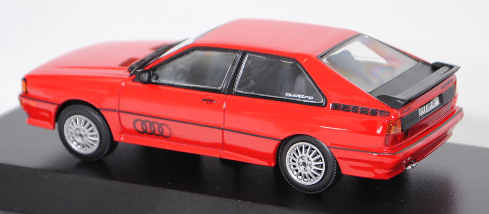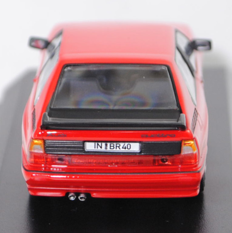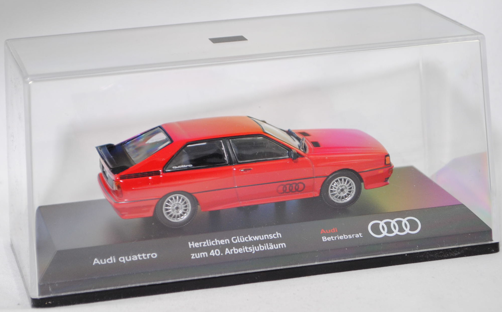 Audi quattro (1. Generation, Baureihe quattro, interne Baureihenbezeichnung B2, Typ 85Q, zweitüriger Sportwagen als Coupé mit 5 Sitzplätzen, VFL (Vorfacelift), versenkte Doppel-Halogen-Rechteckscheinwerfer mit blanken Rechteckausschnitten, gerade stehender Kühlergrill, Heckleuchten orange/rot, Heckleuchtenband rot mit integrierter Nebelschlussleuchte, schwarzer Heckspoiler, Ausstattungslinie quattro: versenkte Doppel-Halogen-Rechteckscheinwerfer mit blanken Rechteckausschnitten + Scheinwerfer-Reinigungsanlage + großer integrierter Frontspoiler + blanke Zierleiste ober- und unterhalb des Kühlergrills + in Front- und Heckschürze integrierter kunststoffummantelter Stoßfänger + seitliche Zusatzblinkleuchte + abblendbarer Sicherheitsinnenspiegel + klapp- und schwenkbare Sonnenblenden mit beleuchtetem Make-up-Spiegel auf der Beifahrerseite + abschließbarer Ablagekasten auf der Beifahrerseite mit Beleuchtung + Zweistufenschaltung und Tipp-Wisch-Kontakt für Scheibenwischer + elektrische Scheibenwaschanlage + Mittelkonsole + Schalthebelknopf und -stulpe in Leder + Türablagekästen + lederbezogenes 4-Speichen-Sportlenkrad + Sportsitze vorne + Liegesitzeinrichtung für Fahrer und Beifahrer + verstellbare Rahmenkopfstützen für Vordersitze + ausgeformte Rücksitzbank mit im Kopfraumbereich angeformter Rücksitzlehne + Stoffsitzbezüge in Quattro-Velours + schwarze Tür- und Seitenfenster-Rahmen + doppelter umlaufender Dekostreifen + Heckspoiler + zwei Rückfahrleuchten + Nebelschlußleuchte + Zierblende zwischen den Heckleuchten + rotes Leuchtband mit Schriftzug COUPÉ zwischen den Heckleuchten + Edelstahl-Auspuffanlage mit Doppelendrohr + Leichtmetallräder, vollsynchronisiertes 5-Gang-Schaltgetriebe als Mittelschaltung, permanenter Allradantrieb quattro®, Motor: Audi Typ VW EA828 wassergekühlter Fünfzylinder-Reihen-Viertakt-Otto mit KKK (Kühnle, Kopp & Kausch AG Frankenthal) K26 Abgas-Turbolader und mechanischer Einspritzanlage sowie eine obenliegende Nockenwelle (OHC = Overhead Camshaft) und 2 Ventile pro Zylinder sowie Ladeluftkühler und 2144 cm³ sowie 200 PS, Motorkennbuchstabe WR, Radstand 2524 mm, Länge 4404 mm, Modell 1980-1982, Baujahr 1981), tornadorot (Verkaufskennzeichen G2, Lacknummer LY3D), innen schwarz/eisengrau, Sitze eisengrau, Lenkrad schwarz, Audi Leichtmetallräder im 16-Speichen-Design (Hersteller RONAL) Größe 6 J x 15 H2 ET 45 mit Lochkreis 5 x 112 (Teilenummer 437 601 025 C) und Nabendeckel / Radzierkappe (58 mm, Teilenummer 841 601 165) sowie Reifen 205/60 VR 15, Minichamps, 1:43, PC-Box (Limited Edition AUDI AG 85045 Ingolstadt, Audi collection, Druck Audi quattro / Herzlichen Glückwunsch / zum 40. Arbeitsjubiläum / Audi / Betriebsrat auf der Sockelplatte) (Vitrinenmodell, Schachtel mit Lagerspuren) (EAN 4012138113220)