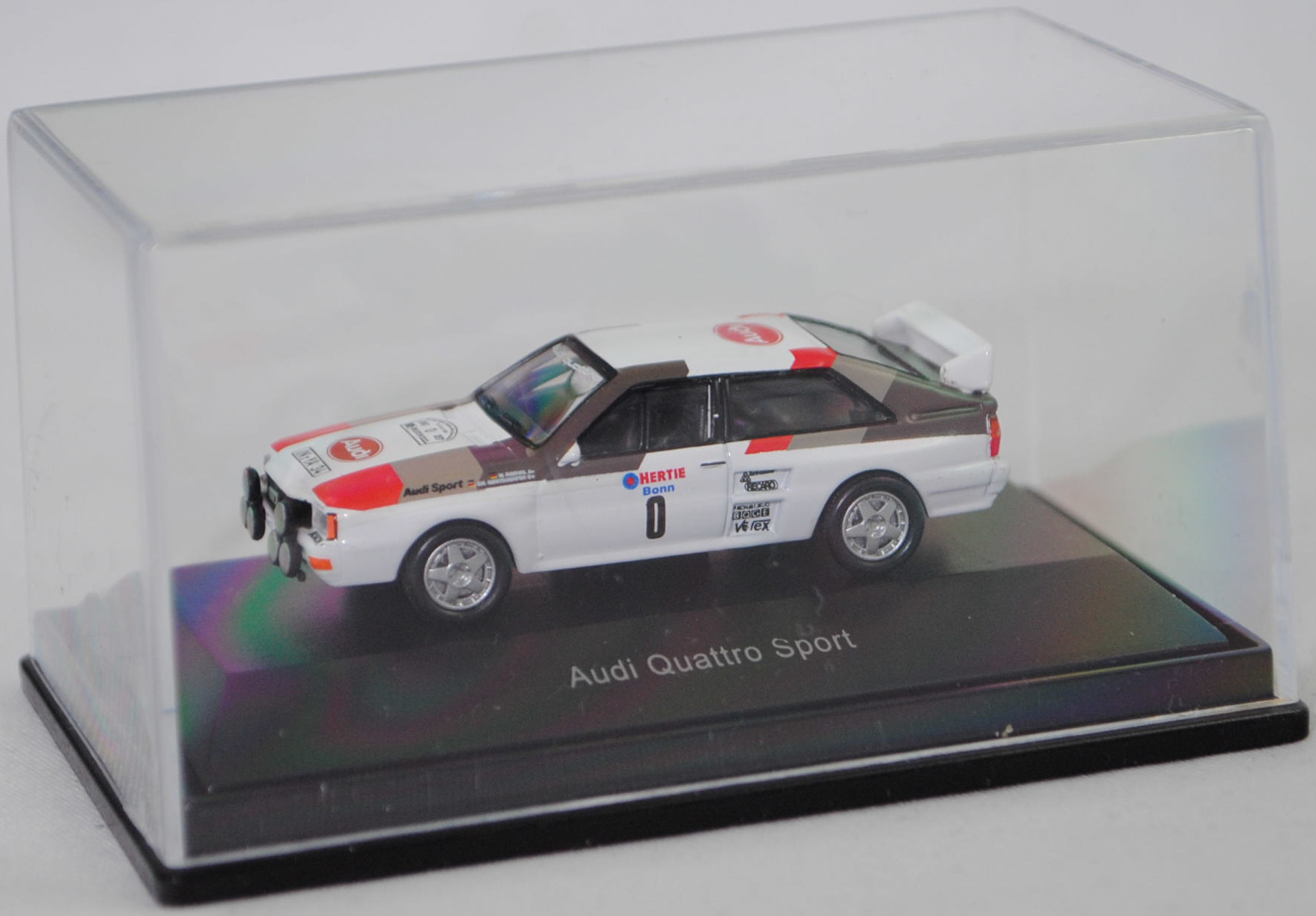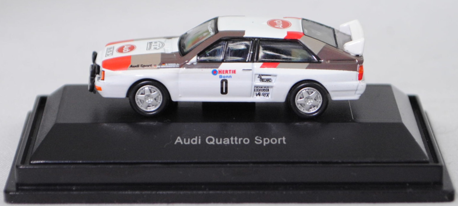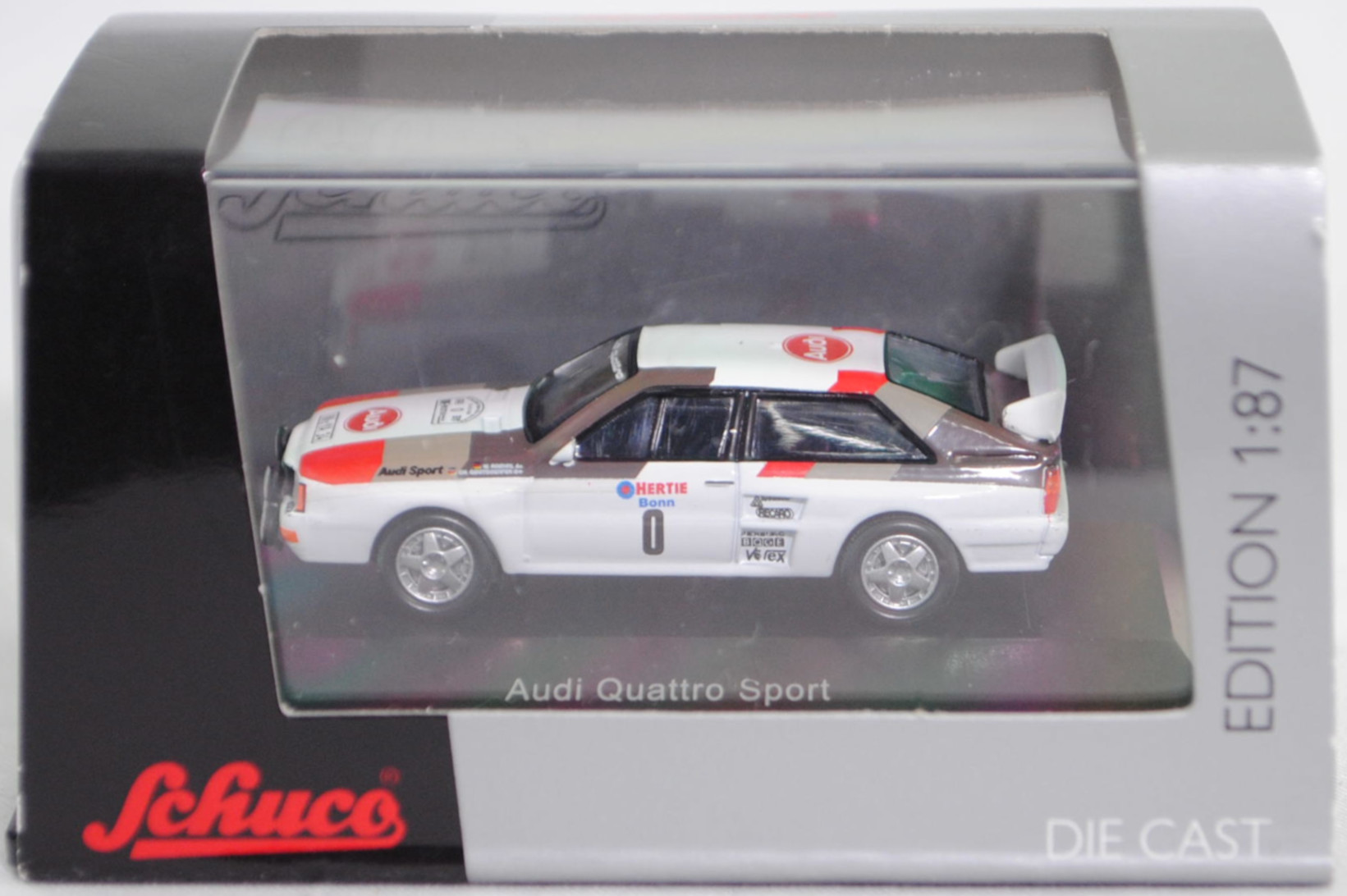 Audi quattro A2 Gruppe B (1. Generation, Baureihe quattro, interne Baureihenbezeichnung B2, Typ 85Q, interne Bezeichnung als Rennwagen R1, zweitüriger Rennwagen als Sportcoupé mit 2 Sitzplätzen, Homologationsnummer B-243 vom 01.05.1983, Ausstattungslinie quattro A2 Gruppe B: Karosserie aus Stahlblech + Matter Überrollkäfig + außen angeschraubte Verkleidungsteile + neuer Frontspoiler mit diversen Lüfteinlassöffnungen + einfache Frontscheinwerfer nur außen + Kühlergrill mittig hervorstehend + doppelter Lufteintritt rechts und links vor den Hinterrädern für Bremsen und Differential + Motorhaube und Heckklappe sowie Türen aus Kunststoff + Windschutzscheibe aus Mehrscheiben-Sicherheitsglas + eingeklebte Seiten- und Heckscheiben + 9 VDO Anzeigeninstrumente einschl. 200 km/h-Tacho + Momo Lenkrad + Recaro Sitze + Sabelt Sicherheitsgurte + feuersicherer Kraftstofftank aus Kunststoff von Seeger & Hoffmann mit 120 Liter Inhalt + Fuchs Schmiede-Leichtmetallräder im 5 Speichen-Design + MICHELIN Reifen, synchronisiertes 5-Gang-Schaltgeriebe mit Mittelschaltung, permanenter Allradantrieb quattro®, Motor: Audi Typ VW EA828 wassergekühlter Fünfzylinder-Reihen-Viertakt-Otto mit KKK (Kühnle, Kopp & Kausch AG Frankenthal) K26 oder K27 Abgas-Turbolader und mechanische Bosch Einspritzanlage sowie eine obenliegende Nockenwelle (SOHC = Single Overhead Camshaft) und 2 Ventile pro Zylinder sowie Ladeluftkühler und 2133 cm³ sowie 360 bis 400 PS, Motorkennbuchstabe WR, Radstand 2524 mm, Länge 4404 mm, Modell 1983-1984), alpinweiß (Verkaufskennzeichen P1, Farbcode L90E), innen schwarz, Sitze schwarz, Lenkrad schwarz, Druck Streifen in Audi Sport Farben blutorange (RAL 2002) / telegrau (RAL 7045) / graubraun (RAL 8019) vorne auf den Kotflügeln und den Türen sowie auf der Motorhaube und der A-Säule bis vorne auf dem Dach, Druck Streifen in Audi Sport Farben blutorange (RAL 2002) / telegrau (RAL 7045) / graubraun (RAL 8019) hinten auf den Kotflügeln und der C-Säule bis hinten auf dem Dach, Druck Audi Sport / HERTIE Bonn / 0 / KKK Turbolader / RECARO / PIERBURG / BOGE / Votex in verkehrsrot/enzianblau/schwarz auf den Seiten, Druck Rallyeschild zur 12. Internationale ADAC-Rallye Köln-Ahrweiler 1983 (12. bis 13. November 1983, Länge aller Wertungsprüfungen (WP's) 109,62 km, Gesamtlänge einschließlich Verbindungsetappen 895,0 km, als 8. Lauf zum West Euro Rally Cup 1983 / 16. Lauf zur Niederländische Rallye-Meisterschaft 1983 / 9. Lauf zur Niederländische Nationale Meisterschaft 1983) mit Startnummer 0 mittig von vorne aus lesbar oben auf der Motorhaube, Druck Ellipse mit Umrandung in dunkel-blutorange mittig auf der Motorhaube wobei Audi von vorne aus lesbar in Wagenfarbe durchschimmert, Druck Ellipse mit Umrandung in dunkel-blutorange hinten mittig auf dem Dach wobei Audi von hinten aus lesbar in Wagenfarbe durchschimmert, Druck BOSCH in schwarz oben auf dem vorderen Stoßfänger unter den Frontscheinwerfern, Druck Audi quattro in reinweiß oben auf der Windschutzscheibe, Heckklappe oben und stirnseitig oben graubraun, Fahrer: Walter Röhrl / Christian Geistdörfer (Vorausfahrzeug, Startnummer 0, Ausfall durch Überschlag, Zeit: - Stunden), Team: Audi Sport, Nummernschilder IN-YA 34 vorne oben auf der Motorhaube und hinten, Sponsoren: Audi Sport / KKK Turbolader / RECARO / PIERBURG / BOGE / Votex, mit BOSCH Zusatzscheinwerfer, Fuchs Schmiede-Leichtmetallräder im 5 Speichen-Design, Schuco EDITION 1:87, 1:87, PC-Box (Limited Edition) (Vitrinenmodell, Schachtel mit Lagerspuren) (EAN 4007864257454)