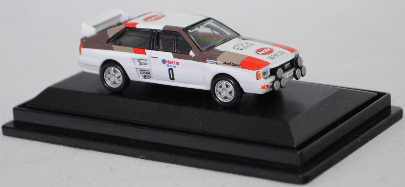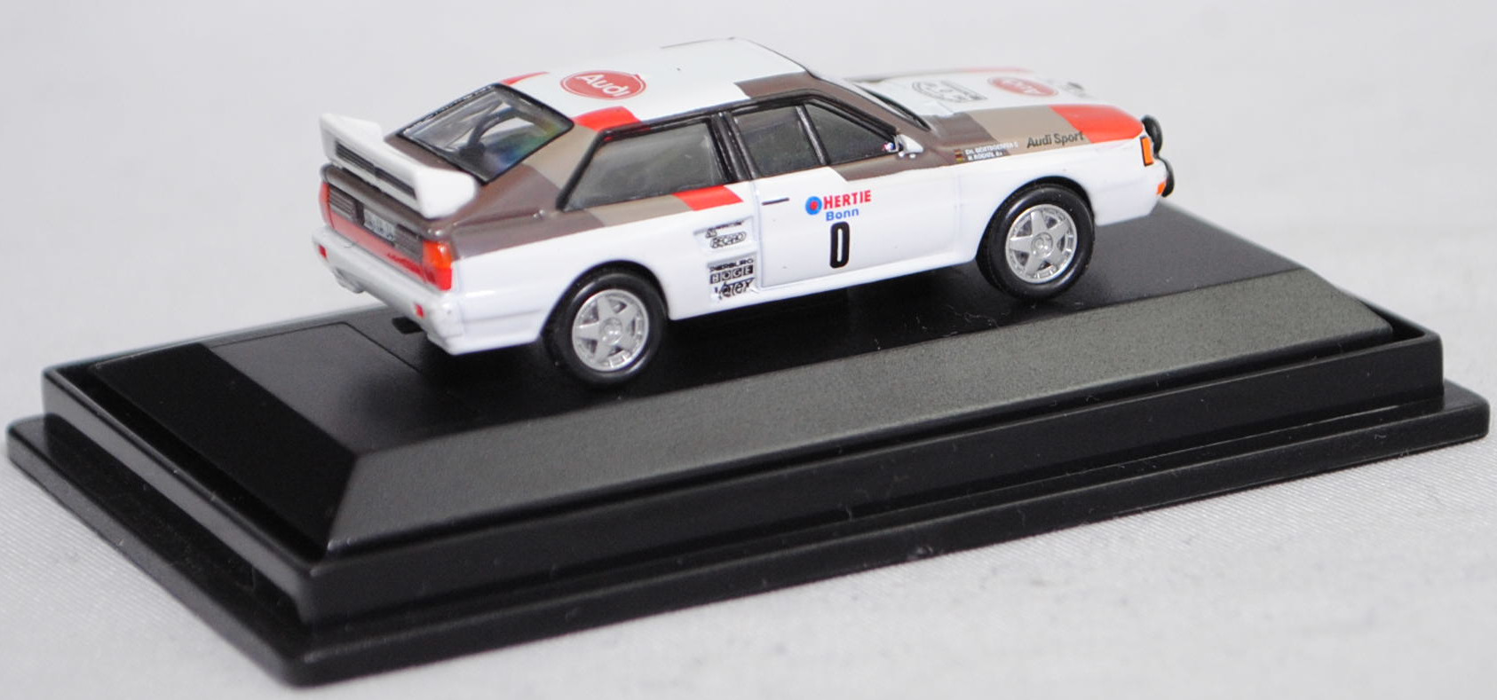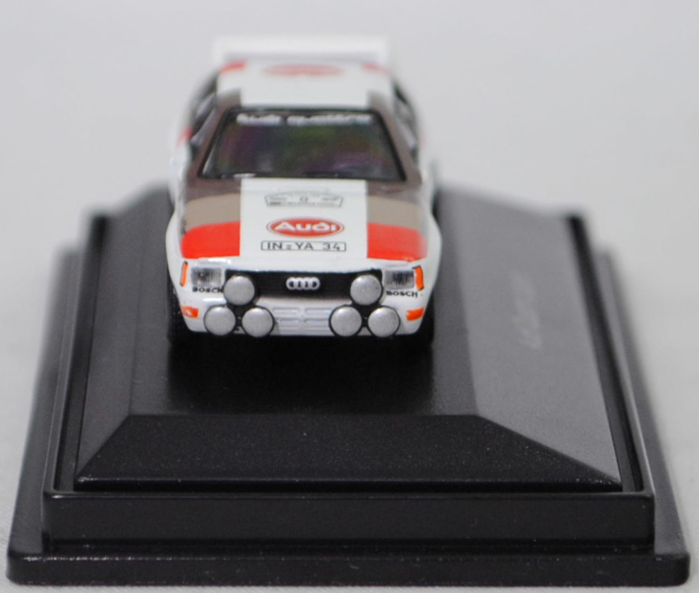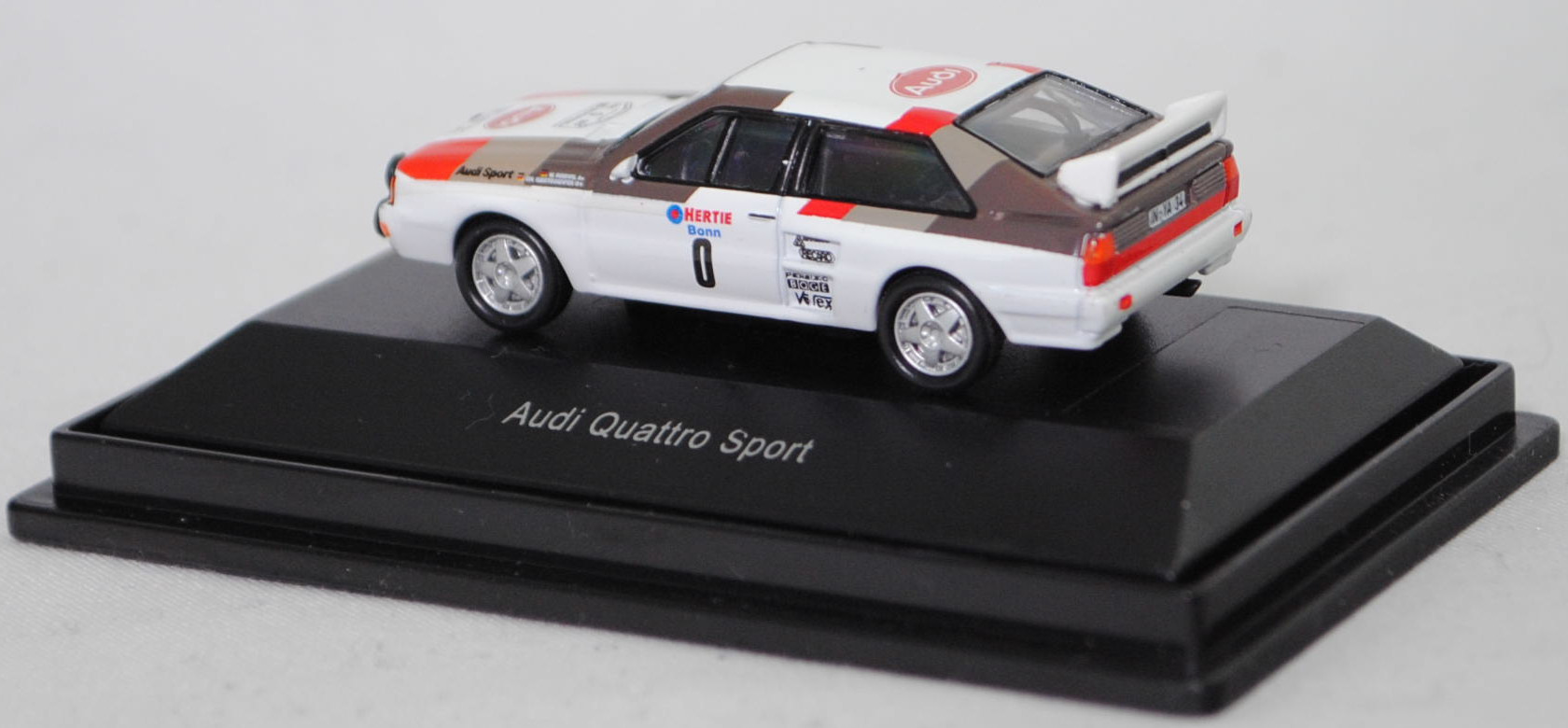 Audi quattro A2 Gruppe B (1. Generation, Baureihe quattro, interne Baureihenbezeichnung B2, Typ 85Q, interne Bezeichnung als Rennwagen R1, zweitüriger Rennwagen als Sportcoupé mit 2 Sitzplätzen, Homologationsnummer B-243 vom 01.05.1983, Ausstattungslinie quattro A2 Gruppe B: Karosserie aus Stahlblech + Matter Überrollkäfig + außen angeschraubte Verkleidungsteile + neuer Frontspoiler mit diversen Lüfteinlassöffnungen + einfache Frontscheinwerfer nur außen + Kühlergrill mittig hervorstehend + doppelter Lufteintritt rechts und links vor den Hinterrädern für Bremsen und Differential + Motorhaube und Heckklappe sowie Türen aus Kunststoff + Windschutzscheibe aus Mehrscheiben-Sicherheitsglas + eingeklebte Seiten- und Heckscheiben + 9 VDO Anzeigeninstrumente einschl. 200 km/h-Tacho + Momo Lenkrad + Recaro Sitze + Sabelt Sicherheitsgurte + feuersicherer Kraftstofftank aus Kunststoff von Seeger & Hoffmann mit 120 Liter Inhalt + Fuchs Schmiede-Leichtmetallräder im 5 Speichen-Design + MICHELIN Reifen, synchronisiertes 5-Gang-Schaltgeriebe mit Mittelschaltung, permanenter Allradantrieb quattro®, Motor: Audi Typ VW EA828 wassergekühlter Fünfzylinder-Reihen-Viertakt-Otto mit KKK (Kühnle, Kopp & Kausch AG Frankenthal) K26 oder K27 Abgas-Turbolader und mechanische Bosch Einspritzanlage sowie eine obenliegende Nockenwelle (SOHC = Single Overhead Camshaft) und 2 Ventile pro Zylinder sowie Ladeluftkühler und 2133 cm³ sowie 360 bis 400 PS, Motorkennbuchstabe WR, Radstand 2524 mm, Länge 4404 mm, Modell 1983-1984), alpinweiß (Verkaufskennzeichen P1, Farbcode L90E), innen schwarz, Sitze schwarz, Lenkrad schwarz, Druck Streifen in Audi Sport Farben blutorange (RAL 2002) / telegrau (RAL 7045) / graubraun (RAL 8019) vorne auf den Kotflügeln und den Türen sowie auf der Motorhaube und der A-Säule bis vorne auf dem Dach, Druck Streifen in Audi Sport Farben blutorange (RAL 2002) / telegrau (RAL 7045) / graubraun (RAL 8019) hinten auf den Kotflügeln und der C-Säule bis hinten auf dem Dach, Druck Audi Sport / HERTIE Bonn / 0 / KKK Turbolader / RECARO / PIERBURG / BOGE / Votex in verkehrsrot/enzianblau/schwarz auf den Seiten, Druck Rallyeschild zur 12. Internationale ADAC-Rallye Köln-Ahrweiler 1983 (12. bis 13. November 1983, Länge aller Wertungsprüfungen (WP's) 109,62 km, Gesamtlänge einschließlich Verbindungsetappen 895,0 km, als 8. Lauf zum West Euro Rally Cup 1983 / 16. Lauf zur Niederländische Rallye-Meisterschaft 1983 / 9. Lauf zur Niederländische Nationale Meisterschaft 1983) mit Startnummer 0 mittig von vorne aus lesbar oben auf der Motorhaube, Druck Ellipse mit Umrandung in dunkel-blutorange mittig auf der Motorhaube wobei Audi von vorne aus lesbar in Wagenfarbe durchschimmert, Druck Ellipse mit Umrandung in dunkel-blutorange hinten mittig auf dem Dach wobei Audi von hinten aus lesbar in Wagenfarbe durchschimmert, Druck BOSCH in schwarz oben auf dem vorderen Stoßfänger unter den Frontscheinwerfern, Druck Audi quattro in reinweiß oben auf der Windschutzscheibe, Heckklappe oben und stirnseitig oben graubraun, Fahrer: Walter Röhrl / Christian Geistdörfer (Vorausfahrzeug, Startnummer 0, Ausfall durch Überschlag, Zeit: - Stunden), Team: Audi Sport, Nummernschilder IN-YA 34 vorne oben auf der Motorhaube und hinten, Sponsoren: Audi Sport / KKK Turbolader / RECARO / PIERBURG / BOGE / Votex, mit BOSCH Zusatzscheinwerfer, Fuchs Schmiede-Leichtmetallräder im 5 Speichen-Design, Schuco EDITION 1:87, 1:87, PC-Box (Limited Edition) (Vitrinenmodell, Schachtel mit Lagerspuren) (EAN 4007864257454)