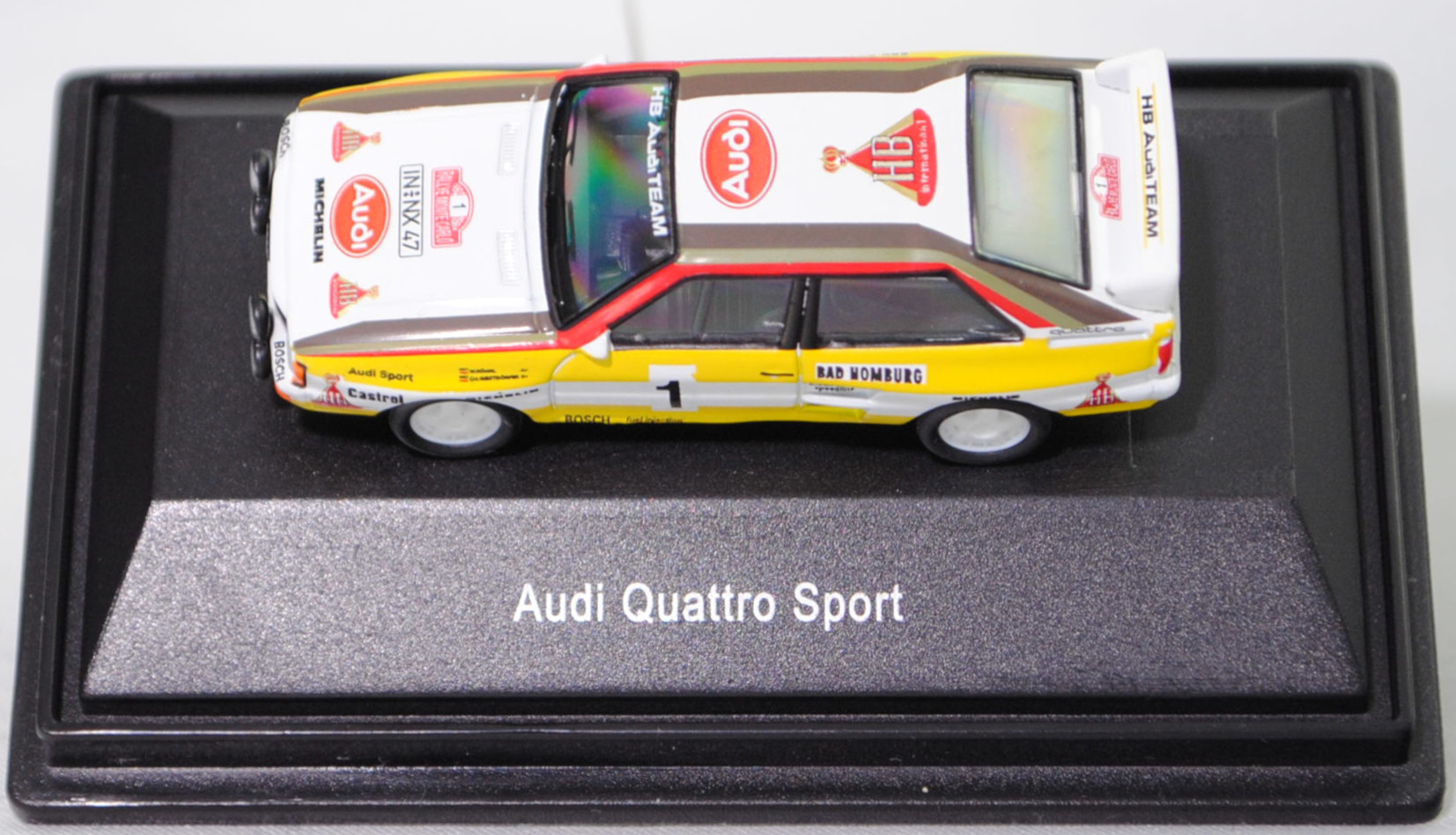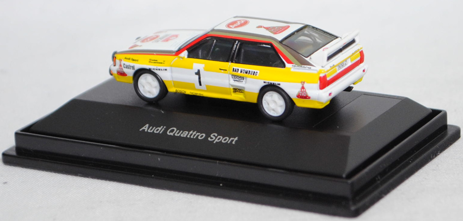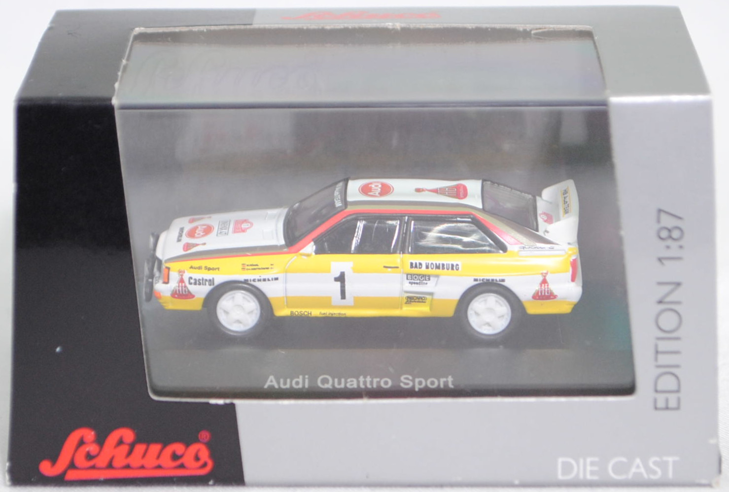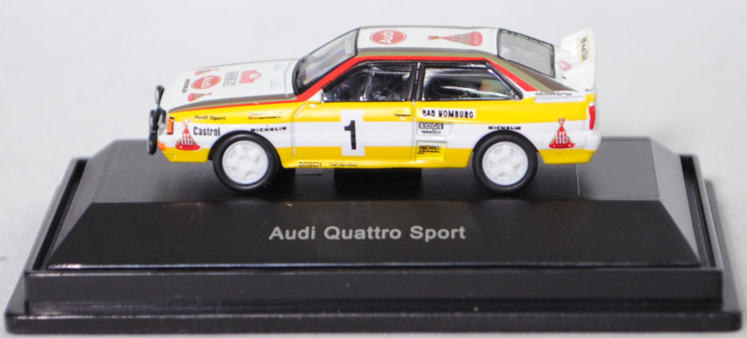 Audi quattro A2 Gruppe B (1. Generation, Baureihe quattro, interne Baureihenbezeichnung B2, Typ 85Q, interne Bezeichnung als Rennwagen R1, zweitüriger Rennwagen als Sportcoupé mit 2 Sitzplätzen, Homologationsnummer B-243 vom 01.05.1983, Ausstattungslinie quattro A2 Gruppe B: Karosserie aus Stahlblech + Matter Überrollkäfig + außen angeschraubte Verkleidungsteile + neuer Frontspoiler mit diversen Lüfteinlassöffnungen + einfache Frontscheinwerfer nur außen + Kühlergrill mittig hervorstehend + doppelter Lufteintritt rechts und links vor den Hinterrädern für Bremsen und Differential + Motorhaube und Heckklappe sowie Türen aus Kunststoff + Windschutzscheibe aus Mehrscheiben-Sicherheitsglas + eingeklebte Seiten- und Heckscheiben + 9 VDO Anzeigeninstrumente einschl. 200 km/h-Tacho + Momo Lenkrad + Recaro Sitze + Sabelt Sicherheitsgurte + feuersicherer Kraftstofftank aus Kunststoff von Seeger & Hoffmann mit 120 Liter Inhalt + Fuchs Schmiede-Leichtmetallräder im 5 Speichen-Design + MICHELIN Reifen, synchronisiertes 5-Gang-Schaltgeriebe mit Mittelschaltung, permanenter Allradantrieb quattro®, Motor: Audi Typ VW EA828 wassergekühlter Fünfzylinder-Reihen-Viertakt-Otto mit KKK (Kühnle, Kopp & Kausch AG Frankenthal) K26 oder K27 Abgas-Turbolader und mechanische Bosch Einspritzanlage sowie eine obenliegende Nockenwelle (SOHC = Single Overhead Camshaft) und 2 Ventile pro Zylinder sowie Ladeluftkühler und 2133 cm³ sowie 360 bis 400 PS, Motorkennbuchstabe WR, Radstand 2524 mm, Länge 4404 mm, Modell 1983-1984), alpinweiß (Verkaufskennzeichen P1, Farbcode L90E), innen schwarz, Sitze schwarz, Lenkrad schwarz, Druck Streifen in zinkgelb auf Höhe der Gürtellinie auf den Seiten und hinten sowie unten umlaufend, Druck HB / Audi Sport / Castrol / MICHELIN / 1 / BOSCH fuel injection / BAD HOMBURG / BOGE / speedline / RECARO / KKK Turbolader / MICHELIN / quattro / HB in verkehrsrot/schwarz auf den Seiten, Druck durchgehende Streifen in Audi Sport Farben blutorange (RAL 2002) / telegrau (RAL 7045) / graubraun (RAL 8019) oben auf den Seiten der Motorhaube über die A-Säule und dem Dach zur C-Säule, Druck Rallyeschild zur 52. Rallye Monte Carlo 1984 (offiziell Rallye Automobile Monte-Carlo, 21. bis 27. Januar 1984, Länge aller Wertungsprüfungen (WP's) 753,2 km, Gesamtlänge einschließlich Verbindungsetappen 3328,90 km, als 1. Lauf zur FIA-Rallye-Weltmeisterschaft 1984) mit Startnummer 1 mittig von vorne aus lesbar auf der Motorhaube und oben von hinten aus lesbar auf der Heckklappe, Druck Ellipse mit Umrandung in dunkel-blutorange mittig auf der Motorhaube wobei Audi von vorne aus lesbar in Wagenfarbe durchschimmert, zusätzlicher Druck MICHELIN in schwarz mittig vorne sowie 2x HB in verkehrsrot/gold/schwarz rechts und links vorne von vorne aus lesbar auf der Motorhaube, Druck Ellipse mit Umrandung in dunkel-blutorange vorne mittig auf dem Dach wobei Audi von hinten aus lesbar in Wagenfarbe durchschimmert, zusätzlicher Druck HB in verkehrsrot/gold/schwarz hinten mittig von hinten aus lesbar auf dem Dach, Druck BOSCH in schwarz oben auf dem vorderen Stoßfänger unter den Frontscheinwerfern, Druck HB Audi TEAM in reinweiß oben auf der Windschutzscheibe, Druck HB Audi TEAM in schwarz und zwei Streifen in zinkgelb oben auf dem Heckflügel, Fahrer: Walter Röhrl / Christian Geistdörfer (1. Platz, Zeit: 8:52:29 Stunden), Team: HB Audi Sport, Nummernschilder IN-NX 47 vorne oben auf der Motorhaube und hinten, Sponsoren: HB / Audi Sport / Castrol / MICHELIN / BOSCH fuel injection / BAD HOMBURG / BOGE speedline / RECARO / KKK Turbolader, mit BOSCH Zusatzscheinwerfer, Fuchs Schmiede-Leichtmetallräder im 5 Speichen-Design, Schuco EDITION 1:87, 1:87, PC-Box (Limited Edition) (Vitrinenmodell, Schachtel mit Lagerspuren) (EAN 4007864255948)