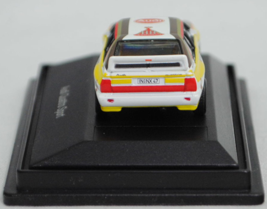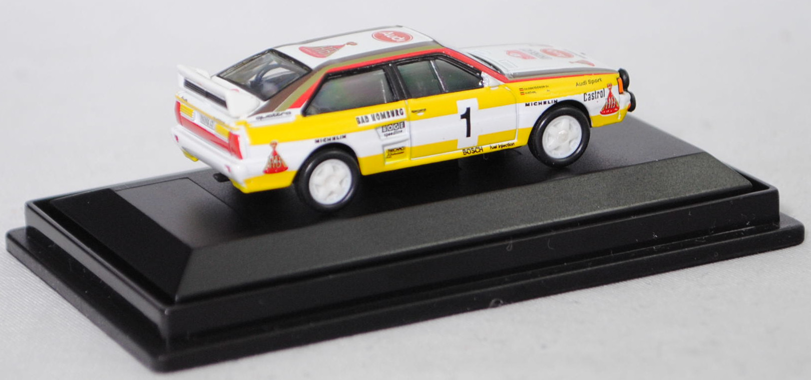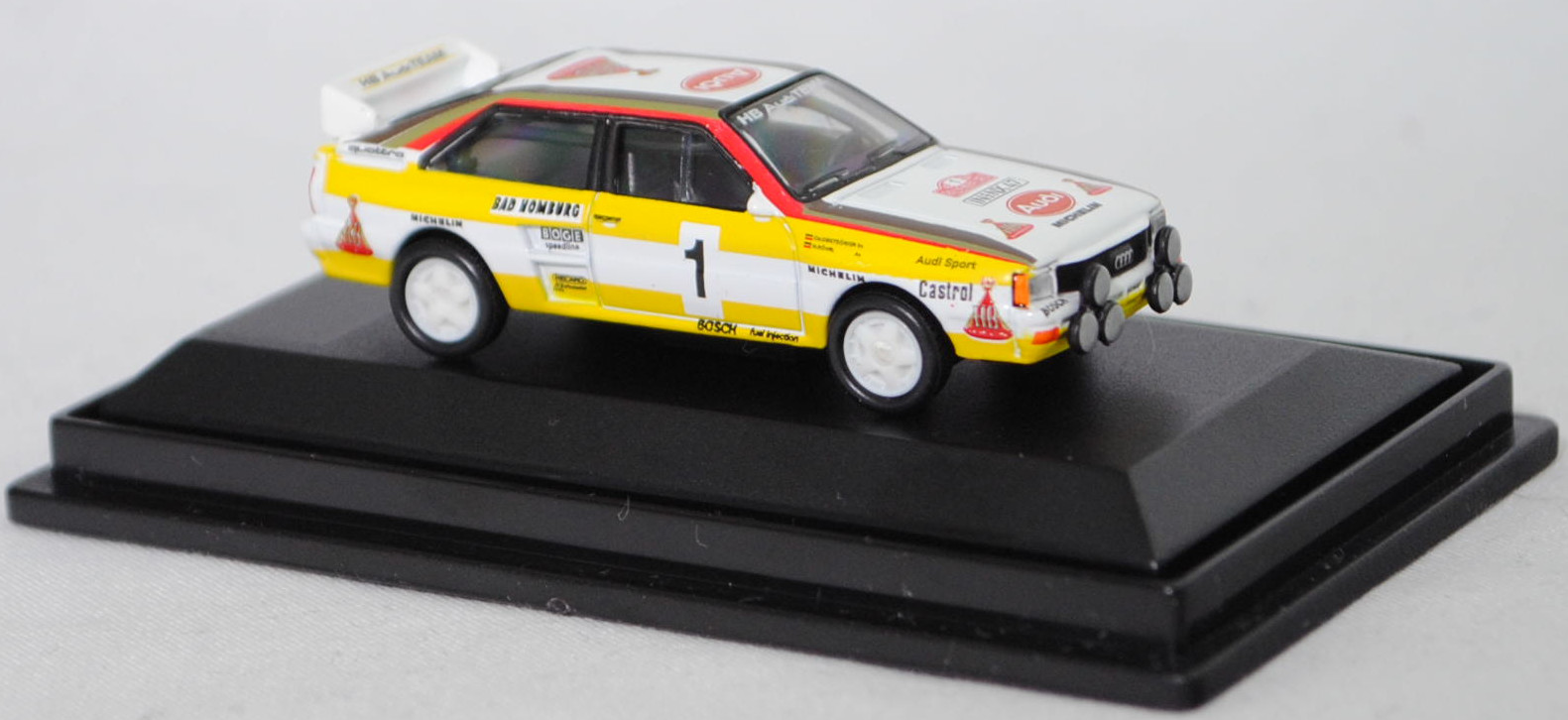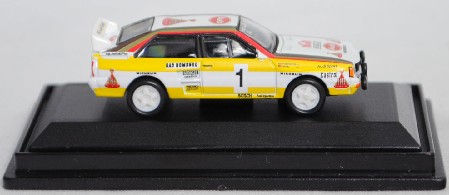 Audi quattro A2 Gruppe B (1. Generation, Baureihe quattro, interne Baureihenbezeichnung B2, Typ 85Q, interne Bezeichnung als Rennwagen R1, zweitüriger Rennwagen als Sportcoupé mit 2 Sitzplätzen, Homologationsnummer B-243 vom 01.05.1983, Ausstattungslinie quattro A2 Gruppe B: Karosserie aus Stahlblech + Matter Überrollkäfig + außen angeschraubte Verkleidungsteile + neuer Frontspoiler mit diversen Lüfteinlassöffnungen + einfache Frontscheinwerfer nur außen + Kühlergrill mittig hervorstehend + doppelter Lufteintritt rechts und links vor den Hinterrädern für Bremsen und Differential + Motorhaube und Heckklappe sowie Türen aus Kunststoff + Windschutzscheibe aus Mehrscheiben-Sicherheitsglas + eingeklebte Seiten- und Heckscheiben + 9 VDO Anzeigeninstrumente einschl. 200 km/h-Tacho + Momo Lenkrad + Recaro Sitze + Sabelt Sicherheitsgurte + feuersicherer Kraftstofftank aus Kunststoff von Seeger & Hoffmann mit 120 Liter Inhalt + Fuchs Schmiede-Leichtmetallräder im 5 Speichen-Design + MICHELIN Reifen, synchronisiertes 5-Gang-Schaltgeriebe mit Mittelschaltung, permanenter Allradantrieb quattro®, Motor: Audi Typ VW EA828 wassergekühlter Fünfzylinder-Reihen-Viertakt-Otto mit KKK (Kühnle, Kopp & Kausch AG Frankenthal) K26 oder K27 Abgas-Turbolader und mechanische Bosch Einspritzanlage sowie eine obenliegende Nockenwelle (SOHC = Single Overhead Camshaft) und 2 Ventile pro Zylinder sowie Ladeluftkühler und 2133 cm³ sowie 360 bis 400 PS, Motorkennbuchstabe WR, Radstand 2524 mm, Länge 4404 mm, Modell 1983-1984), alpinweiß (Verkaufskennzeichen P1, Farbcode L90E), innen schwarz, Sitze schwarz, Lenkrad schwarz, Druck Streifen in zinkgelb auf Höhe der Gürtellinie auf den Seiten und hinten sowie unten umlaufend, Druck HB / Audi Sport / Castrol / MICHELIN / 1 / BOSCH fuel injection / BAD HOMBURG / BOGE / speedline / RECARO / KKK Turbolader / MICHELIN / quattro / HB in verkehrsrot/schwarz auf den Seiten, Druck durchgehende Streifen in Audi Sport Farben blutorange (RAL 2002) / telegrau (RAL 7045) / graubraun (RAL 8019) oben auf den Seiten der Motorhaube über die A-Säule und dem Dach zur C-Säule, Druck Rallyeschild zur 52. Rallye Monte Carlo 1984 (offiziell Rallye Automobile Monte-Carlo, 21. bis 27. Januar 1984, Länge aller Wertungsprüfungen (WP's) 753,2 km, Gesamtlänge einschließlich Verbindungsetappen 3328,90 km, als 1. Lauf zur FIA-Rallye-Weltmeisterschaft 1984) mit Startnummer 1 mittig von vorne aus lesbar auf der Motorhaube und oben von hinten aus lesbar auf der Heckklappe, Druck Ellipse mit Umrandung in dunkel-blutorange mittig auf der Motorhaube wobei Audi von vorne aus lesbar in Wagenfarbe durchschimmert, zusätzlicher Druck MICHELIN in schwarz mittig vorne sowie 2x HB in verkehrsrot/gold/schwarz rechts und links vorne von vorne aus lesbar auf der Motorhaube, Druck Ellipse mit Umrandung in dunkel-blutorange vorne mittig auf dem Dach wobei Audi von hinten aus lesbar in Wagenfarbe durchschimmert, zusätzlicher Druck HB in verkehrsrot/gold/schwarz hinten mittig von hinten aus lesbar auf dem Dach, Druck BOSCH in schwarz oben auf dem vorderen Stoßfänger unter den Frontscheinwerfern, Druck HB Audi TEAM in reinweiß oben auf der Windschutzscheibe, Druck HB Audi TEAM in schwarz und zwei Streifen in zinkgelb oben auf dem Heckflügel, Fahrer: Walter Röhrl / Christian Geistdörfer (1. Platz, Zeit: 8:52:29 Stunden), Team: HB Audi Sport, Nummernschilder IN-NX 47 vorne oben auf der Motorhaube und hinten, Sponsoren: HB / Audi Sport / Castrol / MICHELIN / BOSCH fuel injection / BAD HOMBURG / BOGE speedline / RECARO / KKK Turbolader, mit BOSCH Zusatzscheinwerfer, Fuchs Schmiede-Leichtmetallräder im 5 Speichen-Design, Schuco EDITION 1:87, 1:87, PC-Box (Limited Edition) (Vitrinenmodell, Schachtel mit Lagerspuren) (EAN 4007864255948)