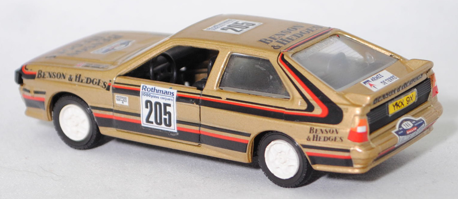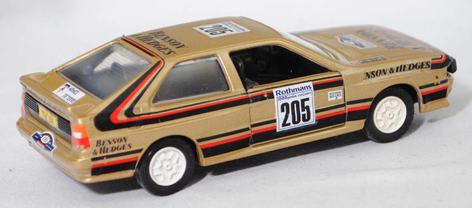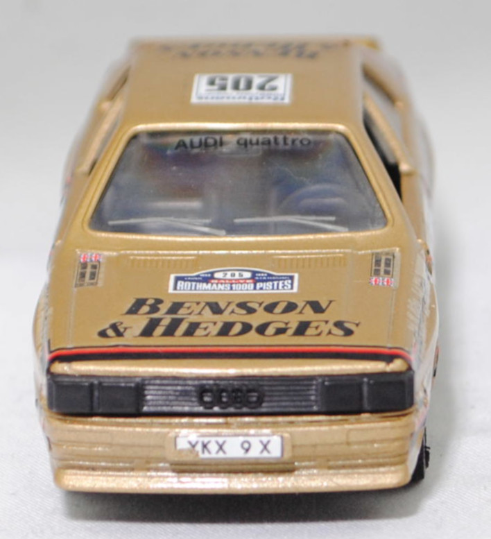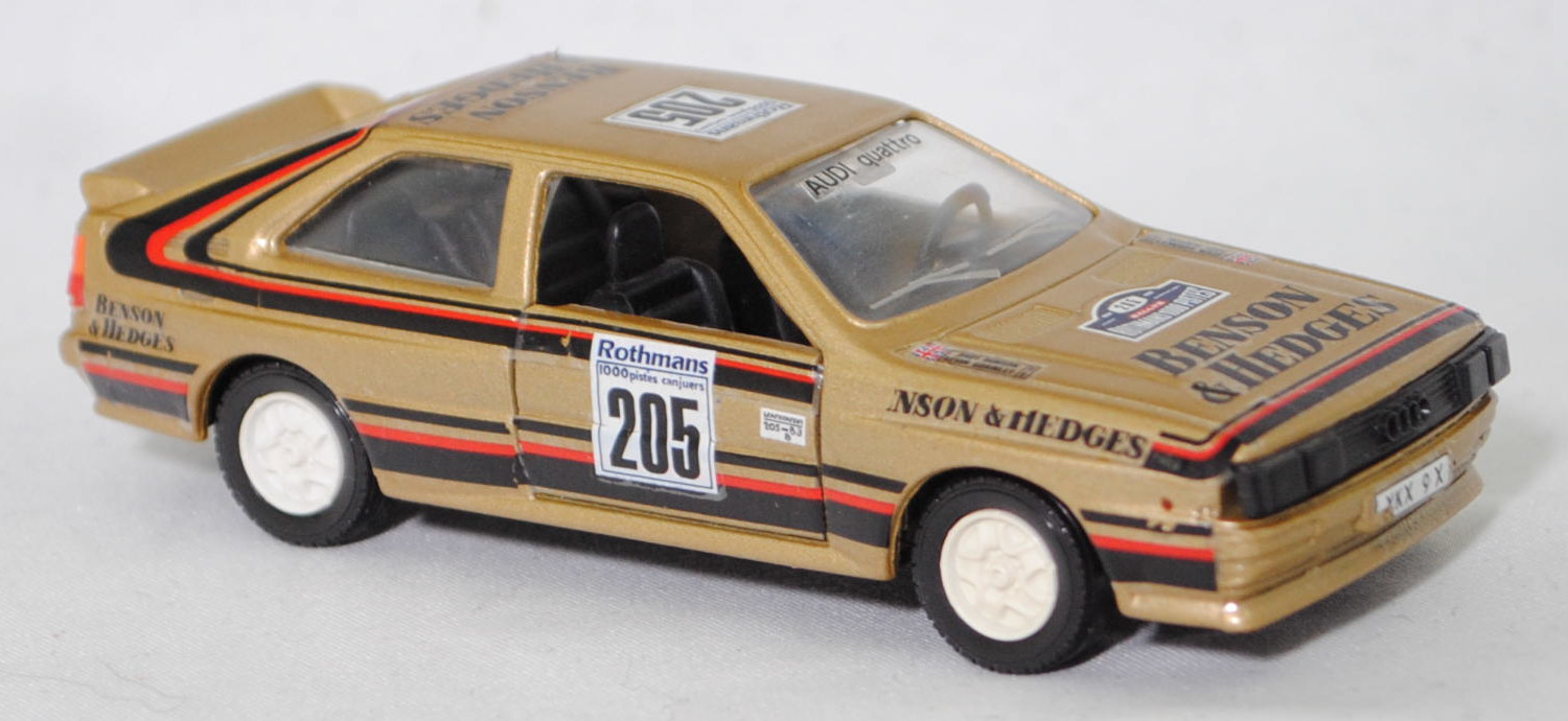 Audi quattro (1. Generation, Baureihe quattro, interne Baureihenbezeichnung B2, Typ 85Q, zweitüriger Sportwagen als Coupé mit 5 Sitzplätzen, VFL (Vorfacelift), versenkte Doppel-Halogen-Rechteckscheinwerfer mit blanken Rechteckausschnitten, gerade stehender Kühlergrill, Heckleuchten orange/rot, Heckleuchtenband rot mit integrierter Nebelschlussleuchte, schwarzer Heckspoiler, Ausstattungslinie quattro: versenkte Doppel-Halogen-Rechteckscheinwerfer mit blanken Rechteckausschnitten + Scheinwerfer-Reinigungsanlage + großer integrierter Frontspoiler + blanke Zierleiste ober- und unterhalb des Kühlergrills + in Front- und Heckschürze integrierter kunststoffummantelter Stoßfänger + seitliche Zusatzblinkleuchte + abblendbarer Sicherheitsinnenspiegel + klapp- und schwenkbare Sonnenblenden mit beleuchtetem Make-up-Spiegel auf der Beifahrerseite + abschließbarer Ablagekasten auf der Beifahrerseite mit Beleuchtung + Zweistufenschaltung und Tipp-Wisch-Kontakt für Scheibenwischer + elektrische Scheibenwaschanlage + Mittelkonsole + Schalthebelknopf und -stulpe in Leder + Türablagekästen + lederbezogenes 4-Speichen-Sportlenkrad + Sportsitze vorne + Liegesitzeinrichtung für Fahrer und Beifahrer + verstellbare Rahmenkopfstützen für Vordersitze + ausgeformte Rücksitzbank mit im Kopfraumbereich angeformter Rücksitzlehne + Stoffsitzbezüge in Quattro-Velours + schwarze Tür- und Seitenfenster-Rahmen + doppelter umlaufender Dekostreifen + Heckspoiler + zwei Rückfahrleuchten + Nebelschlußleuchte + Zierblende zwischen den Heckleuchten + rotes Leuchtband mit Schriftzug COUPÉ zwischen den Heckleuchten + Edelstahl-Auspuffanlage mit Doppelendrohr + Leichtmetallräder, vollsynchronisiertes 5-Gang-Schaltgetriebe als Mittelschaltung, permanenter Allradantrieb quattro®, Motor: Audi Typ VW EA828 wassergekühlter Fünfzylinder-Reihen-Viertakt-Otto mit KKK (Kühnle, Kopp & Kausch AG Frankenthal) K26 Abgas-Turbolader und mechanischer Einspritzanlage sowie eine obenliegende Nockenwelle (OHC = Overhead Camshaft) und 2 Ventile pro Zylinder sowie Ladeluftkühler und 2144 cm³ sowie 200 PS, Motorkennbuchstabe WR, Radstand 2524 mm, Länge 4404 mm, Modell 1980-1982, Baujahr 1981) Rallye, goldmetallic, innen schwarz, Sitze schwarz, Lenkrad schwarz, Aufkleber BENSON & HEDGES in schwarz vorne und hinten auf den Kotflügeln, Aufkleber Schild mit Startnummer 205 und Klasse B3 in schwarz auf Rechteck in reinweiß und Rallyeschild Rothmans / 1000 pistes canjuers / 205 in schwarz auf Quadrat in reinweiß auf den Türen, Aufkleber Rallyeschild in reinweiß/gold/stahlblau/verkehrsrot mit der Startnummer 205 in schwarz und 1986 / RALLYE / ROTHMANS 1000 PISTES in reinweiß sowie BENSON / & HEDGES in schwarz von vorne aus lesbar mittig auf der Motorhaube, Aufkleber Andy Dawson / Kevin Gormley in schwarz mit Flagge Union Jack in stahlblau/verkehrsrot/reinweiß oben auf den Außenseiten auf der Motorhaube, Rallyeschild Rothmans / 1000 pistes canjuers / 205 in schwarz auf Quadrat in reinweiß und BENSON / & HEDGES in schwarz jeweils von hinten aus lesbar auf dem Dach, Aufkleber Logo in stahlblau/verkehrsrot und ARMEE / DE TERRE in stahlblau auf Rechteck in reinweiß oben auf der Heckklappe, Aufkleber BENSON & HEDGES in schwarz hinten oben auf der Heckklappe, Aufkleber Rallyeschild in reinweiß/gold/stahlblau/verkehrsrot mit der Startnummer 205 in schwarz und 1986 / RALLYE / ROTHMANS 1000 PISTES in reinweiß hinten auf dem Stoßfänger, Aufkleber Nummernschild YKX 9X in schwarz auf reinweiß vorne und in schwarz auf verkehrsgelb hinten, Aufkleber Audi quattro in schwarz oben auf der Windschutzscheibe, Aufkleber BENSON & HEDGES in reinweiß oben auf der Heckscheibe, Aufkleber Streifen in verkehrsrot/schwarz unten auf den Seiten und hinten sowie auf Höhe der Gürtellinie auf den Seiten und über die Motorhaube sowie der C-Säule und dem Dach, Design wie beim Original Audi quattro A2 Gruppe B (Homologationsnummer B-243 vom 01.05.1983) bei der 11. Rallye des 1000 Pistes 1986 (04. bis 06. Juli 1986, Länge aller Wertungsprüfungen (WP's): 157,70 km) mit Fahrer Andy Dawson / Kevin Gormley (Ausfall auf WP7 von 10 mit Schaden an der Aufhängung) für das Team BENSON & HEDGES und der Startnummer 205 sowie dem Nummernschild YKX 9X, Fuchs Schmiede-LM-Räder mit 5 Speichen und MICHELIN-Reifen (Serie: Audi Leichtmetallräder im 16-Speichen-Design (Hersteller RONAL) Größe 6 J x 15 H2 ET 45 mit Lochkreis 5 x 112 (Teilenummer 437 601 025 C) und Nabendeckel / Radzierkappe (58 mm, Teilenummer 841 601 165) sowie Reifen 205/60 VR 15), VEREM, 1:43, m (Vitrinenmodell, Aufkleber mit minimalen Fehlern) (EAN 3467300007257)