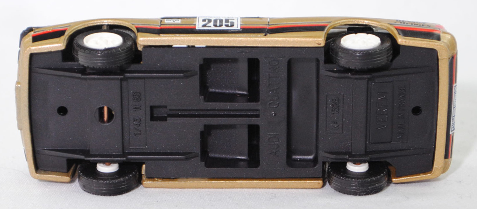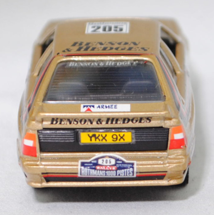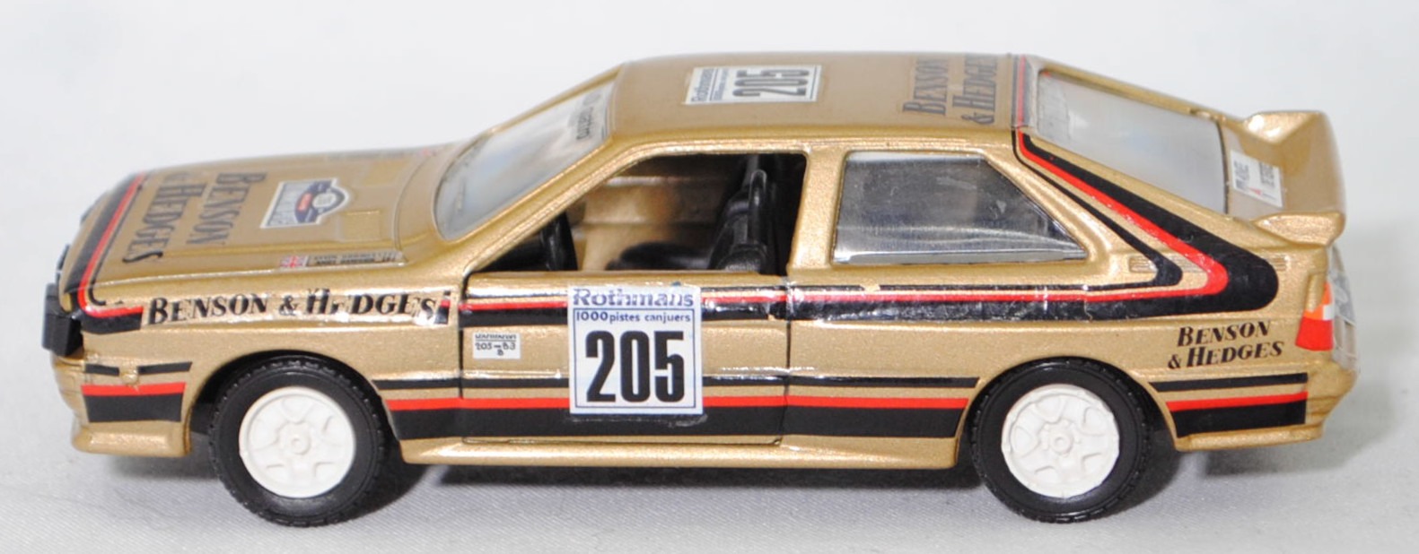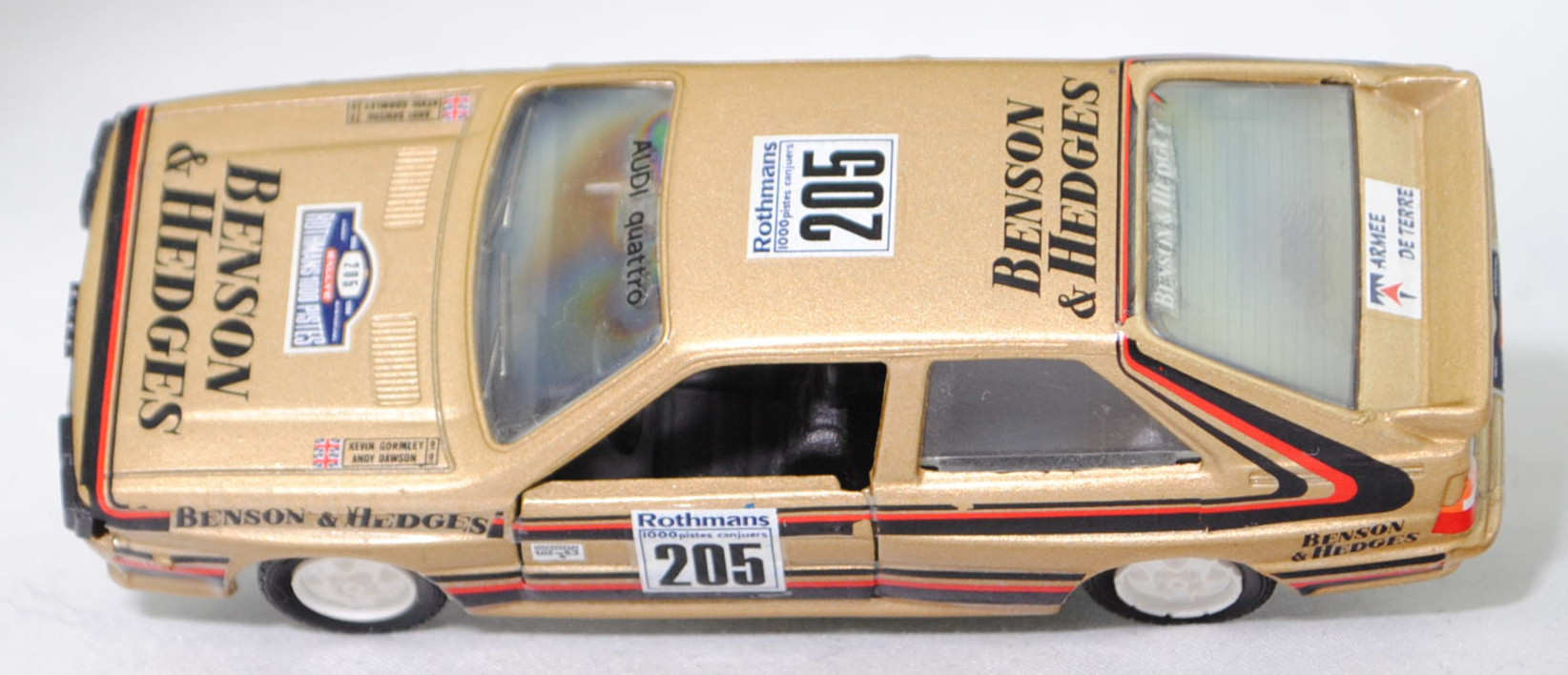 Audi quattro (1. Generation, Baureihe quattro, interne Baureihenbezeichnung B2, Typ 85Q, zweitüriger Sportwagen als Coupé mit 5 Sitzplätzen, VFL (Vorfacelift), versenkte Doppel-Halogen-Rechteckscheinwerfer mit blanken Rechteckausschnitten, gerade stehender Kühlergrill, Heckleuchten orange/rot, Heckleuchtenband rot mit integrierter Nebelschlussleuchte, schwarzer Heckspoiler, Ausstattungslinie quattro: versenkte Doppel-Halogen-Rechteckscheinwerfer mit blanken Rechteckausschnitten + Scheinwerfer-Reinigungsanlage + großer integrierter Frontspoiler + blanke Zierleiste ober- und unterhalb des Kühlergrills + in Front- und Heckschürze integrierter kunststoffummantelter Stoßfänger + seitliche Zusatzblinkleuchte + abblendbarer Sicherheitsinnenspiegel + klapp- und schwenkbare Sonnenblenden mit beleuchtetem Make-up-Spiegel auf der Beifahrerseite + abschließbarer Ablagekasten auf der Beifahrerseite mit Beleuchtung + Zweistufenschaltung und Tipp-Wisch-Kontakt für Scheibenwischer + elektrische Scheibenwaschanlage + Mittelkonsole + Schalthebelknopf und -stulpe in Leder + Türablagekästen + lederbezogenes 4-Speichen-Sportlenkrad + Sportsitze vorne + Liegesitzeinrichtung für Fahrer und Beifahrer + verstellbare Rahmenkopfstützen für Vordersitze + ausgeformte Rücksitzbank mit im Kopfraumbereich angeformter Rücksitzlehne + Stoffsitzbezüge in Quattro-Velours + schwarze Tür- und Seitenfenster-Rahmen + doppelter umlaufender Dekostreifen + Heckspoiler + zwei Rückfahrleuchten + Nebelschlußleuchte + Zierblende zwischen den Heckleuchten + rotes Leuchtband mit Schriftzug COUPÉ zwischen den Heckleuchten + Edelstahl-Auspuffanlage mit Doppelendrohr + Leichtmetallräder, vollsynchronisiertes 5-Gang-Schaltgetriebe als Mittelschaltung, permanenter Allradantrieb quattro®, Motor: Audi Typ VW EA828 wassergekühlter Fünfzylinder-Reihen-Viertakt-Otto mit KKK (Kühnle, Kopp & Kausch AG Frankenthal) K26 Abgas-Turbolader und mechanischer Einspritzanlage sowie eine obenliegende Nockenwelle (OHC = Overhead Camshaft) und 2 Ventile pro Zylinder sowie Ladeluftkühler und 2144 cm³ sowie 200 PS, Motorkennbuchstabe WR, Radstand 2524 mm, Länge 4404 mm, Modell 1980-1982, Baujahr 1981) Rallye, goldmetallic, innen schwarz, Sitze schwarz, Lenkrad schwarz, Aufkleber BENSON & HEDGES in schwarz vorne und hinten auf den Kotflügeln, Aufkleber Schild mit Startnummer 205 und Klasse B3 in schwarz auf Rechteck in reinweiß und Rallyeschild Rothmans / 1000 pistes canjuers / 205 in schwarz auf Quadrat in reinweiß auf den Türen, Aufkleber Rallyeschild in reinweiß/gold/stahlblau/verkehrsrot mit der Startnummer 205 in schwarz und 1986 / RALLYE / ROTHMANS 1000 PISTES in reinweiß sowie BENSON / & HEDGES in schwarz von vorne aus lesbar mittig auf der Motorhaube, Aufkleber Andy Dawson / Kevin Gormley in schwarz mit Flagge Union Jack in stahlblau/verkehrsrot/reinweiß oben auf den Außenseiten auf der Motorhaube, Rallyeschild Rothmans / 1000 pistes canjuers / 205 in schwarz auf Quadrat in reinweiß und BENSON / & HEDGES in schwarz jeweils von hinten aus lesbar auf dem Dach, Aufkleber Logo in stahlblau/verkehrsrot und ARMEE / DE TERRE in stahlblau auf Rechteck in reinweiß oben auf der Heckklappe, Aufkleber BENSON & HEDGES in schwarz hinten oben auf der Heckklappe, Aufkleber Rallyeschild in reinweiß/gold/stahlblau/verkehrsrot mit der Startnummer 205 in schwarz und 1986 / RALLYE / ROTHMANS 1000 PISTES in reinweiß hinten auf dem Stoßfänger, Aufkleber Nummernschild YKX 9X in schwarz auf reinweiß vorne und in schwarz auf verkehrsgelb hinten, Aufkleber Audi quattro in schwarz oben auf der Windschutzscheibe, Aufkleber BENSON & HEDGES in reinweiß oben auf der Heckscheibe, Aufkleber Streifen in verkehrsrot/schwarz unten auf den Seiten und hinten sowie auf Höhe der Gürtellinie auf den Seiten und über die Motorhaube sowie der C-Säule und dem Dach, Design wie beim Original Audi quattro A2 Gruppe B (Homologationsnummer B-243 vom 01.05.1983) bei der 11. Rallye des 1000 Pistes 1986 (04. bis 06. Juli 1986, Länge aller Wertungsprüfungen (WP's): 157,70 km) mit Fahrer Andy Dawson / Kevin Gormley (Ausfall auf WP7 von 10 mit Schaden an der Aufhängung) für das Team BENSON & HEDGES und der Startnummer 205 sowie dem Nummernschild YKX 9X, Fuchs Schmiede-LM-Räder mit 5 Speichen und MICHELIN-Reifen (Serie: Audi Leichtmetallräder im 16-Speichen-Design (Hersteller RONAL) Größe 6 J x 15 H2 ET 45 mit Lochkreis 5 x 112 (Teilenummer 437 601 025 C) und Nabendeckel / Radzierkappe (58 mm, Teilenummer 841 601 165) sowie Reifen 205/60 VR 15), VEREM, 1:43, m (Vitrinenmodell, Aufkleber mit minimalen Fehlern) (EAN 3467300007257)