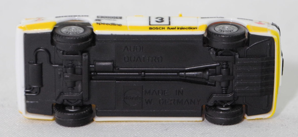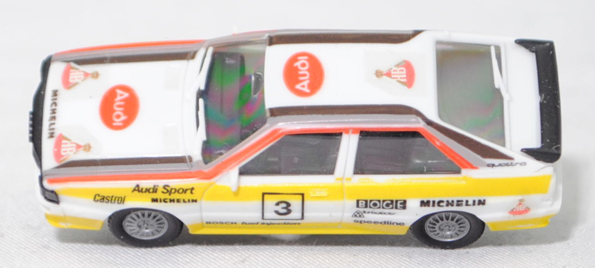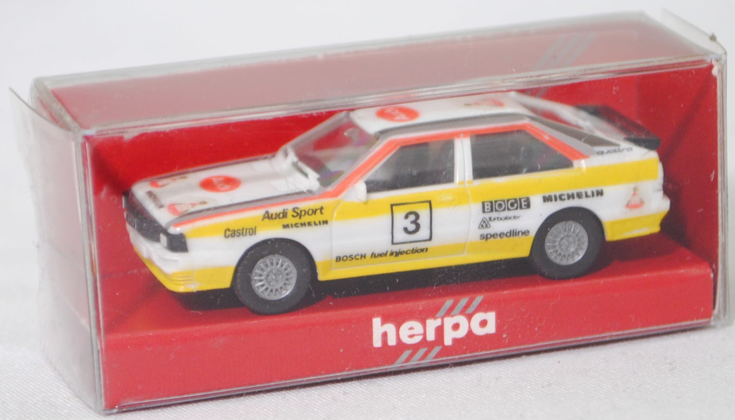 Audi quattro (1. Generation, Baureihe quattro, interne Baureihenbezeichnung B2, Typ 85Q, zweitüriger Sportwagen als Coupé mit 5 Sitzplätzen, VFL (Vorfacelift), versenkte Doppel-Halogen-Rechteckscheinwerfer mit blanken Rechteckausschnitten, gerade stehender Kühlergrill, Heckleuchten orange/rot, Heckleuchtenband rot mit integrierter Nebelschlussleuchte, schwarzer Heckspoiler, Ausstattungslinie quattro: versenkte Doppel-Halogen-Rechteckscheinwerfer mit blanken Rechteckausschnitten + Scheinwerfer-Reinigungsanlage + großer integrierter Frontspoiler + blanke Zierleiste ober- und unterhalb des Kühlergrills + in Front- und Heckschürze integrierter kunststoffummantelter Stoßfänger + seitliche Zusatzblinkleuchte + abblendbarer Sicherheitsinnenspiegel + klapp- und schwenkbare Sonnenblenden mit beleuchtetem Make-up-Spiegel auf der Beifahrerseite + abschließbarer Ablagekasten auf der Beifahrerseite mit Beleuchtung + Zweistufenschaltung und Tipp-Wisch-Kontakt für Scheibenwischer + elektrische Scheibenwaschanlage + Mittelkonsole + Schalthebelknopf und -stulpe in Leder + Türablagekästen + lederbezogenes 4-Speichen-Sportlenkrad + Sportsitze vorne + Liegesitzeinrichtung für Fahrer und Beifahrer + verstellbare Rahmenkopfstützen für Vordersitze + ausgeformte Rücksitzbank mit im Kopfraumbereich angeformter Rücksitzlehne + Stoffsitzbezüge in Quattro-Velours + schwarze Tür- und Seitenfenster-Rahmen + doppelter umlaufender Dekostreifen + Heckspoiler + zwei Rückfahrleuchten + Nebelschlußleuchte + Zierblende zwischen den Heckleuchten + rotes Leuchtband mit Schriftzug COUPÉ zwischen den Heckleuchten + Edelstahl-Auspuffanlage mit Doppelendrohr + Leichtmetallräder, vollsynchronisiertes 5-Gang-Schaltgetriebe als Mittelschaltung, permanenter Allradantrieb quattro®, Motor: Audi Typ VW EA828 wassergekühlter Fünfzylinder-Reihen-Viertakt-Otto mit KKK (Kühnle, Kopp & Kausch AG Frankenthal) K26 Abgas-Turbolader und mechanischer Einspritzanlage sowie eine obenliegende Nockenwelle (OHC = Overhead Camshaft) und 2 Ventile pro Zylinder sowie Ladeluftkühler und 2144 cm³ sowie 200 PS, Motorkennbuchstabe WR, Radstand 2524 mm, Länge 4404 mm, Modell 1980-1982) Rallye, alpinweiß (Verkaufskennzeichen P1, Farbcode L90E), innen schwarz, Sitze schwarz, Lenkrad schwarz, Druck Streifen in zinkgelb auf Höhe der Gürtellinie auf den Seiten sowie unten auf den Seiten und vorne, Druck Audi Sport / Castrol / MICHELIN / 3 / BOSCH fuel injection / BOGE / KKK Turbolader / speedline / MICHELIN in schwarz auf den Seiten, Druck durchgehende Streifen in Audi Sport Farben blutorange (RAL 2002) / telegrau (RAL 7045) / graubraun (RAL 8019) oben auf den Seiten der Motorhaube über die A-Säule und dem Dach zur C-Säule, Druck Ellipse in blutorange mittig auf der Motorhaube wobei Audi von vorne aus lesbar in Wagenfarbe durchschimmert, zusätzlicher Druck MICHELIN in schwarz von vorne aus lesbar mittig vorne auf der Motorhaube, Druck Ellipse in blutorange vorne mittig auf dem Dach wobei Audi von hinten aus lesbar in Wagenfarbe durchschimmert, Design wie beim Original Audi quattro A2 Gruppe B (Homologationsnummer B-243 vom 01.05.1983) bei diversen Rallyes der FIA-Rallye-Weltmeisterschaft 1984 mit Fahrer Michèle Mouton / Fabrizia Pons (Schweden, IN-NV 3 / Safari, IN-YJ 81) bzw. Stig Blomqvist / Björn Cederberg (Neuseeland, IN-NJ 5 / 1000 Seen, IN-NJ 5) oder Hannu Mikkola / Arne Hertz (Elfenbeinküste, IN-NX 42) für das Team HB Audi Sport und der Startnummer 3 sowie verschiedenen Nummernschildern, Audi Leichtmetallräder im 16-Speichen-Design (Hersteller RONAL) Größe 6 J x 15 H2 ET 45 mit Lochkreis 5 x 112 (Teilenummer 437 601 025 C) und Nabendeckel / Radzierkappe (58 mm, Teilenummer 841 601 165) sowie Reifen 205/60 VR 15, ohne Beilage, Herpa, 1:87, mb (Vitrinenmodell, Decal HB hinten auf den Kofflügeln sowie auf der Motorhaube und dem Dach angebracht, Schachtel mit Lagerspuren) (EAN 4013150035446)
