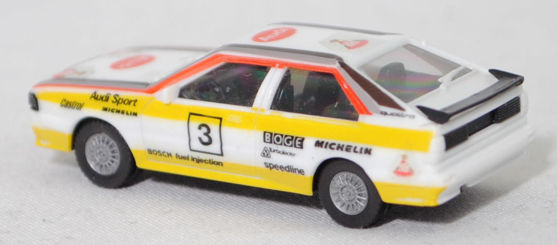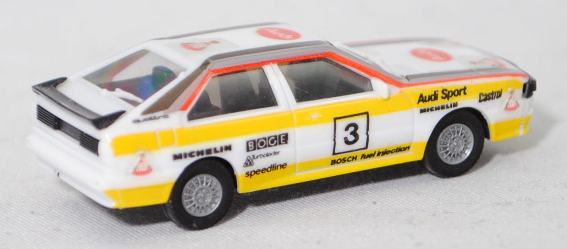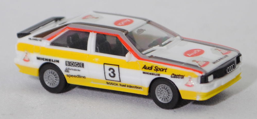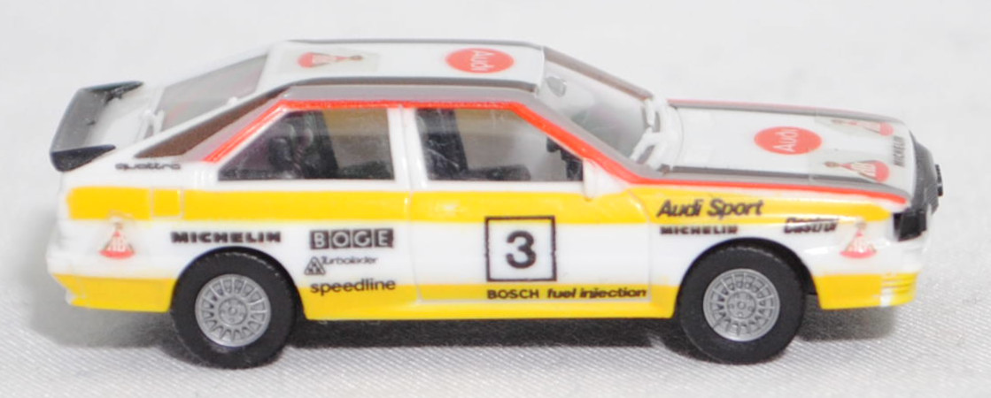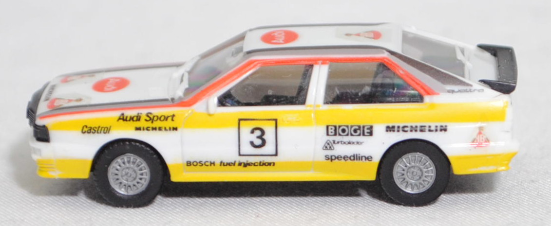 Audi quattro (B2, Typ 85Q, VFL (Vorfacelift), Modell 1980-1982) Rallye, alpinweiß (L90E), Design FIA-Rallye-Weltmeisterschaft 1984, Team HB Audi Sport, Nr. 3, Herpa, 1:87, mb