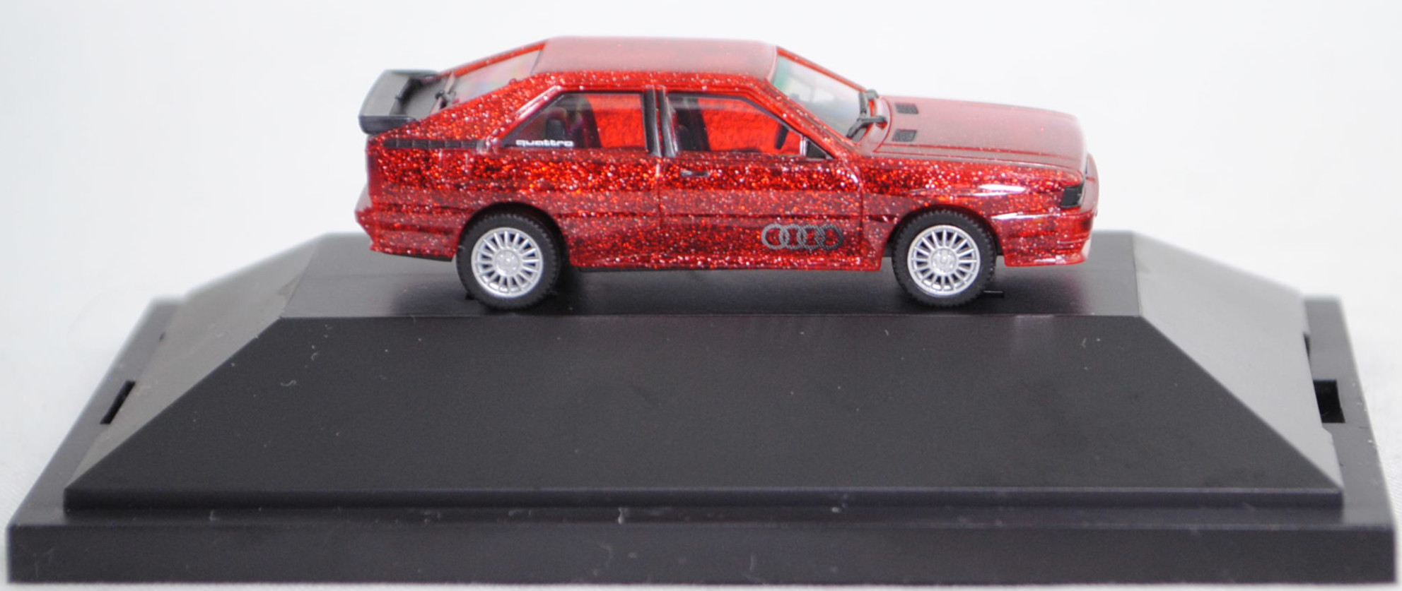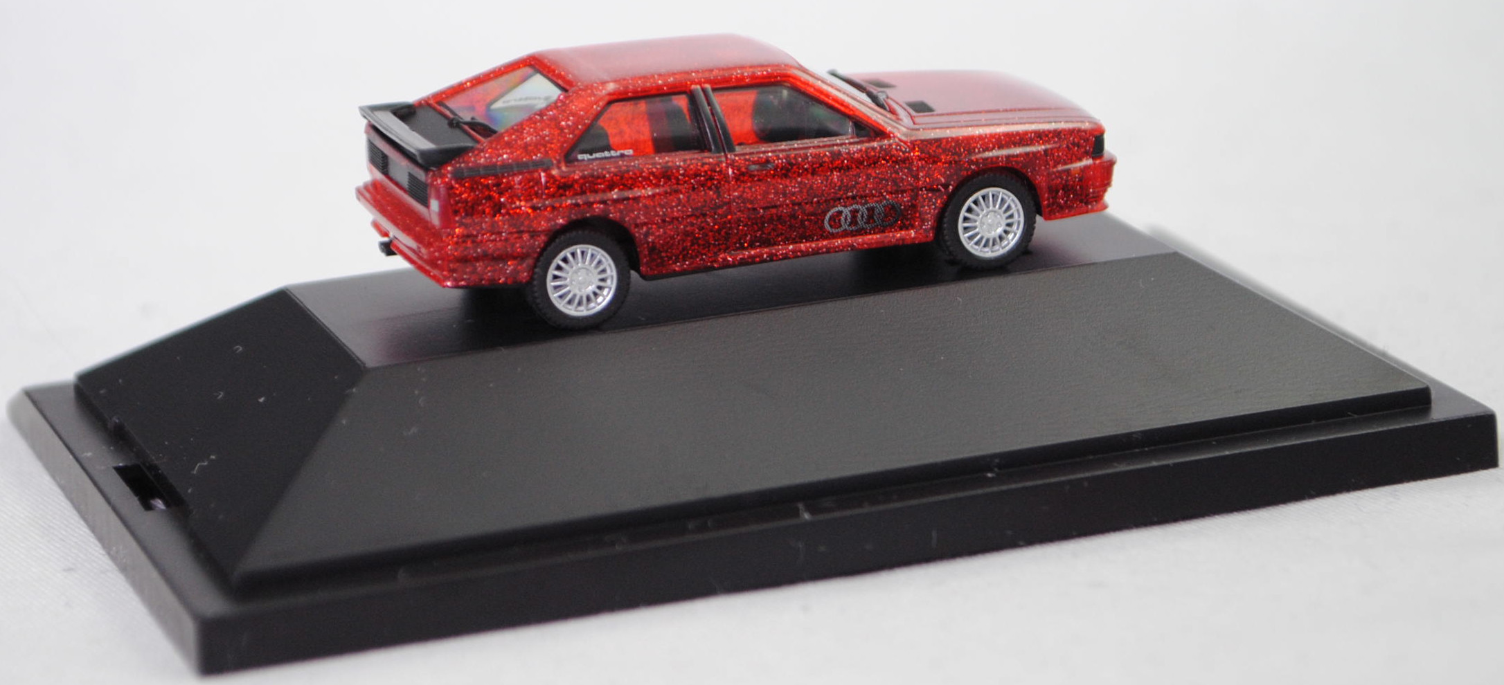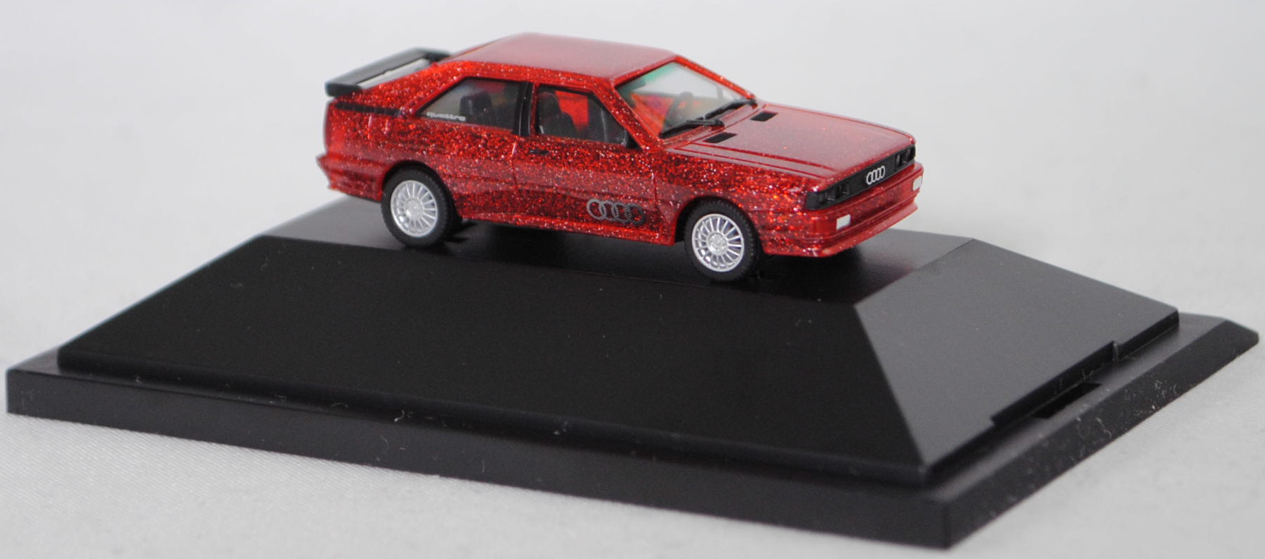 Audi quattro (1. Generation, Baureihe quattro, interne Baureihenbezeichnung B2, Typ 85Q, zweitüriger Sportwagen als Coupé mit 5 Sitzplätzen, VFL (Vorfacelift), versenkte Doppel-Halogen-Rechteckscheinwerfer mit blanken Rechteckausschnitten, gerade stehender Kühlergrill, Heckleuchten orange/rot, Heckleuchtenband rot mit integrierter Nebelschlussleuchte, schwarzer Heckspoiler, Ausstattungslinie quattro: versenkte Doppel-Halogen-Rechteckscheinwerfer mit blanken Rechteckausschnitten + Scheinwerfer-Reinigungsanlage + großer integrierter Frontspoiler + blanke Zierleiste ober- und unterhalb des Kühlergrills + in Front- und Heckschürze integrierter kunststoffummantelter Stoßfänger + seitliche Zusatzblinkleuchte + abblendbarer Sicherheitsinnenspiegel + klapp- und schwenkbare Sonnenblenden mit beleuchtetem Make-up-Spiegel auf der Beifahrerseite + abschließbarer Ablagekasten auf der Beifahrerseite mit Beleuchtung + Zweistufenschaltung und Tipp-Wisch-Kontakt für Scheibenwischer + elektrische Scheibenwaschanlage + Mittelkonsole + Schalthebelknopf und -stulpe in Leder + Türablagekästen + lederbezogenes 4-Speichen-Sportlenkrad + Sportsitze vorne + Liegesitzeinrichtung für Fahrer und Beifahrer + verstellbare Rahmenkopfstützen für Vordersitze + ausgeformte Rücksitzbank mit im Kopfraumbereich angeformter Rücksitzlehne + Stoffsitzbezüge in Quattro-Velours + schwarze Tür- und Seitenfenster-Rahmen + doppelter umlaufender Dekostreifen + Heckspoiler + zwei Rückfahrleuchten + Nebelschlußleuchte + Zierblende zwischen den Heckleuchten + rotes Leuchtband mit Schriftzug COUPÉ zwischen den Heckleuchten + Edelstahl-Auspuffanlage mit Doppelendrohr + Leichtmetallräder, vollsynchronisiertes 5-Gang-Schaltgetriebe als Mittelschaltung, permanenter Allradantrieb quattro®, Motor: Audi Typ VW EA828 wassergekühlter Fünfzylinder-Reihen-Viertakt-Otto mit KKK (Kühnle, Kopp & Kausch AG Frankenthal) K26 Abgas-Turbolader und mechanischer Einspritzanlage sowie eine obenliegende Nockenwelle (OHC = Overhead Camshaft) und 2 Ventile pro Zylinder sowie Ladeluftkühler und 2144 cm³ sowie 200 PS, Motorkennbuchstabe WR, Radstand 2524 mm, Länge 4404 mm, Modell 1980-1982), rot transparent glitzereffekt, innen schwarz, Sitze schwarz, Lenkrad schwarz, Druck Audi-Ringe unten auf den Türen, Druck quattro in reinweiß auf den hinteren Seitenscheiben, Audi Leichtmetallräder im 16-Speichen-Design (Hersteller RONAL) Größe 6 J x 15 H2 ET 45 mit Lochkreis 5 x 112 (Teilenummer 437 601 025 C) und Nabendeckel / Radzierkappe (58 mm, Teilenummer 841 601 165) sowie Reifen 205/60 VR 15, Herpa, 1:87, PC-Box (Limited Edition zum 14.Herpa Sommerfest vom 08. bis 09. Juli 2006 auf dem Herpa-Werksgelände Leonrodstraße 46-47 90599 Dietenhofen exclusiv für Mitglieder des Herpa Cars Club (HCC)) (Vitrinenmodell, Schachtel mit Lagerspuren) (EAN 4013150192965)