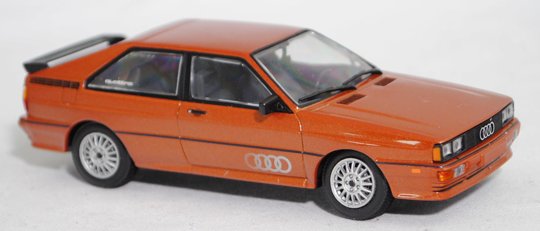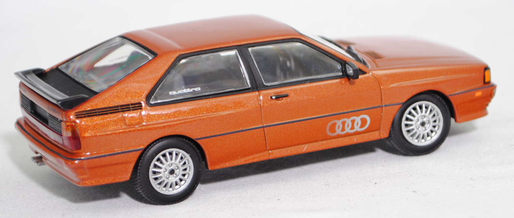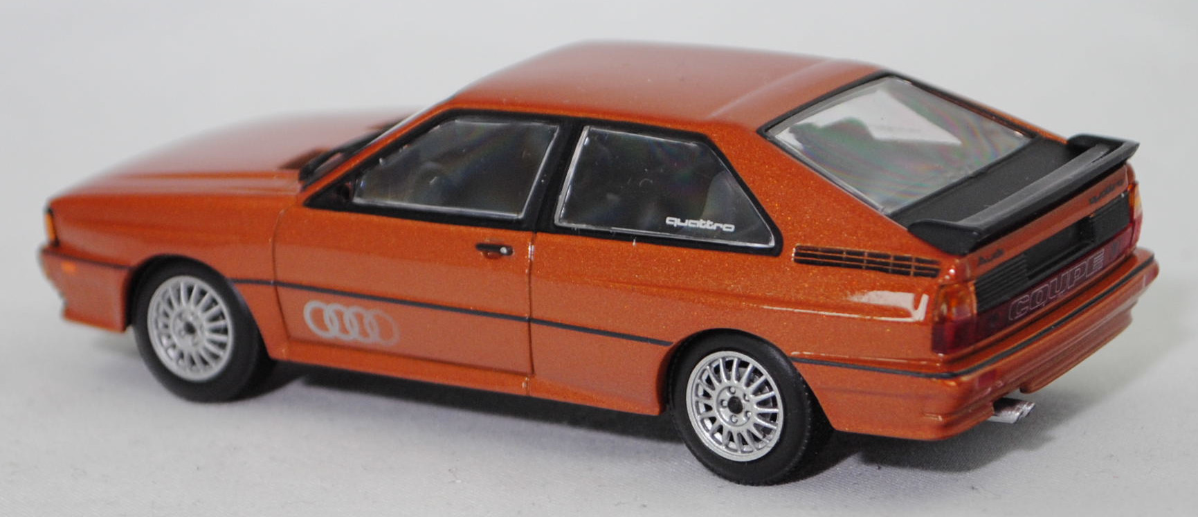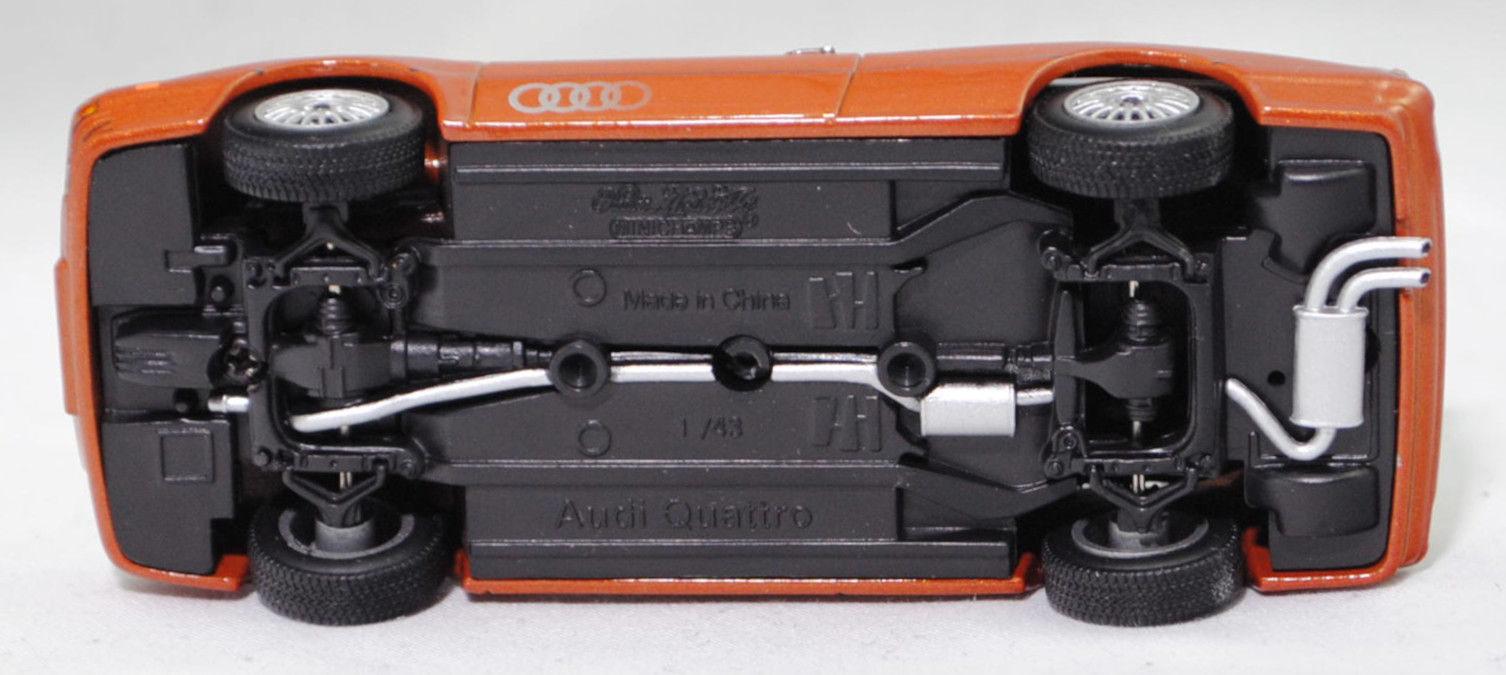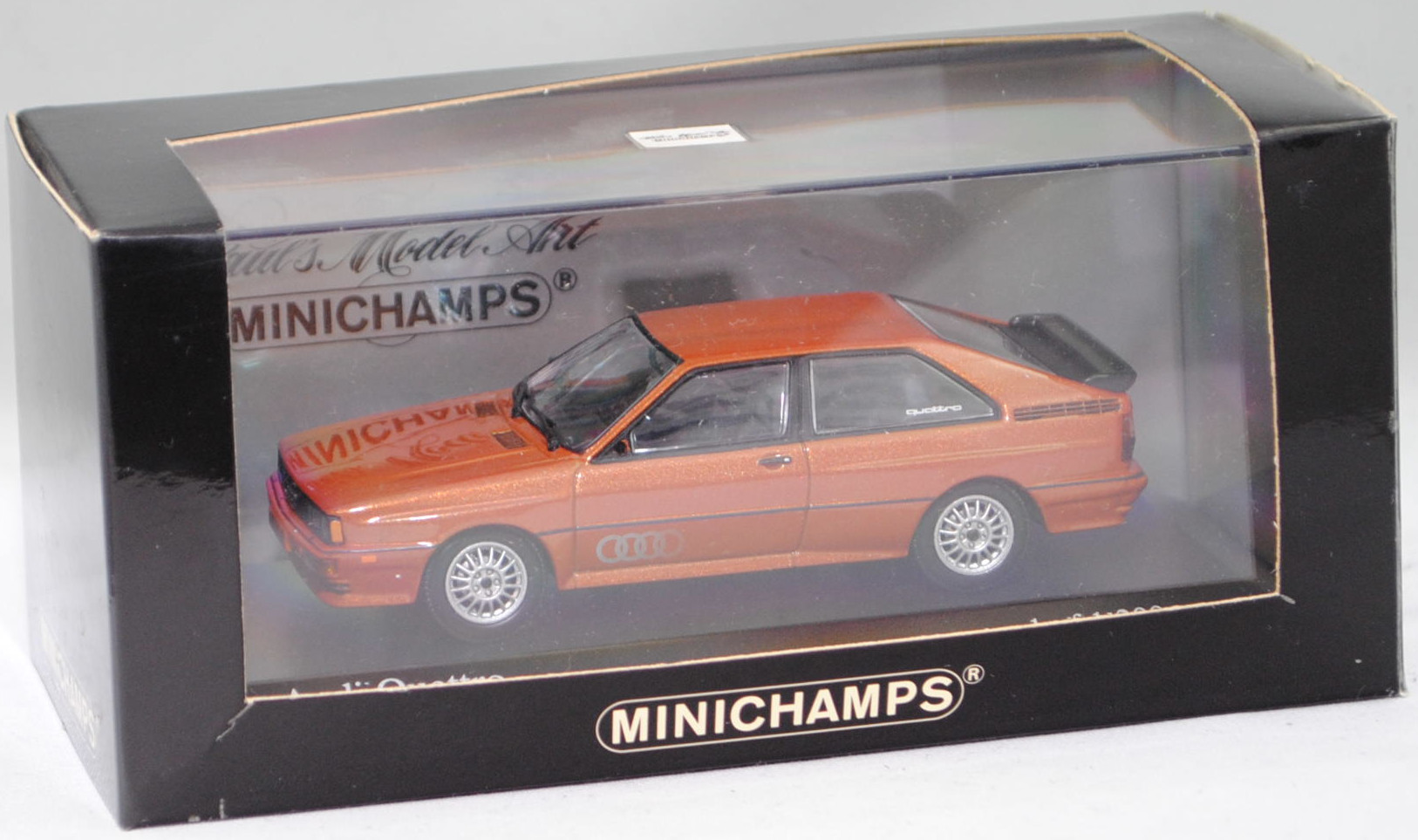 Audi quattro (1. Generation, Baureihe quattro, interne Baureihenbezeichnung B2, Typ 85Q, zweitüriger Sportwagen als Coupé mit 5 Sitzplätzen, VFL (Vorfacelift), versenkte Doppel-Halogen-Rechteckscheinwerfer mit blanken Rechteckausschnitten, gerade stehender Kühlergrill, Heckleuchten orange/rot, Heckleuchtenband rot mit integrierter Nebelschlussleuchte, schwarzer Heckspoiler, Ausstattungslinie quattro: versenkte Doppel-Halogen-Rechteckscheinwerfer mit blanken Rechteckausschnitten + Scheinwerfer-Reinigungsanlage + großer integrierter Frontspoiler + blanke Zierleiste ober- und unterhalb des Kühlergrills + in Front- und Heckschürze integrierter kunststoffummantelter Stoßfänger + seitliche Zusatzblinkleuchte + abblendbarer Sicherheitsinnenspiegel + klapp- und schwenkbare Sonnenblenden mit beleuchtetem Make-up-Spiegel auf der Beifahrerseite + abschließbarer Ablagekasten auf der Beifahrerseite mit Beleuchtung + Zweistufenschaltung und Tipp-Wisch-Kontakt für Scheibenwischer + elektrische Scheibenwaschanlage + Mittelkonsole + Schalthebelknopf und -stulpe in Leder + Türablagekästen + lederbezogenes 4-Speichen-Sportlenkrad + Sportsitze vorne + Liegesitzeinrichtung für Fahrer und Beifahrer + verstellbare Rahmenkopfstützen für Vordersitze + ausgeformte Rücksitzbank mit im Kopfraumbereich angeformter Rücksitzlehne + Stoffsitzbezüge in Quattro-Velours + schwarze Tür- und Seitenfenster-Rahmen + doppelter umlaufender Dekostreifen + Heckspoiler + zwei Rückfahrleuchten + Nebelschlußleuchte + Zierblende zwischen den Heckleuchten + rotes Leuchtband mit Schriftzug COUPÉ zwischen den Heckleuchten + Edelstahl-Auspuffanlage mit Doppelendrohr + Leichtmetallräder, vollsynchronisiertes 5-Gang-Schaltgetriebe als Mittelschaltung, permanenter Allradantrieb quattro®, Motor: Audi Typ VW EA828 wassergekühlter Fünfzylinder-Reihen-Viertakt-Otto mit KKK (Kühnle, Kopp & Kausch AG Frankenthal) K26 Abgas-Turbolader und mechanischer Einspritzanlage sowie eine obenliegende Nockenwelle (OHC = Overhead Camshaft) und 2 Ventile pro Zylinder sowie Ladeluftkühler und 2144 cm³ sowie 200 PS, Motorkennbuchstabe WR, Radstand 2524 mm, Länge 4404 mm, Modell 1980-1982, Baujahr 1981), zobelbraun metallic (Verkaufskennzeichen L4, Lacknummer LY8V), innen schwarz/basaltgrau (vgl. ähnlich Leder negro beim Original, Verkaufskennzeichen TK), Sitze basaltgrau (vgl. ähnlich Leder negro beim Original, Verkaufskennzeichen TK), Lenkrad schwarz, Audi Leichtmetallräder im 16-Speichen-Design (Hersteller RONAL) Größe 6 J x 15 H2 ET 45 mit Lochkreis 5 x 112 (Teilenummer 437 601 025 C) und Nabendeckel / Radzierkappe (58 mm, Teilenummer 841 601 165) sowie Reifen 205/60 VR 15, Minichamps, 1:43, PC-Box (Limited Edition 1200 pcs., Vitrinenmodell, Außenspiegel links fehlt, Modell kann nicht auf dem Sockel fixiert werden da kleine Ecke aus der Bodenplatte des Modelles abgebrochen ist und die Schraube nicht packt, Schachtel mit Lagerspuren) (EAN 4012138061583)