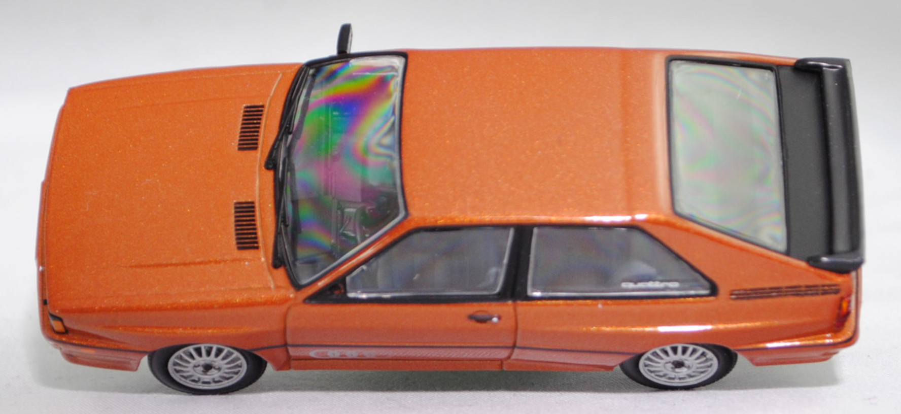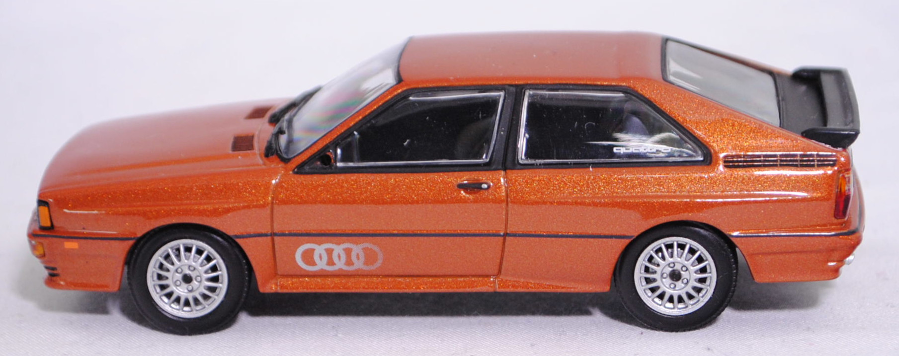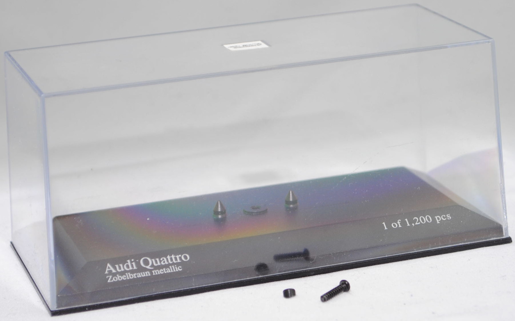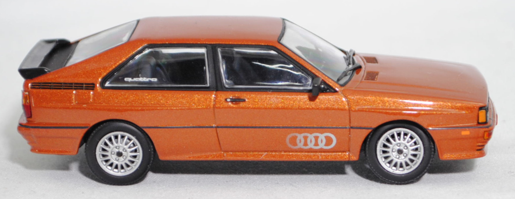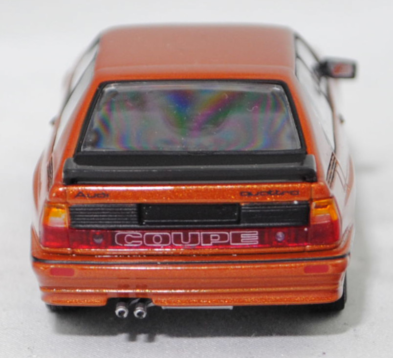 Audi quattro (1. Generation, Baureihe quattro, interne Baureihenbezeichnung B2, Typ 85Q, zweitüriger Sportwagen als Coupé mit 5 Sitzplätzen, VFL (Vorfacelift), versenkte Doppel-Halogen-Rechteckscheinwerfer mit blanken Rechteckausschnitten, gerade stehender Kühlergrill, Heckleuchten orange/rot, Heckleuchtenband rot mit integrierter Nebelschlussleuchte, schwarzer Heckspoiler, Ausstattungslinie quattro: versenkte Doppel-Halogen-Rechteckscheinwerfer mit blanken Rechteckausschnitten + Scheinwerfer-Reinigungsanlage + großer integrierter Frontspoiler + blanke Zierleiste ober- und unterhalb des Kühlergrills + in Front- und Heckschürze integrierter kunststoffummantelter Stoßfänger + seitliche Zusatzblinkleuchte + abblendbarer Sicherheitsinnenspiegel + klapp- und schwenkbare Sonnenblenden mit beleuchtetem Make-up-Spiegel auf der Beifahrerseite + abschließbarer Ablagekasten auf der Beifahrerseite mit Beleuchtung + Zweistufenschaltung und Tipp-Wisch-Kontakt für Scheibenwischer + elektrische Scheibenwaschanlage + Mittelkonsole + Schalthebelknopf und -stulpe in Leder + Türablagekästen + lederbezogenes 4-Speichen-Sportlenkrad + Sportsitze vorne + Liegesitzeinrichtung für Fahrer und Beifahrer + verstellbare Rahmenkopfstützen für Vordersitze + ausgeformte Rücksitzbank mit im Kopfraumbereich angeformter Rücksitzlehne + Stoffsitzbezüge in Quattro-Velours + schwarze Tür- und Seitenfenster-Rahmen + doppelter umlaufender Dekostreifen + Heckspoiler + zwei Rückfahrleuchten + Nebelschlußleuchte + Zierblende zwischen den Heckleuchten + rotes Leuchtband mit Schriftzug COUPÉ zwischen den Heckleuchten + Edelstahl-Auspuffanlage mit Doppelendrohr + Leichtmetallräder, vollsynchronisiertes 5-Gang-Schaltgetriebe als Mittelschaltung, permanenter Allradantrieb quattro®, Motor: Audi Typ VW EA828 wassergekühlter Fünfzylinder-Reihen-Viertakt-Otto mit KKK (Kühnle, Kopp & Kausch AG Frankenthal) K26 Abgas-Turbolader und mechanischer Einspritzanlage sowie eine obenliegende Nockenwelle (OHC = Overhead Camshaft) und 2 Ventile pro Zylinder sowie Ladeluftkühler und 2144 cm³ sowie 200 PS, Motorkennbuchstabe WR, Radstand 2524 mm, Länge 4404 mm, Modell 1980-1982, Baujahr 1981), zobelbraun metallic (Verkaufskennzeichen L4, Lacknummer LY8V), innen schwarz/basaltgrau (vgl. ähnlich Leder negro beim Original, Verkaufskennzeichen TK), Sitze basaltgrau (vgl. ähnlich Leder negro beim Original, Verkaufskennzeichen TK), Lenkrad schwarz, Audi Leichtmetallräder im 16-Speichen-Design (Hersteller RONAL) Größe 6 J x 15 H2 ET 45 mit Lochkreis 5 x 112 (Teilenummer 437 601 025 C) und Nabendeckel / Radzierkappe (58 mm, Teilenummer 841 601 165) sowie Reifen 205/60 VR 15, Minichamps, 1:43, PC-Box (Limited Edition 1200 pcs., Vitrinenmodell, Außenspiegel links fehlt, Modell kann nicht auf dem Sockel fixiert werden da kleine Ecke aus der Bodenplatte des Modelles abgebrochen ist und die Schraube nicht packt, Schachtel mit Lagerspuren) (EAN 4012138061583)