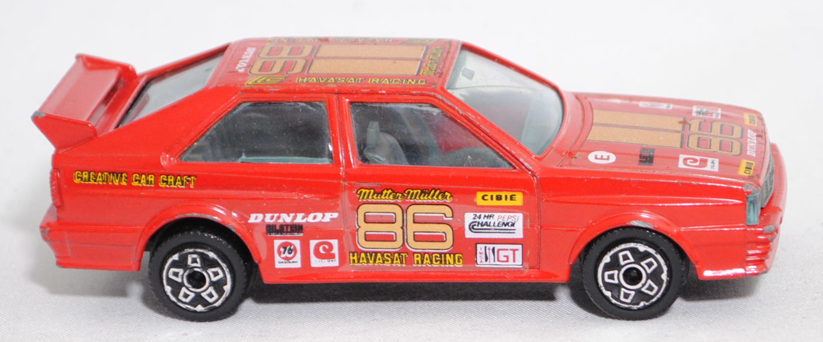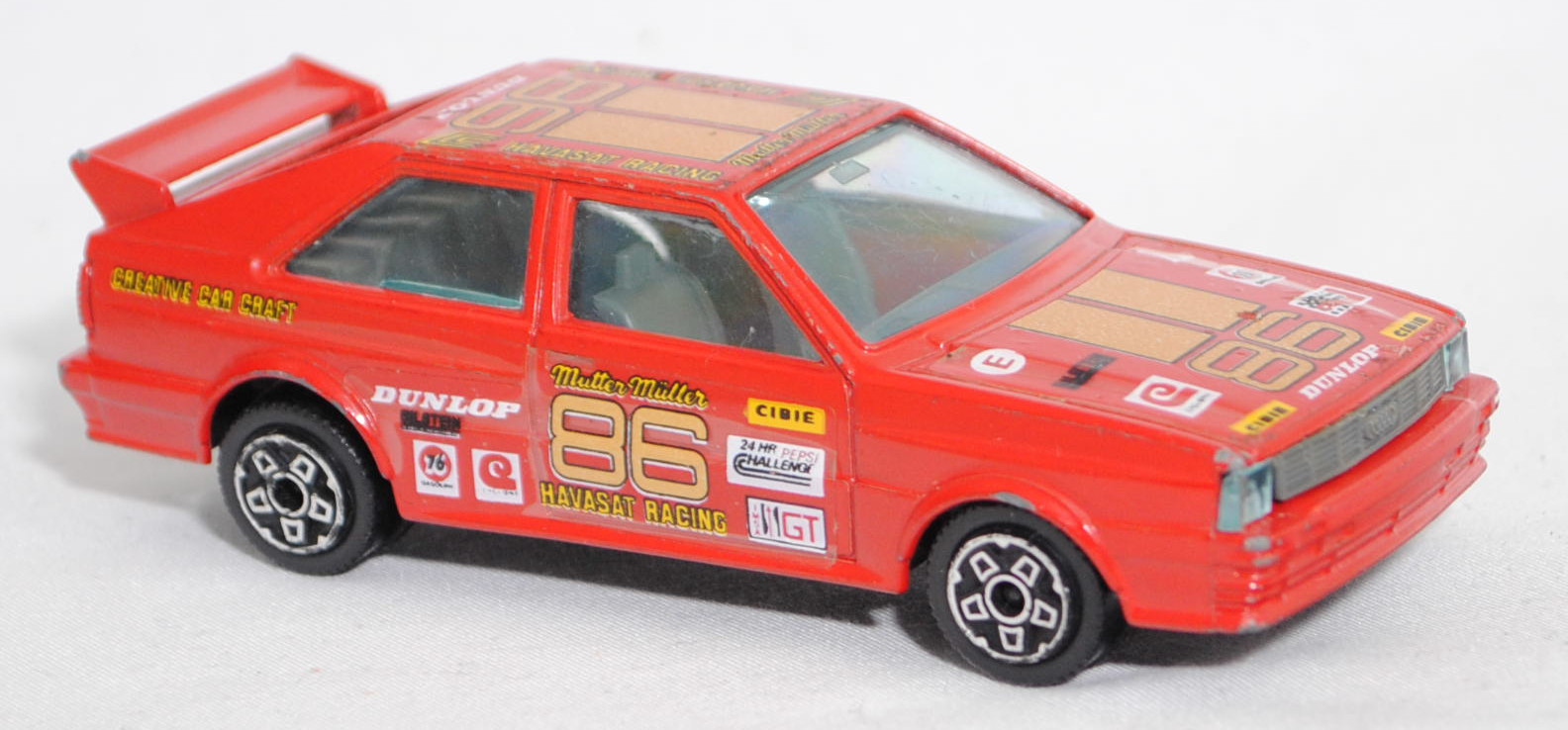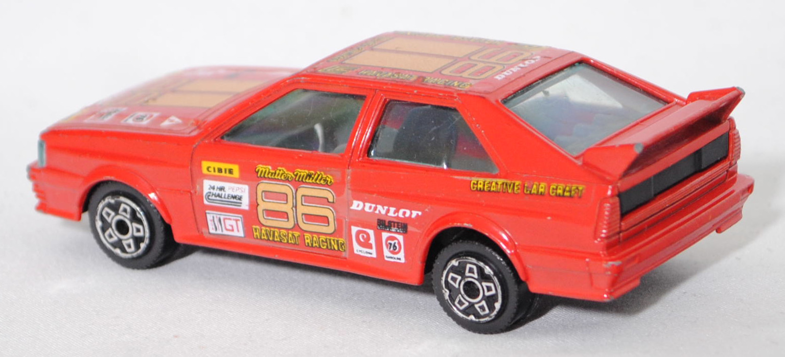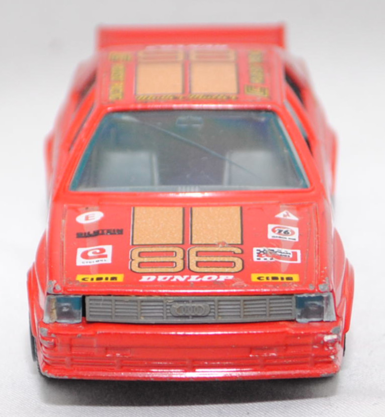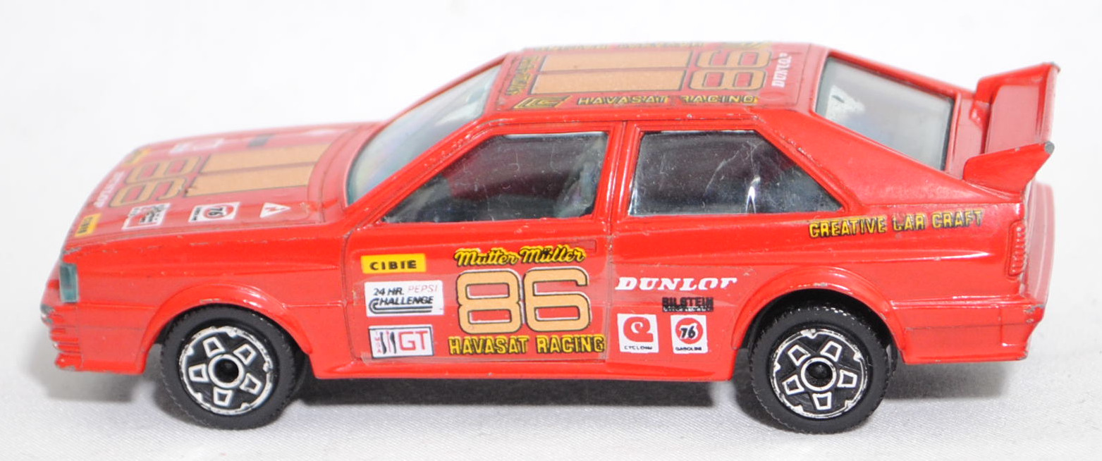 Audi quattro Gruppe 4 (1. Generation, Baureihe quattro, interne Baureihenbezeichnung B2, Typ 85Q, interne Bezeichnung als Rennwagen R1, zweitüriger Rennwagen als Sportcoupé mit 2 Sitzplätzen, Homologationsnummer 671 vom 01.01.1981, Ausstattungslinie quattro A2 Gruppe B: Karosserie aus Stahlblech + Matter Überrollkäfig + zusätzliche Radkastenverbreitungen + Kühlergrillverbreiterung und dadurch einfache Frontscheinwerfer nur außen + Kühlergrill mittig hervorstehend + Motorhaube und Kotflügel vorne sowie Verkleidungsteile aus Leichtmetall + 7 VDO Anzeigeninstrumente + Momo Lenkrad + Recaro Sitze + Sabelt Sicherheitsgurte + vergrößerter Heckspoiler + feuersicherer Kraftstofftank aus Kunststoff von Kleber mit 120 Liter Inhalt + Fuchs Schmiede-Leichtmetallräder im 5 Speichen-Design + Kleber Reifen, synchronisiertes 5-Gang-Schaltgeriebe mit Mittelschaltung, permanenter Allradantrieb quattro®, Motor: Audi Typ VW EA828 wassergekühlter Fünfzylinder-Reihen-Viertakt-Otto mit KKK (Kühnle, Kopp & Kausch AG Frankenthal) K26 Abgas-Turbolader und mechanische Bosch Einspritzanlage sowie eine obenliegende Nockenwelle (SOHC = Single Overhead Camshaft) und 2 Ventile pro Zylinder sowie Ladeluftkühler und 2144 cm³ sowie 320 PS, Motorkennbuchstabe WR, Radstand 2524 mm, Länge 4404 mm, Modell 1981-1982), verkehrsrot, innen schwarz, Sitze schwarz, Lenkrad schwarz, Startnummer 86, Sponsoren: CIBIE / 24 HR PEPSI CHALLENGE / IMSA GT / Mutter Müller HAVASAT RACING / DUNLOP / BILSTEIN / CYCLONE / 76 GASOLINE / CREATIVE CAR CRAFT, 5-Loch-Felgen in chrom (Fuchs Schmiede-LM-Räder mit 5 Speichen und Kleber Reifen), Bburago DIE CAST METAL, 1:43, m- (Vitrinenmodell, Windschutzscheibe mit Sprung, mit Lackfehler) (EAN 8002455041005)