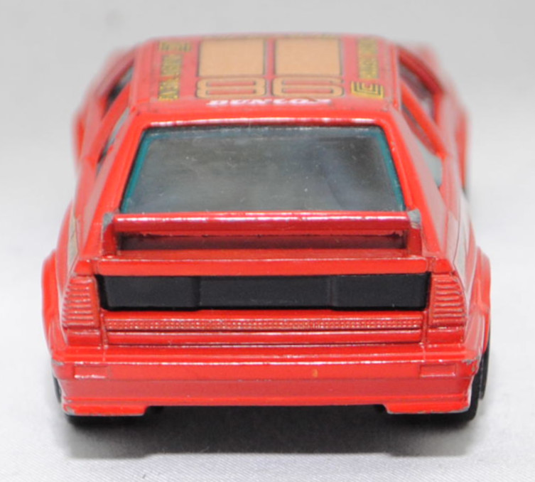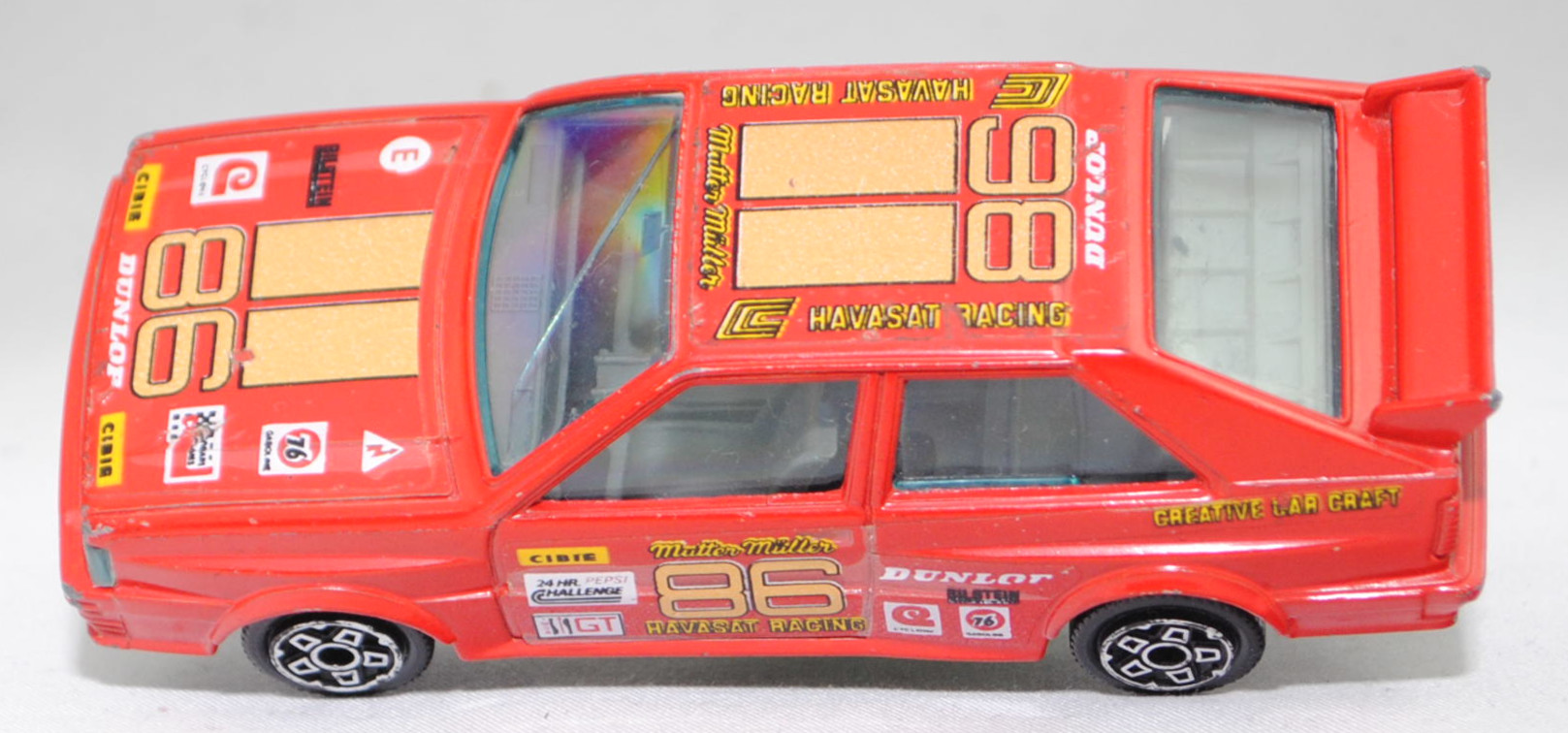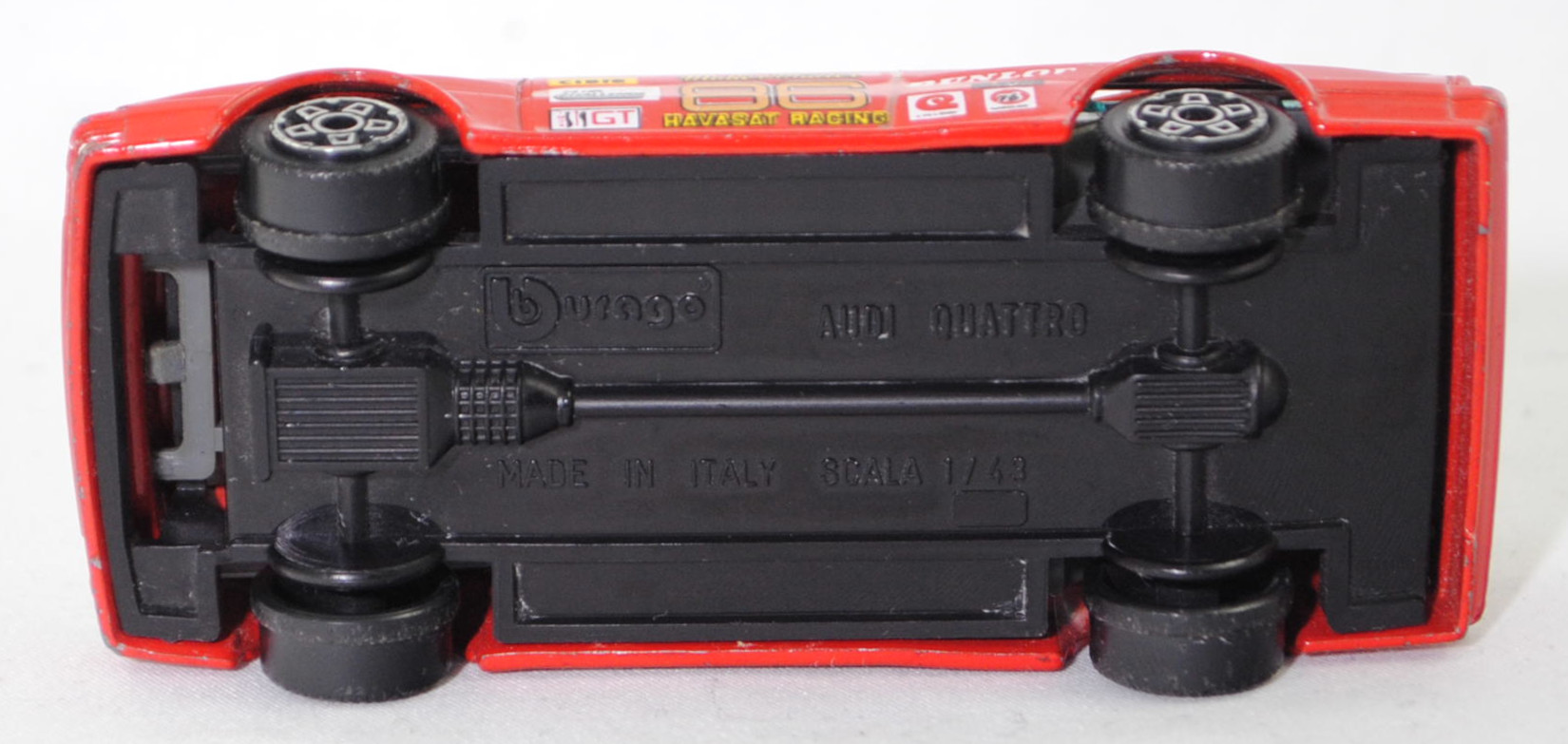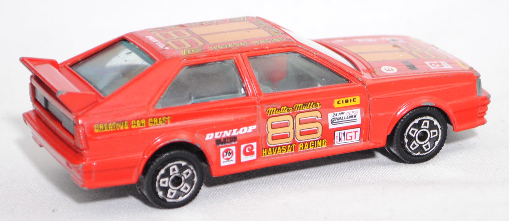 Audi quattro Gruppe 4 (1. Generation, Baureihe quattro, interne Baureihenbezeichnung B2, Typ 85Q, interne Bezeichnung als Rennwagen R1, zweitüriger Rennwagen als Sportcoupé mit 2 Sitzplätzen, Homologationsnummer 671 vom 01.01.1981, Ausstattungslinie quattro A2 Gruppe B: Karosserie aus Stahlblech + Matter Überrollkäfig + zusätzliche Radkastenverbreitungen + Kühlergrillverbreiterung und dadurch einfache Frontscheinwerfer nur außen + Kühlergrill mittig hervorstehend + Motorhaube und Kotflügel vorne sowie Verkleidungsteile aus Leichtmetall + 7 VDO Anzeigeninstrumente + Momo Lenkrad + Recaro Sitze + Sabelt Sicherheitsgurte + vergrößerter Heckspoiler + feuersicherer Kraftstofftank aus Kunststoff von Kleber mit 120 Liter Inhalt + Fuchs Schmiede-Leichtmetallräder im 5 Speichen-Design + Kleber Reifen, synchronisiertes 5-Gang-Schaltgeriebe mit Mittelschaltung, permanenter Allradantrieb quattro®, Motor: Audi Typ VW EA828 wassergekühlter Fünfzylinder-Reihen-Viertakt-Otto mit KKK (Kühnle, Kopp & Kausch AG Frankenthal) K26 Abgas-Turbolader und mechanische Bosch Einspritzanlage sowie eine obenliegende Nockenwelle (SOHC = Single Overhead Camshaft) und 2 Ventile pro Zylinder sowie Ladeluftkühler und 2144 cm³ sowie 320 PS, Motorkennbuchstabe WR, Radstand 2524 mm, Länge 4404 mm, Modell 1981-1982), verkehrsrot, innen schwarz, Sitze schwarz, Lenkrad schwarz, Startnummer 86, Sponsoren: CIBIE / 24 HR PEPSI CHALLENGE / IMSA GT / Mutter Müller HAVASAT RACING / DUNLOP / BILSTEIN / CYCLONE / 76 GASOLINE / CREATIVE CAR CRAFT, 5-Loch-Felgen in chrom (Fuchs Schmiede-LM-Räder mit 5 Speichen und Kleber Reifen), Bburago DIE CAST METAL, 1:43, m- (Vitrinenmodell, Windschutzscheibe mit Sprung, mit Lackfehler) (EAN 8002455041005)