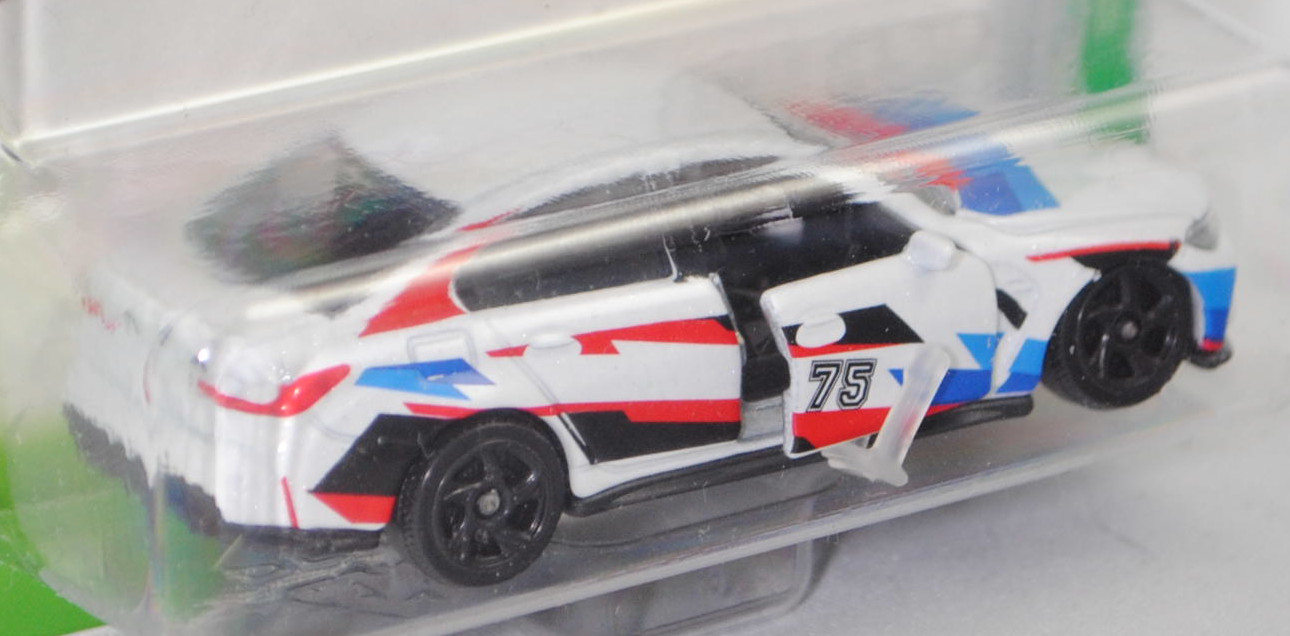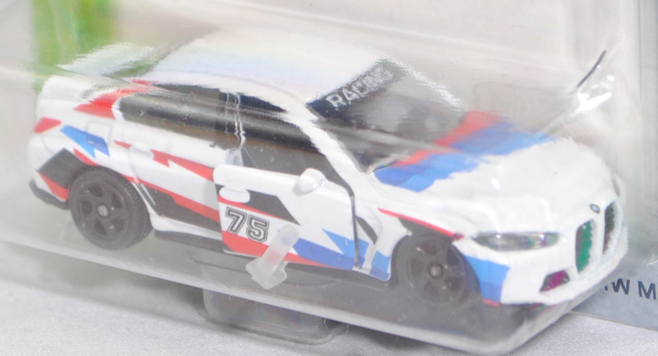 BMW M3 Limousine (6. Generation M3, G80, Modell 2021-) (Nr. 257G), weißmetallic, Streifen in rot/blau/schwarz und Nr. 75 auf den Seiten, majorette, 1:62, Blister (RACING CARS PREMIUM)
