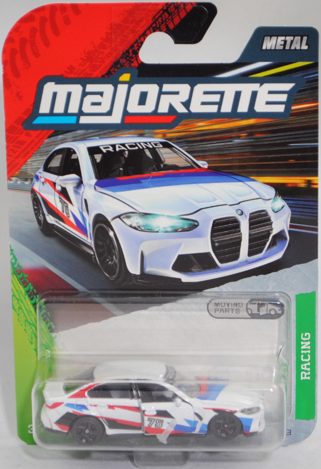 BMW M3 Limousine (6. Generation M3 bzw. 7. Generation 3er-Reihe, Baureihe M3, interne Baureihenbezeichnung G80, viertürige Sportlimousine mit Stufenheck und 5 Sitzplätzen, Ausstattungslinie M3 Limousine: LED-Scheinwerfer + M Leichtbaudach aus Carbon (CFK) in Sichtcarbon-Optik hochglänzend lackiert + M-Kieme in Seitenwand vorne in schwarz matt / schwarz hochglänzend mit Modellschriftzug in chrom + M Außenspiegel + M Servotronic + M Sportsitze mit Schalensitzcharakter und optisch integrierten Kopfstützen für Fahrer und Beifahrer + Interieurleisten schwarz hochglänzend mit Akzentleiste perlglanz chrom + Polsterung Leder Merino schwarz/schwarz + Innenspiegel automatisch abblendend + LED-Rückleuchten + adaptives M Fahrwerk + M Drive + M Sportdifferenzial + M Sportabgasanlage, Sonderausstattung gegen Mehrpreis: M Carbon Exterieurpaket mit Luftleitelemente im vorderen Stoßfänger und Außenspiegelkappen sowie Diffusoreinsatz im hinteren Stoßfänger und Heckspoiler aus kohlefaserverstärktem Kunststoff (CFK) + M Hochglanz Shadow Line mit erweiterten Umfängen mit Außenspiegelkappen und Gurney in schwarz hochglänzend sowie Auspuffendrohrblenden in schwarzchrom + 19''/20'' M Schmiederäder im Doppelspeiche 826 M-Design in schwarz / MB, manuelles 6-Gang-Schaltgetriebe, Hinterradantrieb, Motor: BMW M Typ S58B30O1 wassergekühlter Sechszylinder-Reihen-Viertakt-Otto mit zwei Single-Scroll-Abgasturbolader und Benzindirekteinspritzung sowie zwei obenliegende Nockenwellen (DOHC = Double Overhead Camshaft) und 4 Ventile pro Zylinder sowie Ladeluftkühlung und 2993 cm³ sowie 480 PS, Radstand 2857 mm, Länge 4794 mm, Modell 2021-) (Nr. 257G), Karosserie und Dach weißmetallic (vgl. BMW Individual frozen brillant white metallic beim Original, Farbcode W93), innen schwarz, Sitze schwarz, Lenkrad schwarz, Druck Streifen in verkehrsrot/himmelblau/ultramarinblau/schwarz und Startnummer 75 in schwarz auf den Seiten, Druck Streifen in verkehrsrot/himmelblau/ultramarinblau oben auf der Motorhaube, Druck RACING in reinweiß auf Streifen in schwarz oben auf der Windschutzscheibe, Heckspoiler weißmetallic, vordere Türen zu öffnen, 5-Speichen-Felgen schwarz (BMW 19''/20'' M Schmiederäder im 10-Doppelspeiche 826 M-Design in schwarz / MB vorne Größe 9,5 J x 19 H2 ET 20 mit Lochkreis 5 x 112 (Teilenummer 36108093838, Farbcode jack black uni) und Nabendeckel / Radzierkappe (Ø 55 mm, Teilenummer 36136850834, BMW-Logo in blau/weiß mit Chromrand) sowie Reifen 275/35 ZR 19 100Y bzw. hinten Größe 10,5 J x 20 H2 ET 20 mit Lochkreis 5 x 112 (Teilenummer 36108093839, Farbcode jack black uni) und Nabendeckel / Radzierkappe (Ø 55 mm, Teilenummer 36136850834, BMW-Logo in blau/weiß mit Chromrand) sowie Reifen 285/30 ZR 20 99Y), majorette, 1:62, Blister (RACING CARS PREMIUM) (EAN 3467452077368 / 3467452081709)